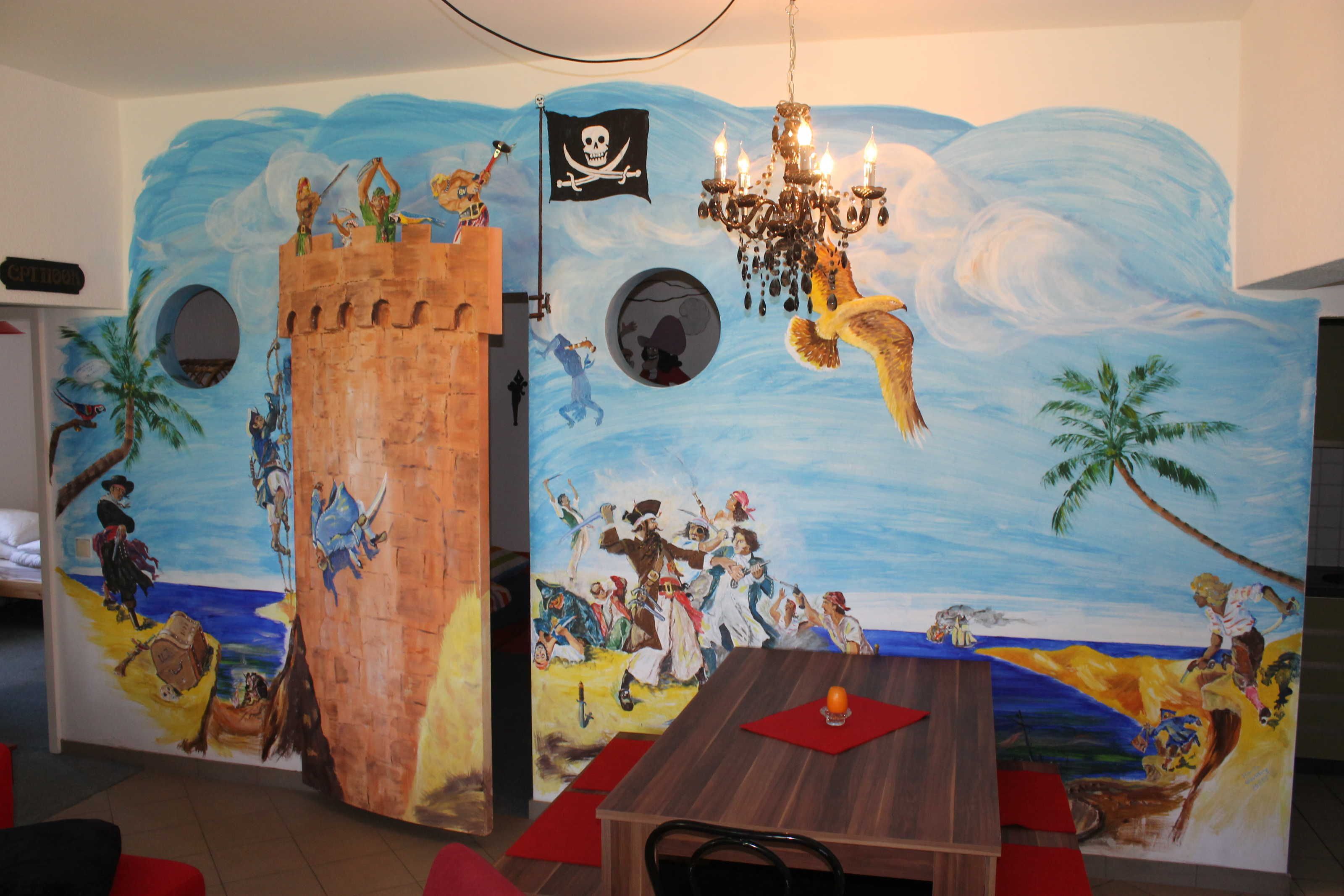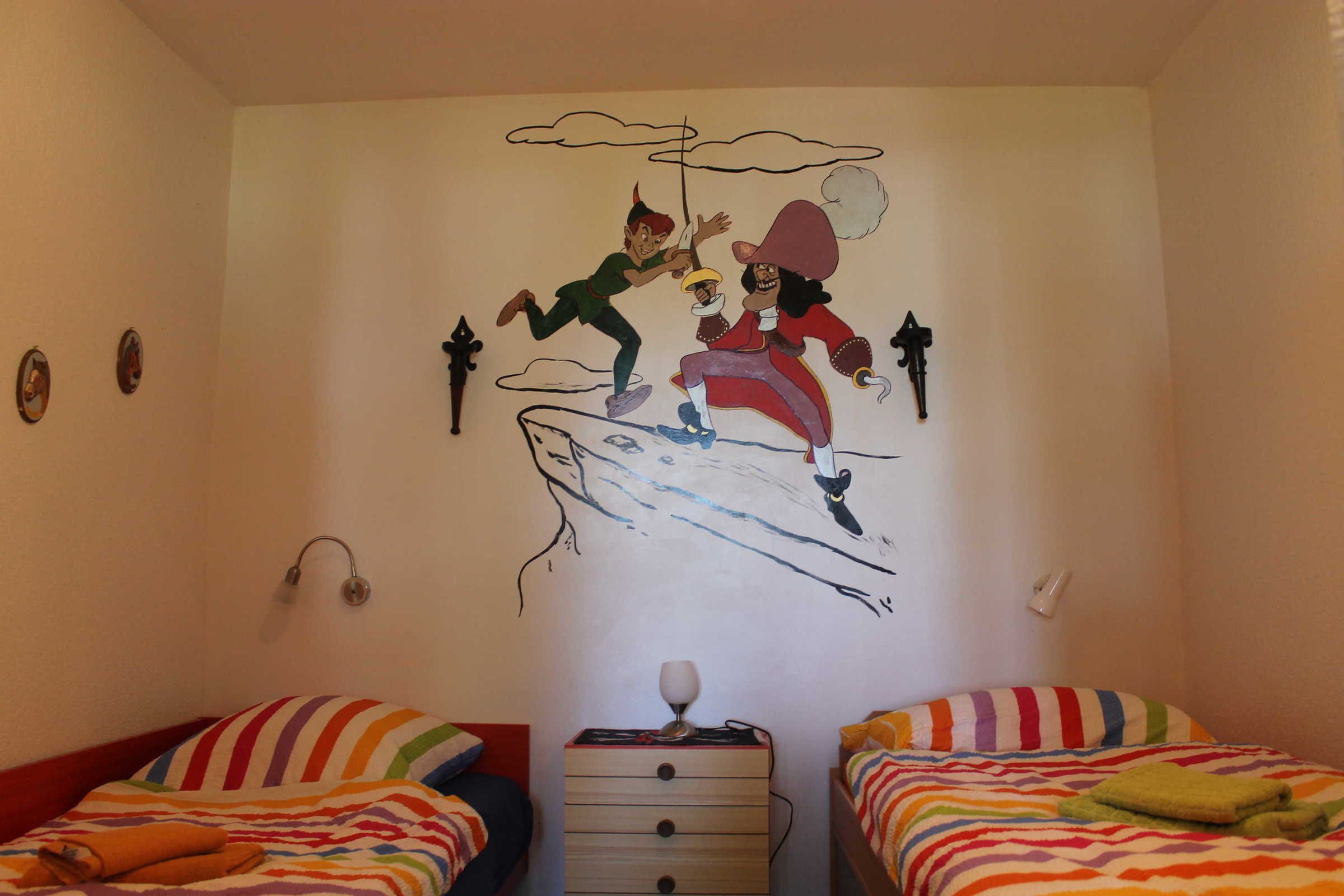 Tritt man in diese schöne 63m² Wohnung fällt der erste Blick direkt auf das Piratengemälde. Hinter dieser „beweglichen“ Wand verbirgt sich das eine der beiden Kinderzimmer mit 2 Einzelbetten. Das Elternschlaf- zimmer verfügt über ein Doppelbett, das dritte Schlafzimmer bietet ebenfalls 2 Einzelbetten. Von der Wohnungseigenen Terrasse blickt man direkt auf den Außenplatz. Im Duschbad mit Doppelwaschbecken kommen sich die Bewohner nicht in die Quere.
