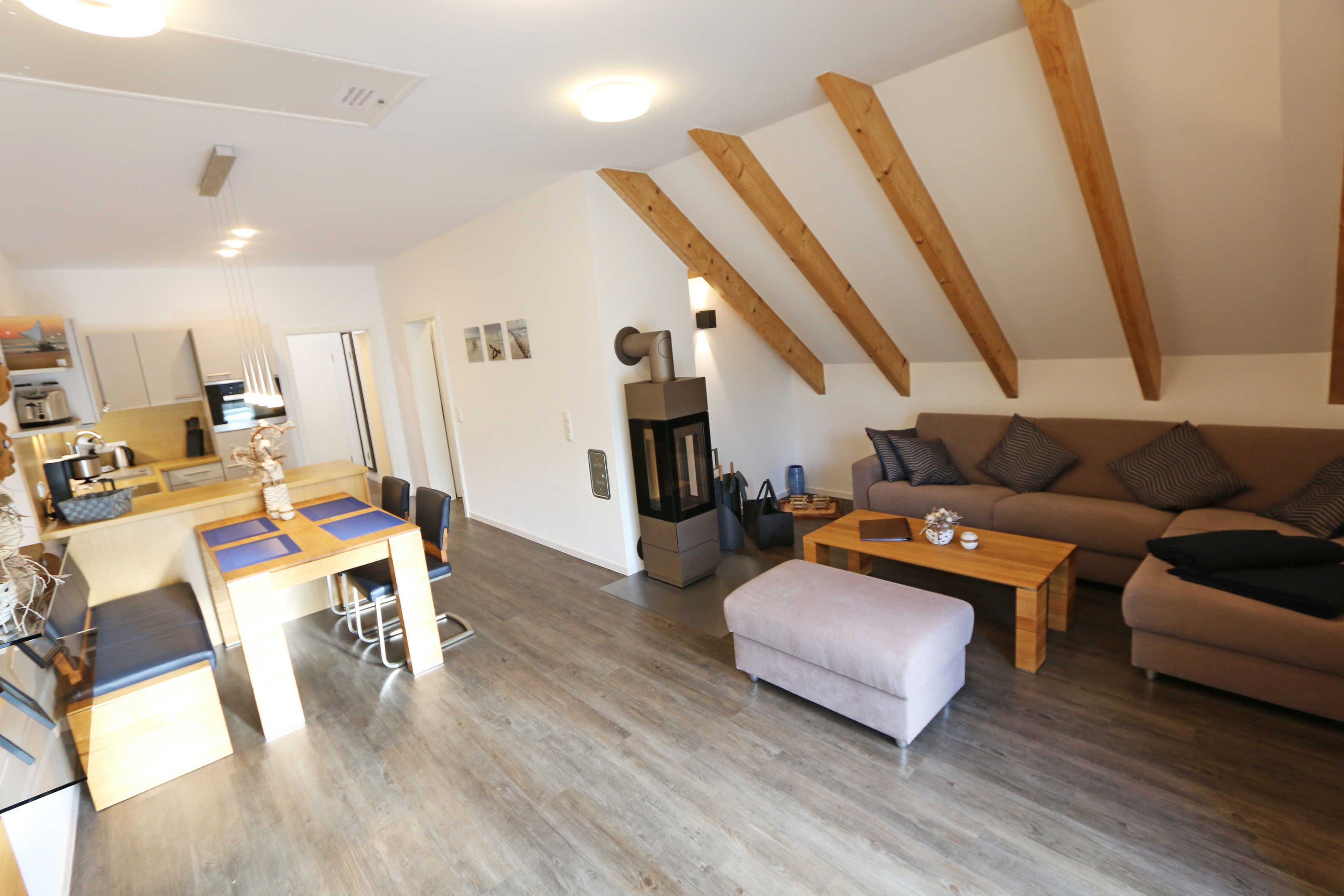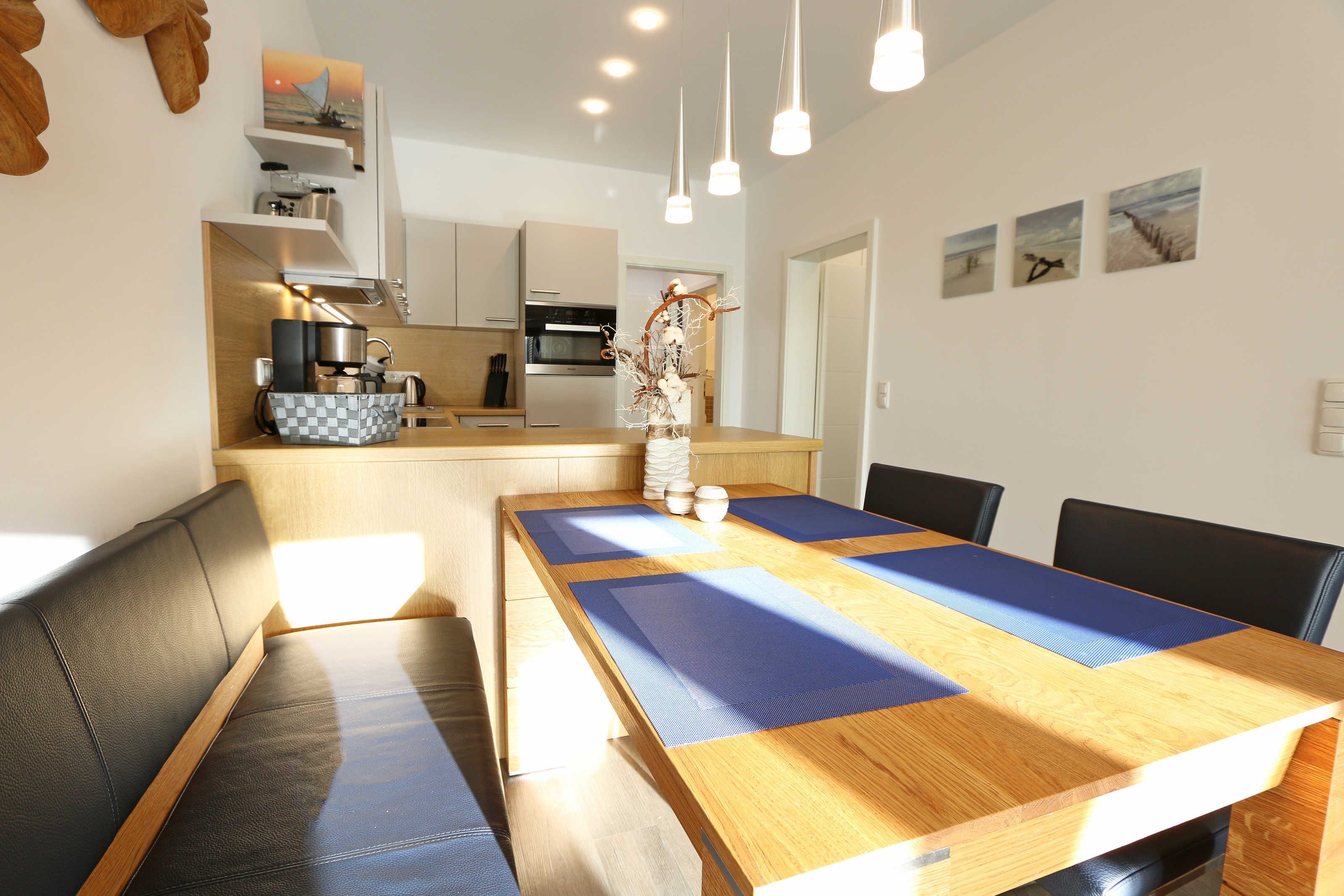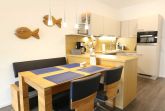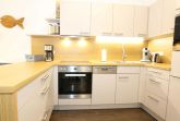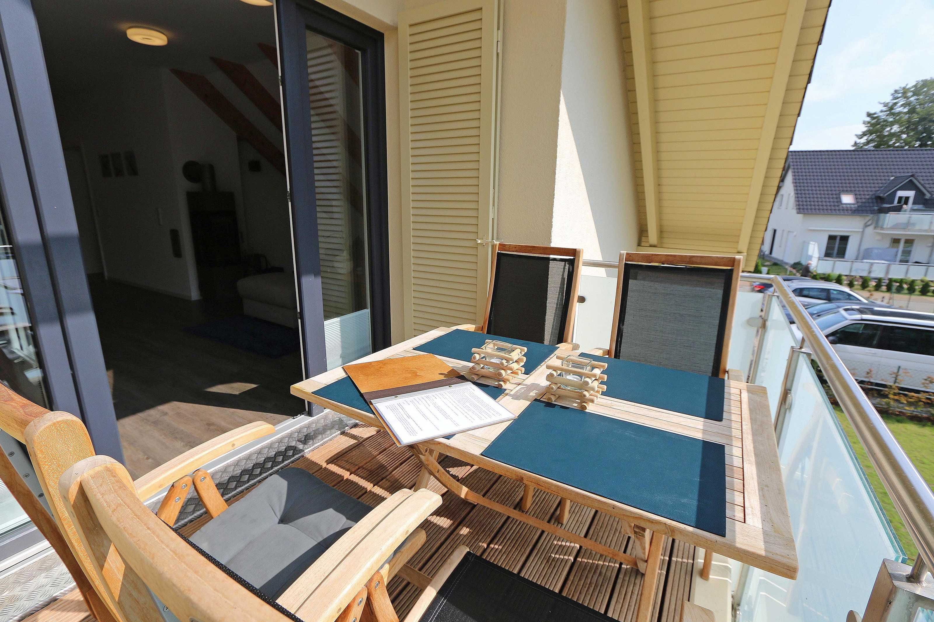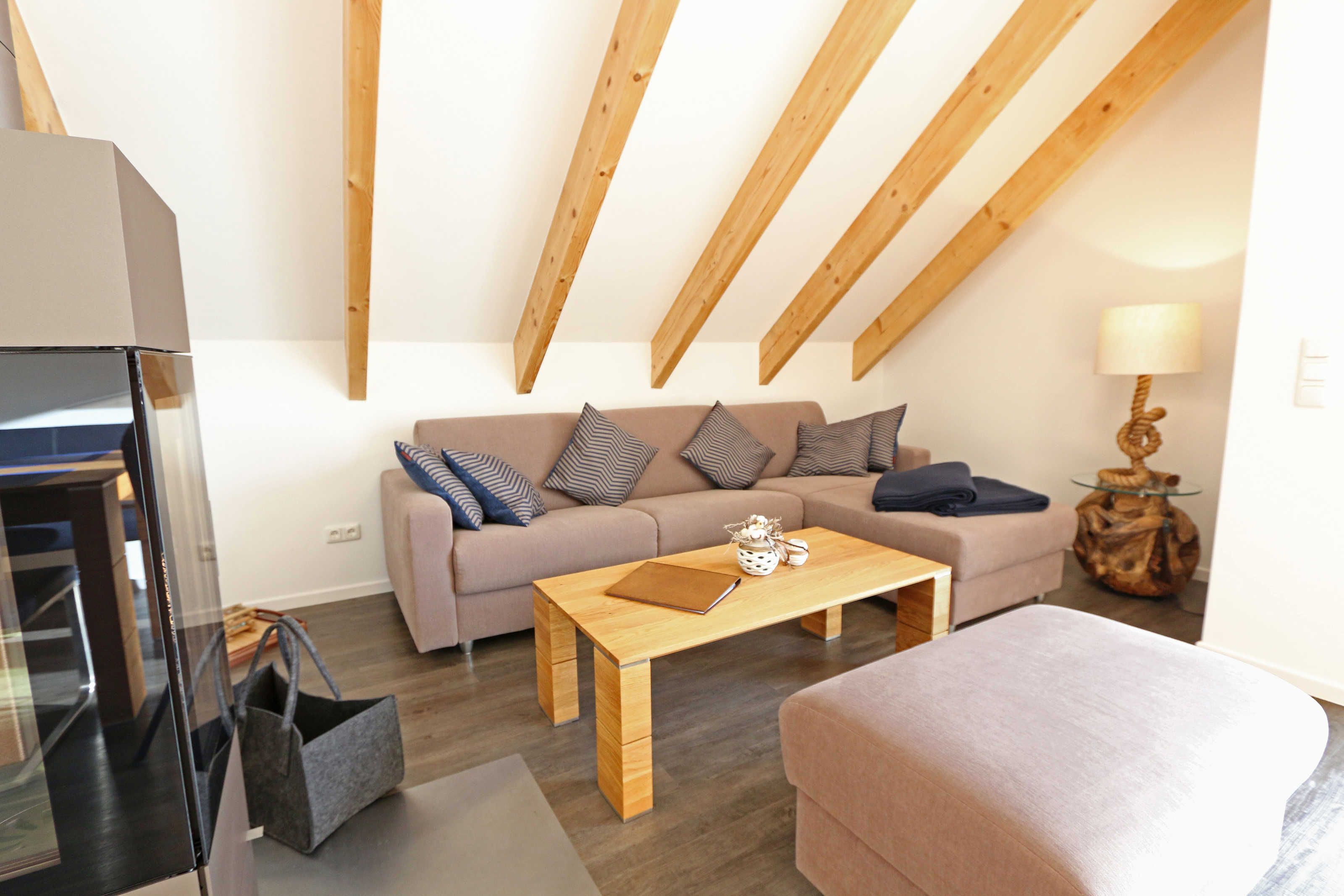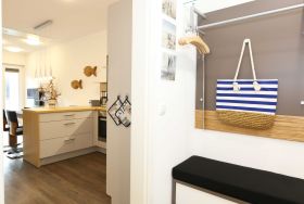 Das komfortabel und stilvoll eingerichtete Feriendomizil besticht durch viele mit Liebe zum Detail ausgesuchte Accessoires und einen traumhaften Balkonblick nach Süden auf den Lotsenberg. Die ca. 58 m² große Nichtraucherwohnung im 1. Obergeschoss ist mit Fußbodenheizung ausgestattet und bietet Ihnen Platz für 2 bis 4 Personen. Öffnen Sie die Wohnungstür und Sie betreten den hellen Flur mit Flurgarderobe nebst Sitzgelegenheit und bodentiefem Spiegel. Im vorderen Wohnbereich befindet sich eine hochwertige Küchenzeile mit Mikrowelle, Kühlschrank mit Gefrierfach, Backofen, Induktionskochfeld und Geschirrspüler. Auch Elektrogeräte wie Kaffeemaschine, Pad-Maschine (Senseo), Wasserkocher, Eierkocher, Toaster und Handmixer sowie viele andere nützliche Küchenhelfer sind hier vorhanden. Direkt dahinter fügt sich ein mit großem Eichen-Massivholztisch, modernen Freischwing-Stühlen und einer bequemen Sitzbank ausgestatteter Essbereich an. Von hier aus können Sie bereits beim Frühstück die Morgensonne durch die bodentiefen Wohnzimmerfenster genießen. Angrenzend öffnet sich der Raum zum großzügigen Wohnbereich, in dem Sie auf einer gemütlichen Sitzlandschaft - die sich mit wenigen Handgriffen zur vollwertigen Schlafgelegenheit ausklappen lässt entspannen können. Das komplette Ensemble, bestehend aus Couch mit Longchair (1,40 m x 2,00 m), Eiche-Couchtisch, Hockerbank und Beistelltisch mit Tischlampe im maritimen Stil, befindet sich auf der einen; ein Lowboard mit einer Spielesammlung, einem Smart-TV, Blu-Ray-Player und einer HiFi-Anlage mit Bluetooth und USB-Anschluss auf der anderen Seite. Auch auf einen Internetanschluss (WLAN) müssen Sie im Urlaub nicht verzichten. Dieser ist für Sie inklusive. In der kühlen Jahreszeit sorgt ein exklusiver Design-Kaminofen zusätzlich für wohlige Wärme. Durch die nach Süden ausgerichtete Glasfront des Wohnbereiches betreten Sie den mit Bangkirai belegten und mit einer Teakholz-Sitzgruppe möblierten Balkon mit Insektenschutzgitter und Sonnenschirm. Von hier aus genießen Sie einen herrlichen Blick ins Grüne, während Sie vor neugierigen Blicken durch eine mit Milchglas ausgefachte Edelstahl-Balkonbrüstung geschützt sind. Da sich der Balkon windgeschützt in das Obergeschoß einfügt und großzügig überdacht ist, können Sie hier auch die Abende genießen. Erholsame Ruhe finden Sie im geräumigen Schlafzimmer, in dem ein herrlich bequemes, individuell einstellbares Doppelbett (1,80 m x 2,00 m) in Komforthöhe mit verstellbaren Lattenrosten auf Sie wartet. Das elektrisch betriebene große Dachfenster, kann für einen ungestörten Schlaf völlig abgedunkelt werden und verfügt darüber hinaus über ein Insektenschutz-Rollo. Zwei Nachttischablagen mit dezenten Lampen laden zum Schmökern ein. Ein weiterer Smart-TV befindet sich hier an der Wand. In zwei großen Kleiderschränken sowie einer breiten Schubkastenkommode und auf 2 Herrendienern findet Ihre Kleidung Platz. Das geräumige, innenliegende Bad verfügt über eine große und bodentiefe Echtglas-Dusche, WC, einen Kosmetikspiegel, einen Fön, Ablageflächen und neben der Fußbodenheizung auch über einen elektrischen Handtuchtrockner. Im Abstellraum finden Sie unter anderem Staubsauger, Aschesauger für den Kamin, diverse Reinigungsutensilien, Wäscheständer sowie Balkonauflagen. Haustiere sind nicht erlaubt. Ihr PKW steht auf einem zur Wohnung gehörenden Stellplatz Nr. 06. Ihre mitgebrachten oder auch geliehenen Fahrräder sowie Strandutensilien und Co. können Sie im eigenen Schuppen aufbewahren. Hier befindet sich auch eine Anschlussmöglichkeit zum Aufladen von Ihren E-Bikes. Die Erstausstattung eines Wäschepaketes (komplette Bettwäsche, 1 Duschhandtuch, 2 kleine Handtücher) können Sie bis 14 Tage vor Anreise gegen einen Aufpreis dazu buchen oder durch eigene ergänzen. Ab 2 gebuchten Paketen erhalten Sie einmalig 1 Geschirrhandtuch und 1 Duschvorleger hinzu.