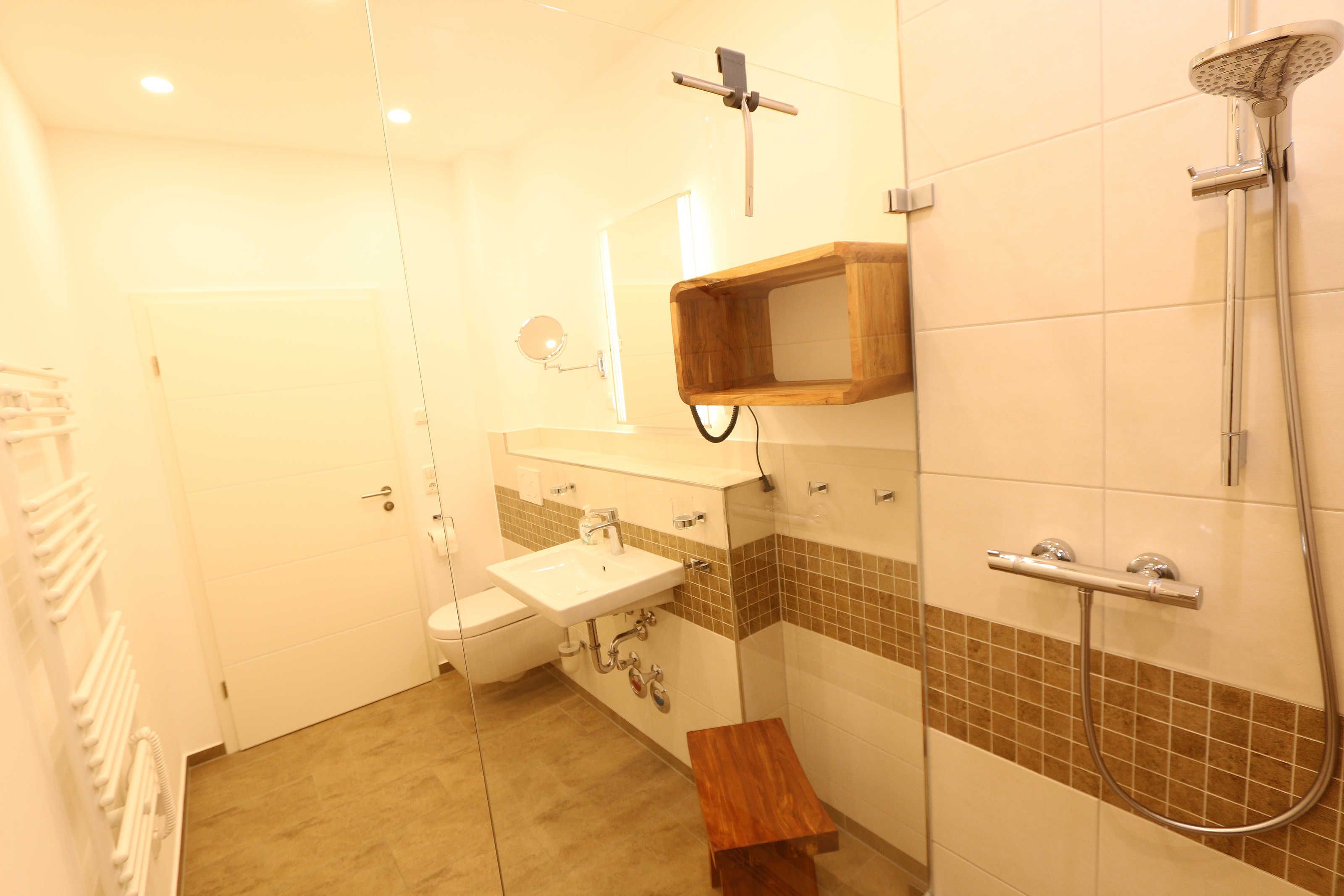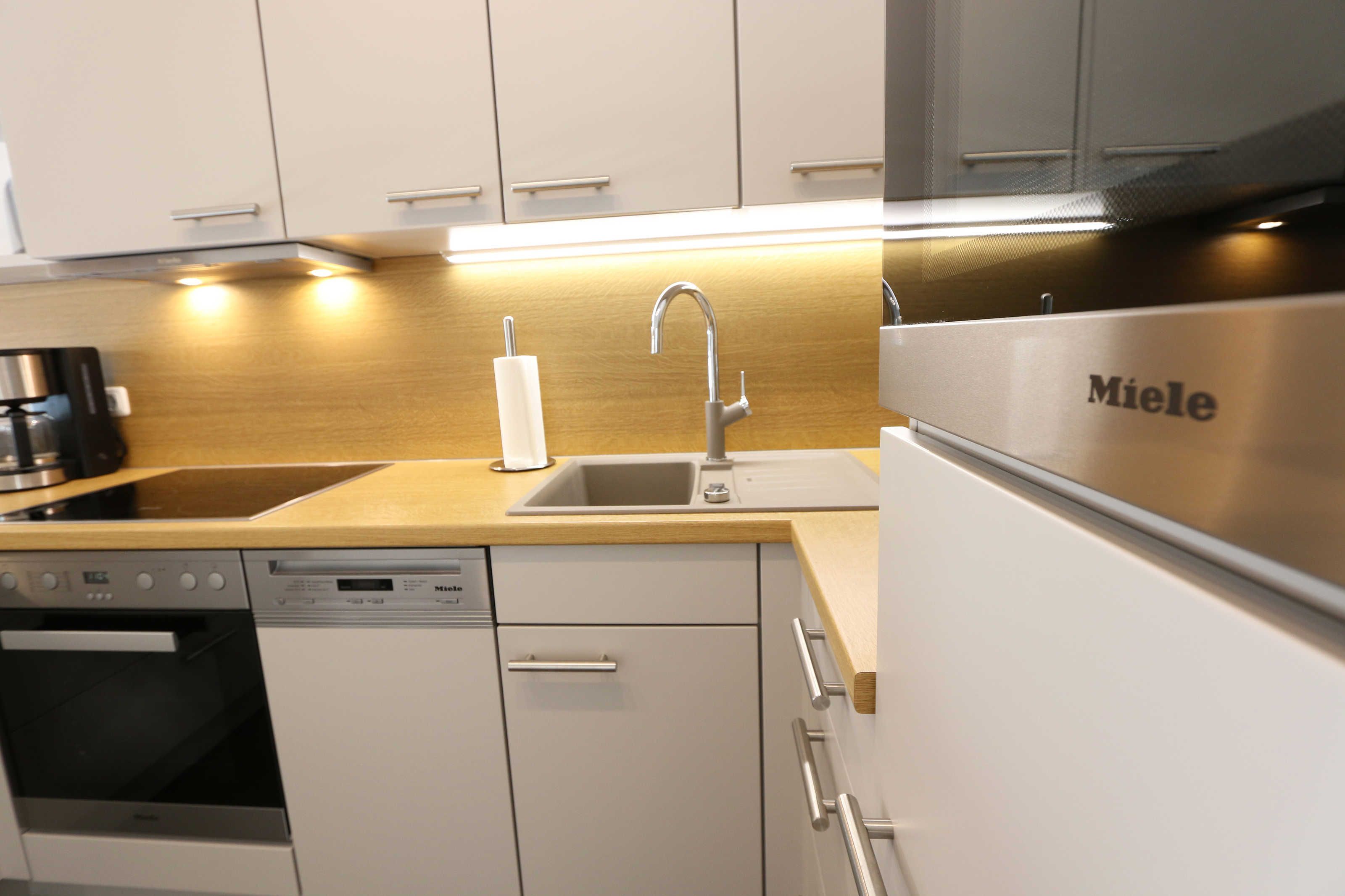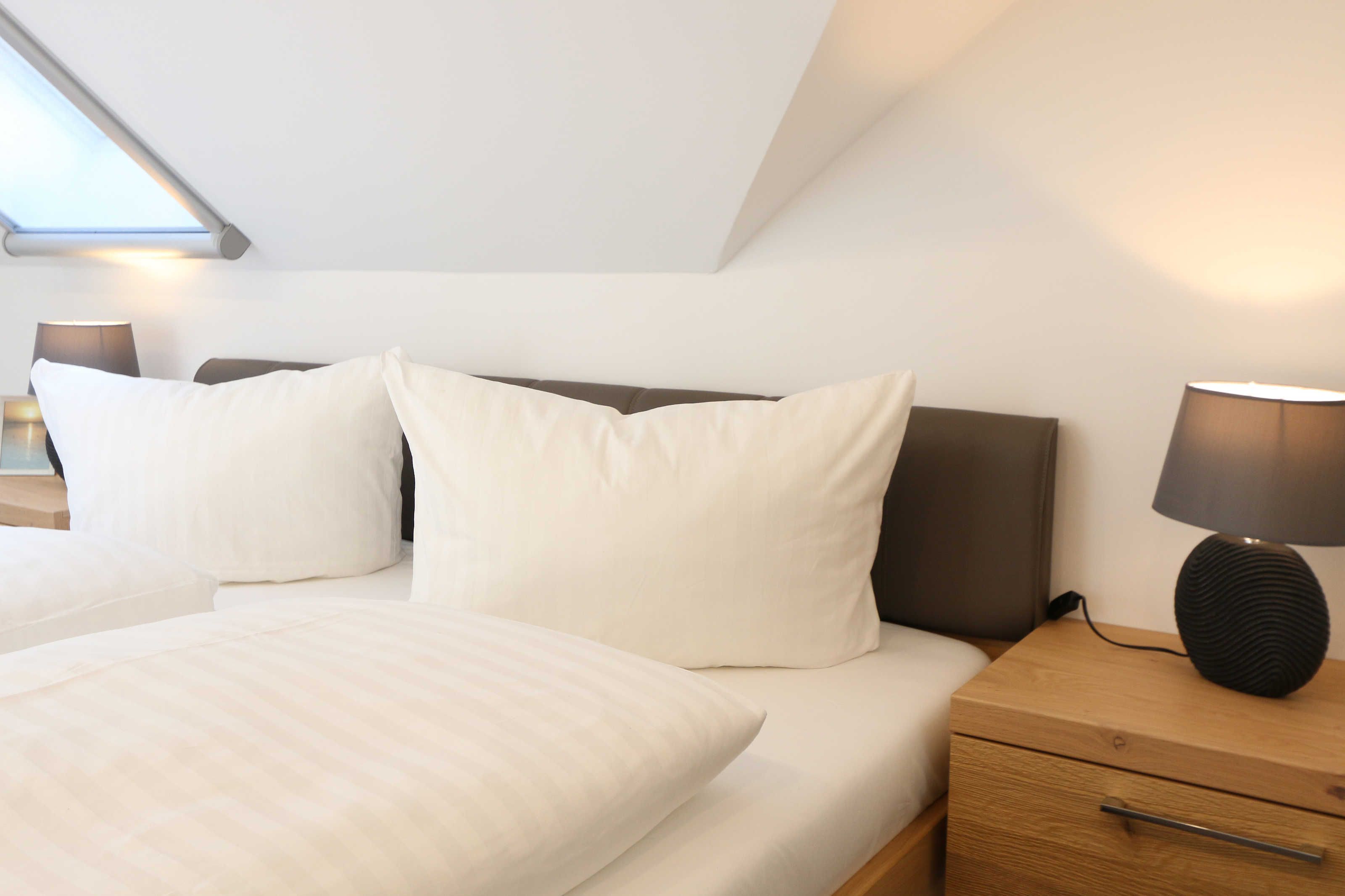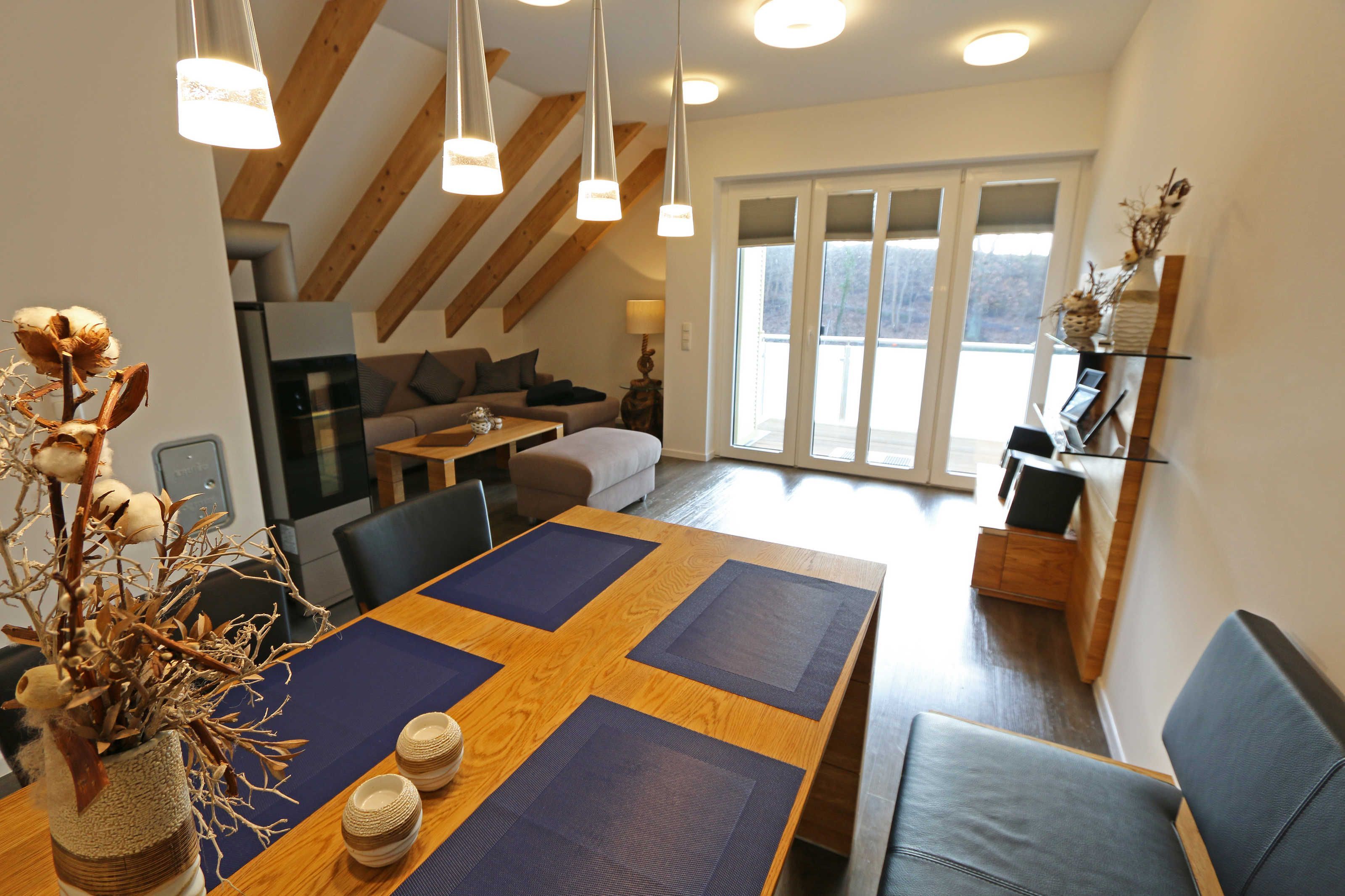 Das komfortabel und stilvoll eingerichtete Feriendomizil besticht durch viele mit Liebe zum Detail ausgesuchte Accessoires und einen traumhaften Balkonblick nach Süden auf den Lotsenberg. Die ca. 58 m² große Nichtraucherwohnung im 1. Obergeschoss ist mit Fußbodenheizung ausgestattet und bietet Ihnen Platz für 2 bis 4 Personen. Öffnen Sie die Wohnungstür und Sie betreten den hellen Flur mit Flurgarderobe nebst Sitzgelegenheit und bodentiefem Spiegel. Im vorderen Wohnbereich befindet sich eine hochwertige Küchenzeile mit Mikrowelle, Kühlschrank mit Gefrierfach, Backofen, Induktionskochfeld und Geschirrspüler. Auch Elektrogeräte wie Kaffeemaschine, Pad-Maschine (Senseo), Wasserkocher, Eierkocher, Toaster und Handmixer sowie viele andere nützliche Küchenhelfer sind hier vorhanden. Direkt dahinter fügt sich ein mit großem Eichen-Massivholztisch, modernen Freischwing-Stühlen und einer bequemen Sitzbank ausgestatteter Essbereich an. Von hier aus können Sie bereits beim Frühstück die Morgensonne durch die bodentiefen Wohnzimmerfenster genießen. Angrenzend öffnet sich der Raum zum großzügigen Wohnbereich, in dem Sie auf einer gemütlichen Sitzlandschaft - die sich mit wenigen Handgriffen zur vollwertigen Schlafgelegenheit ausklappen lässt entspannen können. Das komplette Ensemble, bestehend aus Couch mit Longchair (1,40 m x 2,00 m), Eiche-Couchtisch, Hockerbank und Beistelltisch mit Tischlampe im maritimen Stil, befindet sich auf der einen; ein Lowboard mit einer Spielesammlung, einem Smart-TV, Blu-Ray-Player und einer HiFi-Anlage mit Bluetooth und USB-Anschluss auf der anderen Seite. Auch auf einen Internetanschluss (WLAN) müssen Sie im Urlaub nicht verzichten. Dieser ist für Sie inklusive. In der kühlen Jahreszeit sorgt ein exklusiver Design-Kaminofen zusätzlich für wohlige Wärme. Durch die nach Süden ausgerichtete Glasfront des Wohnbereiches betreten Sie den mit Bangkirai belegten und mit einer Teakholz-Sitzgruppe möblierten Balkon mit Insektenschutzgitter und Sonnenschirm. Von hier aus genießen Sie einen herrlichen Blick ins Grüne, während Sie vor neugierigen Blicken durch eine mit Milchglas ausgefachte Edelstahl-Balkonbrüstung geschützt sind. Da sich der Balkon windgeschützt in das Obergeschoß einfügt und großzügig überdacht ist, können Sie hier auch die Abende genießen. Erholsame Ruhe finden Sie im geräumigen Schlafzimmer, in dem ein herrlich bequemes, individuell einstellbares Doppelbett (1,80 m x 2,00 m) in Komforthöhe mit verstellbaren Lattenrosten auf Sie wartet. Das elektrisch betriebene große Dachfenster, kann für einen ungestörten Schlaf völlig abgedunkelt werden und verfügt darüber hinaus über ein Insektenschutz-Rollo. Zwei Nachttischablagen mit dezenten Lampen laden zum Schmökern ein. Ein weiterer Smart-TV befindet sich hier an der Wand. In zwei großen Kleiderschränken sowie einer breiten Schubkastenkommode und auf 2 Herrendienern findet Ihre Kleidung Platz. Das geräumige, innenliegende Bad verfügt über eine große und bodentiefe Echtglas-Dusche, WC, einen Kosmetikspiegel, einen Fön, Ablageflächen und neben der Fußbodenheizung auch über einen elektrischen Handtuchtrockner. Im Abstellraum finden Sie unter anderem Staubsauger, Aschesauger für den Kamin, diverse Reinigungsutensilien, Wäscheständer sowie Balkonauflagen. Haustiere sind nicht erlaubt. Ihr PKW steht auf einem zur Wohnung gehörenden Stellplatz Nr. 06. Ihre mitgebrachten oder auch geliehenen Fahrräder sowie Strandutensilien und Co. können Sie im eigenen Schuppen aufbewahren. Hier befindet sich auch eine Anschlussmöglichkeit zum Aufladen von Ihren E-Bikes. Die Erstausstattung eines Wäschepaketes (komplette Bettwäsche, 1 Duschhandtuch, 2 kleine Handtücher) können Sie bis 14 Tage vor Anreise gegen einen Aufpreis dazu buchen oder durch eigene ergänzen. Ab 2 gebuchten Paketen erhalten Sie einmalig 1 Geschirrhandtuch und 1 Duschvorleger hinzu.