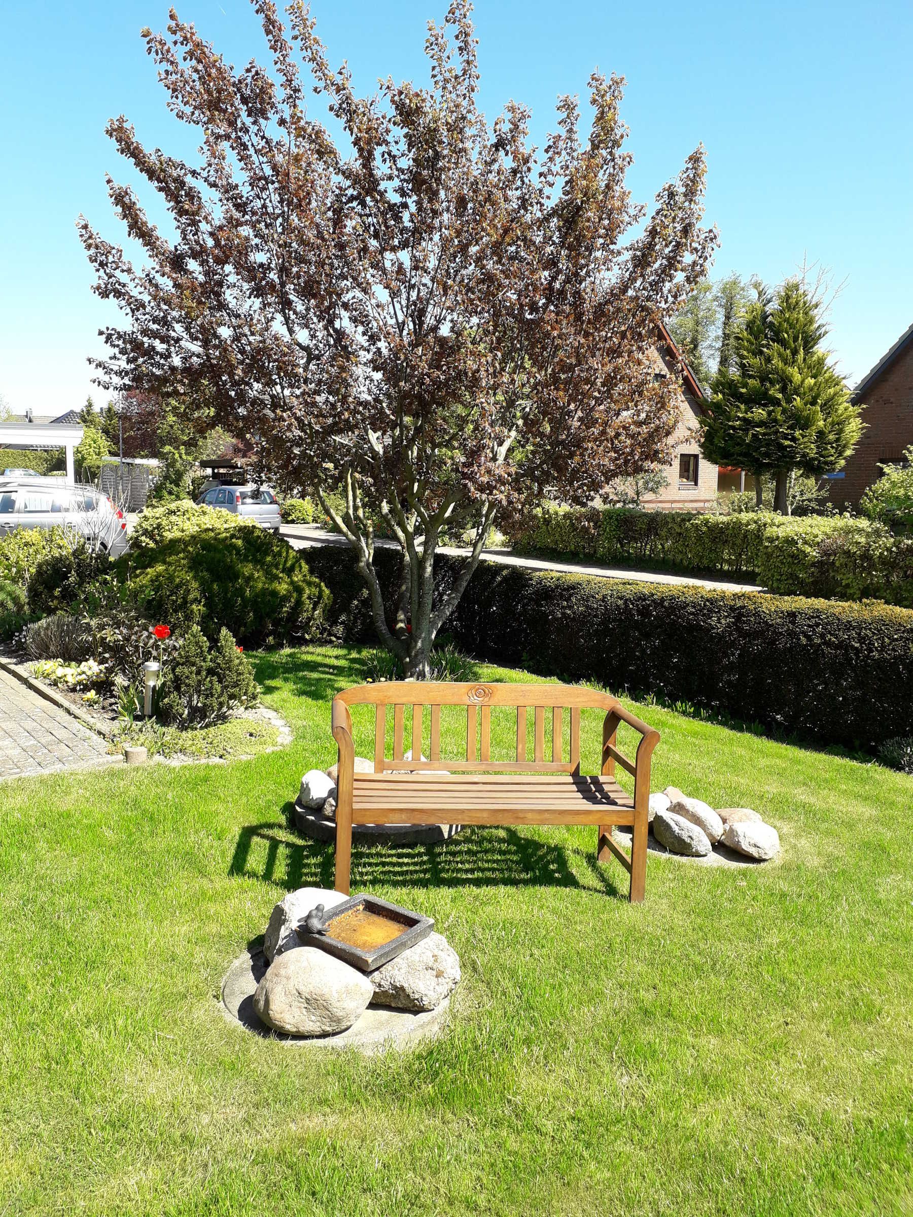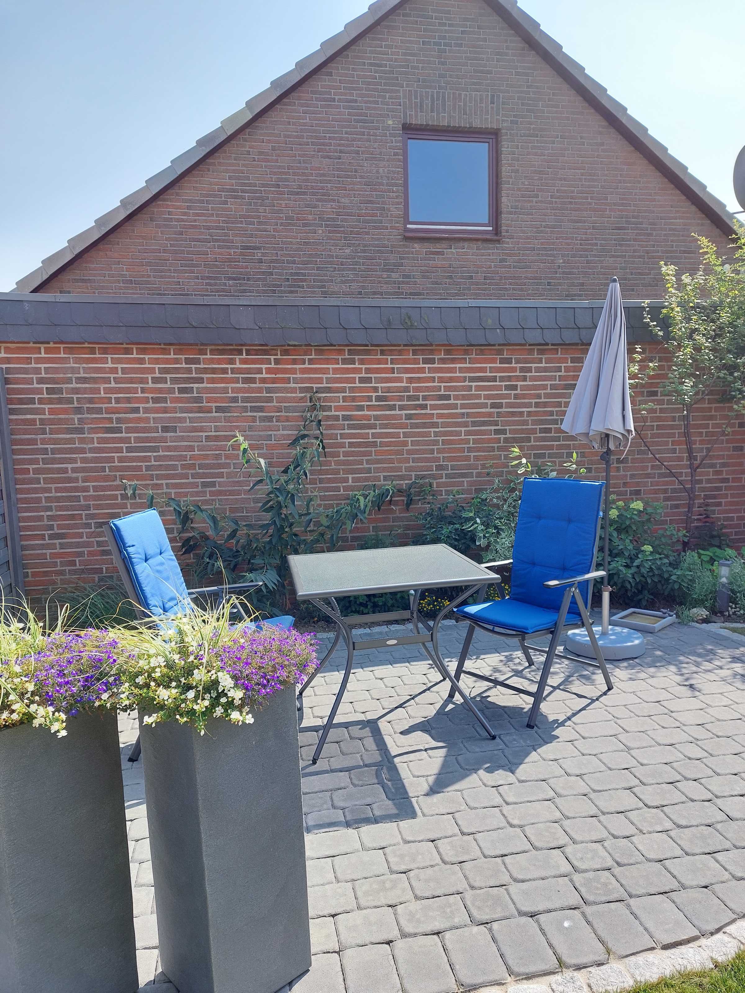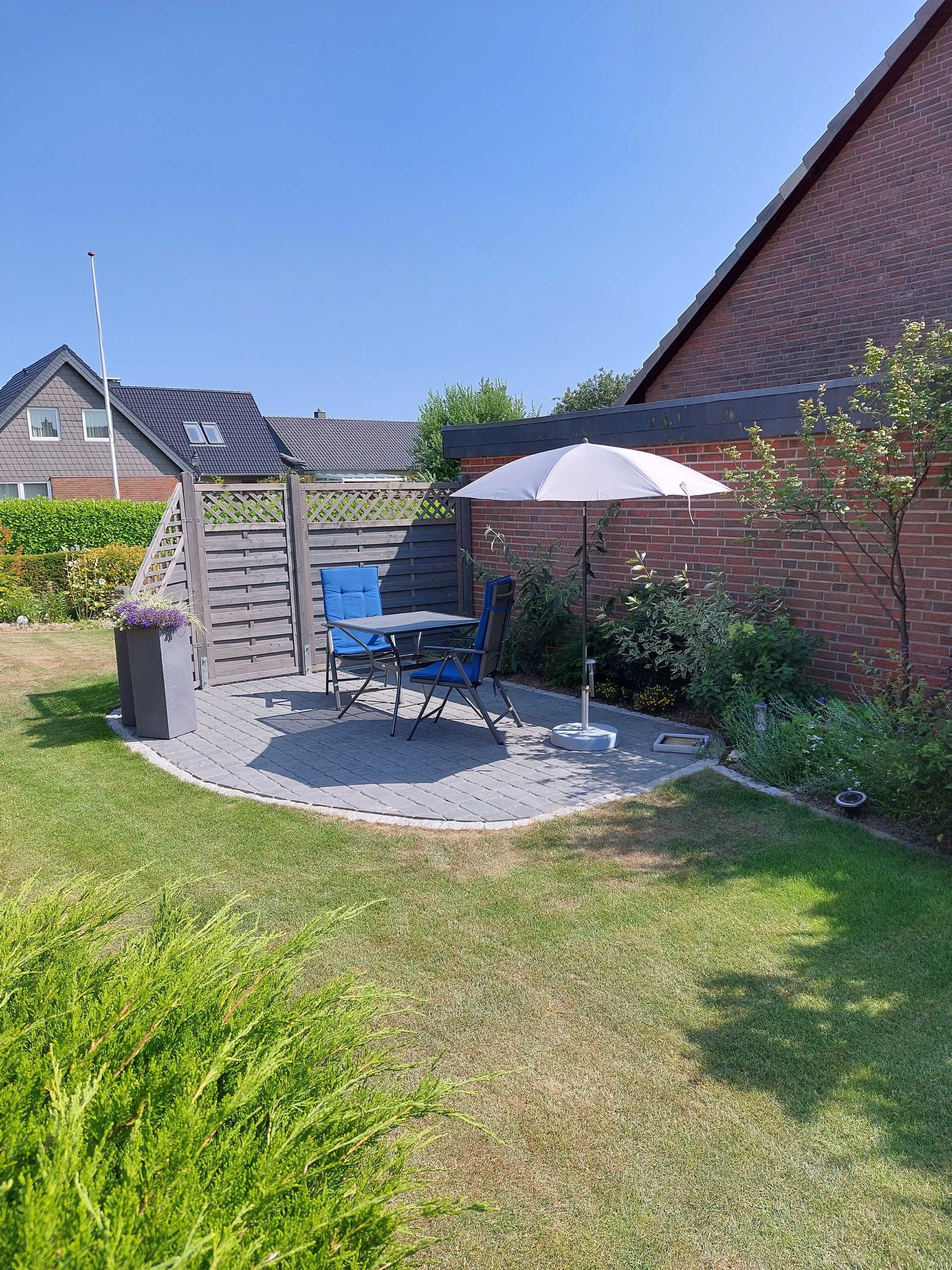 Kleine Terrasse im Garten mit möblierter Sitzecke . Überdachter Fahrradstellplatz, Parkmöglichkeit für Pkw gegenüber vom Haus.