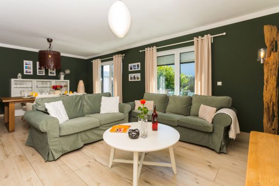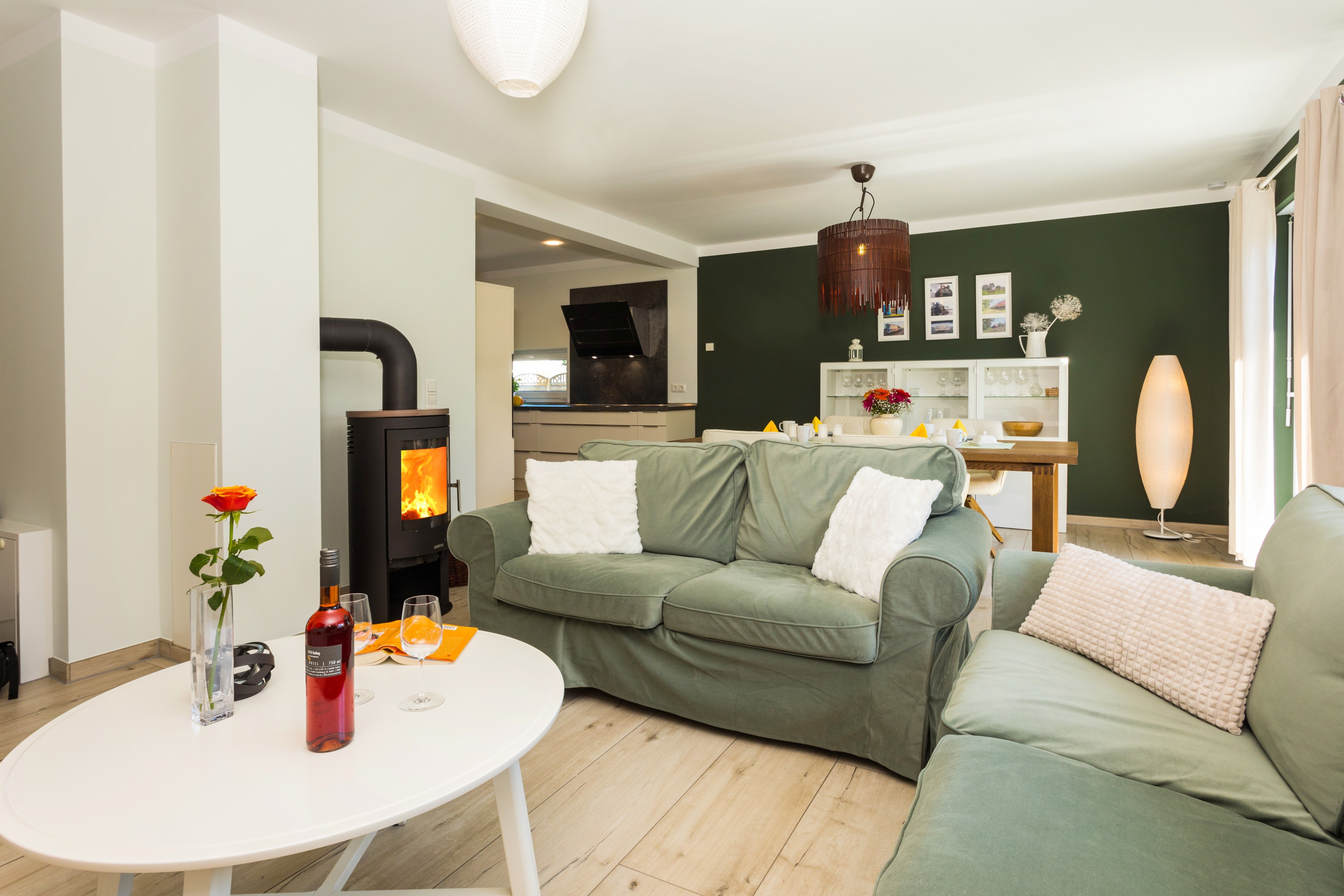 • gemütlicher Wohn- und Essbereich mit Couchgarnitur und Esstisch für 6 Personen, Kamin, Flachbild-TV mit ca. 140 cm Bilddiagonale und 2.1 3D Blu-ray Heimkino System, Internet WLAN