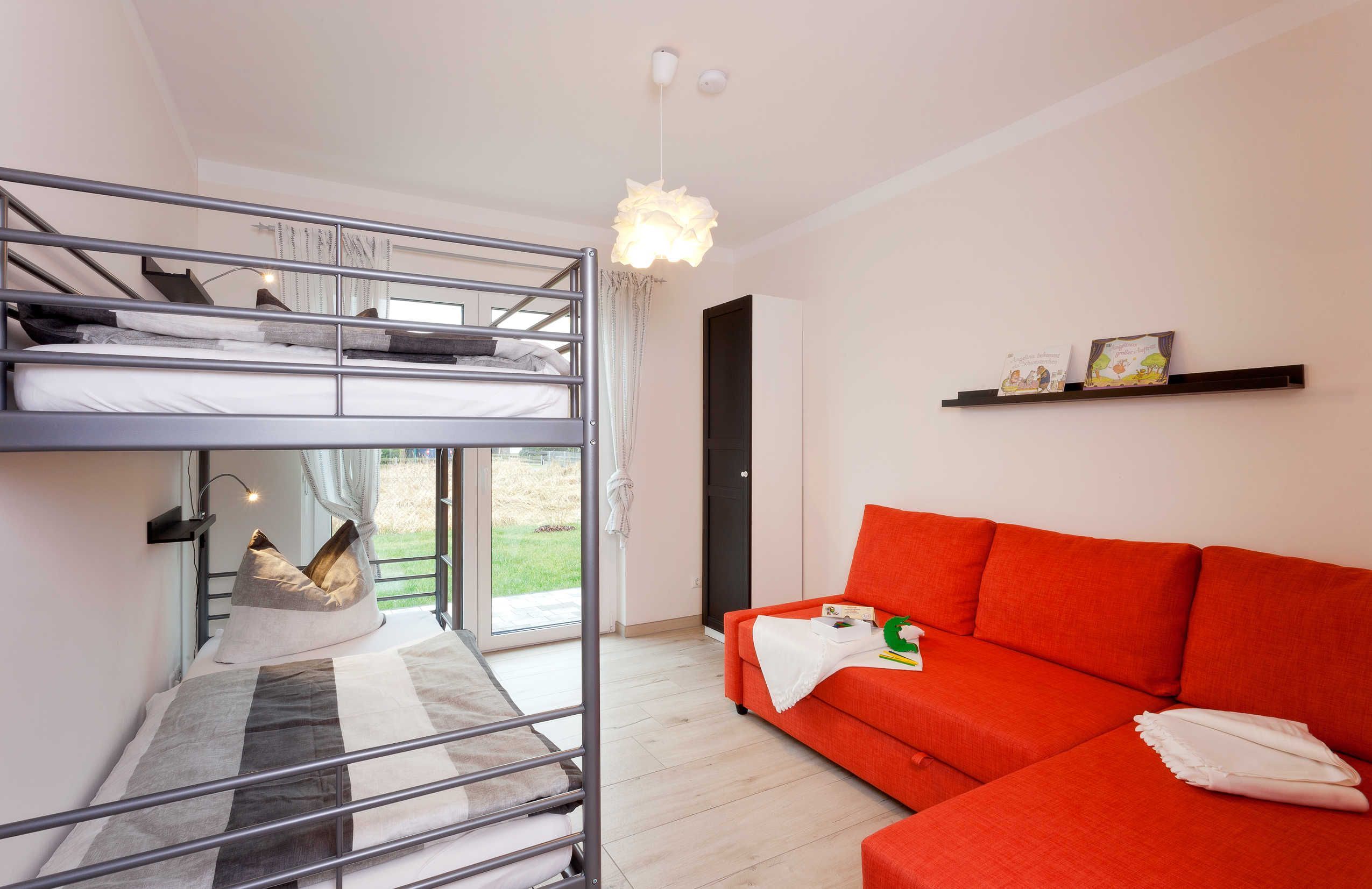 • 1 Schlafraum mit Etagenbett (je ca. 0,90 m x 2,00 m) und einer Schlafcouch (ca. 1,40 m x 2,00 m)