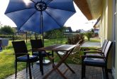 Die Wohn- und Schlafbereiche sind mit Echtholzparkett ausgelegt und das gesamte Haus ist Fußboden beheizt. Um die Haushälfte herum ist eine ca. 300 qm große Wiesenfläche zur alleinigen Nutzung. Eine Terrassenfläche zieht sich von der Ostseite bis zur Südseite, so dass man hier den ganzen Tag, auch schon zum Frühstück, die Sonne genießen kann.