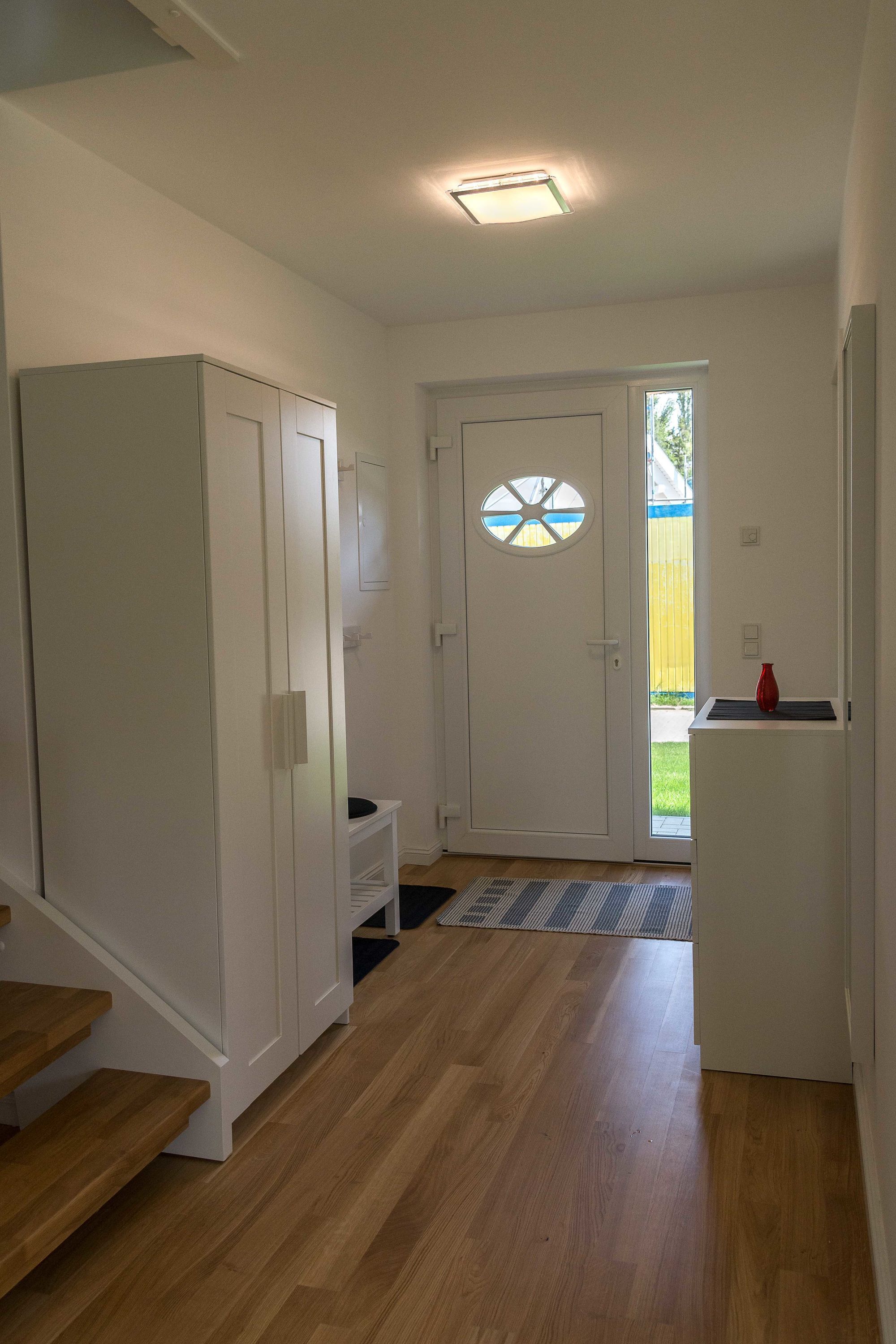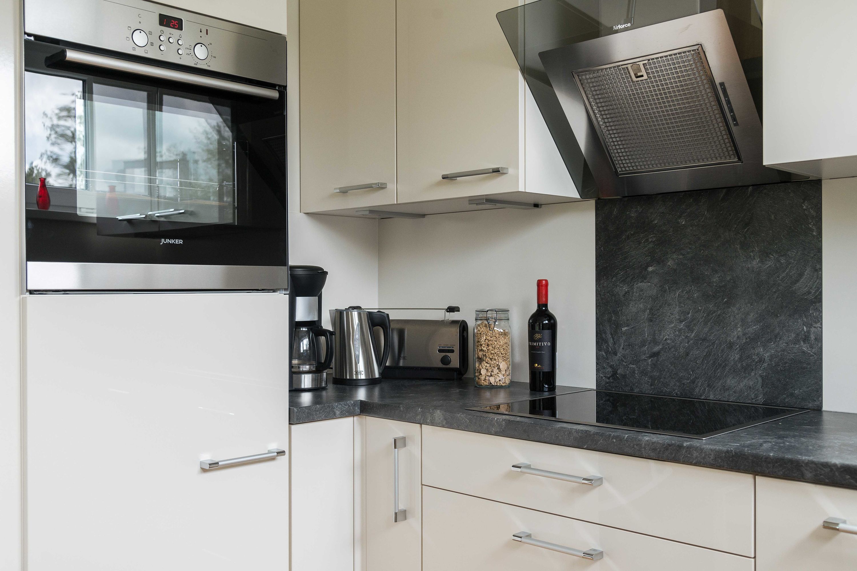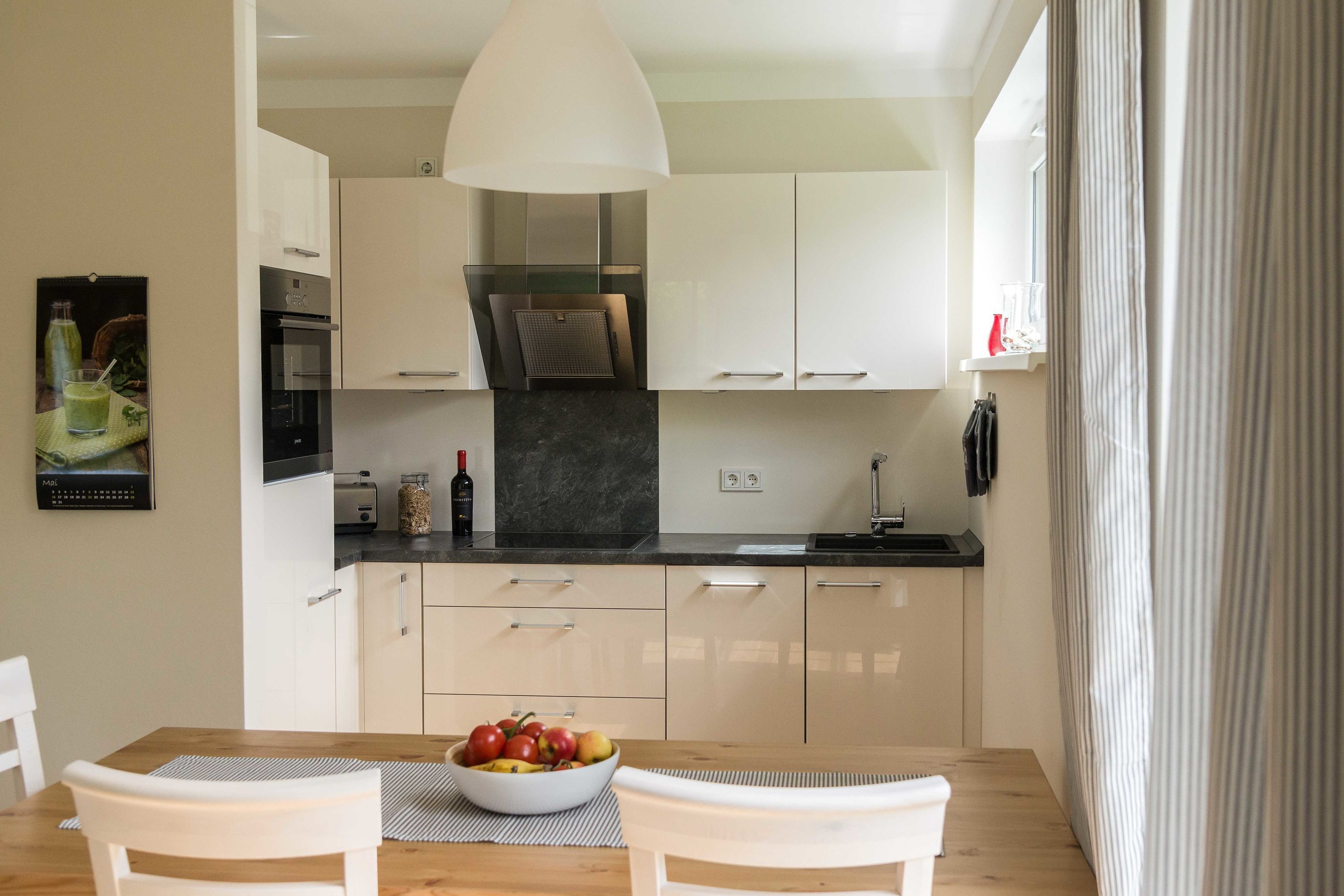 An den großzügig konzipierten Eingangsbereich schließt sich der Wohnraum mit der offenen, modernen Einbauküche an, welche mit allen notwendigen Geräten (Cerankochfeld, Backofen, Kühlschrank mit Gefrierfach, Geschirrspülmaschine, Kaffeemaschine, Toaster, Wasserkocher) ausgestattet ist.