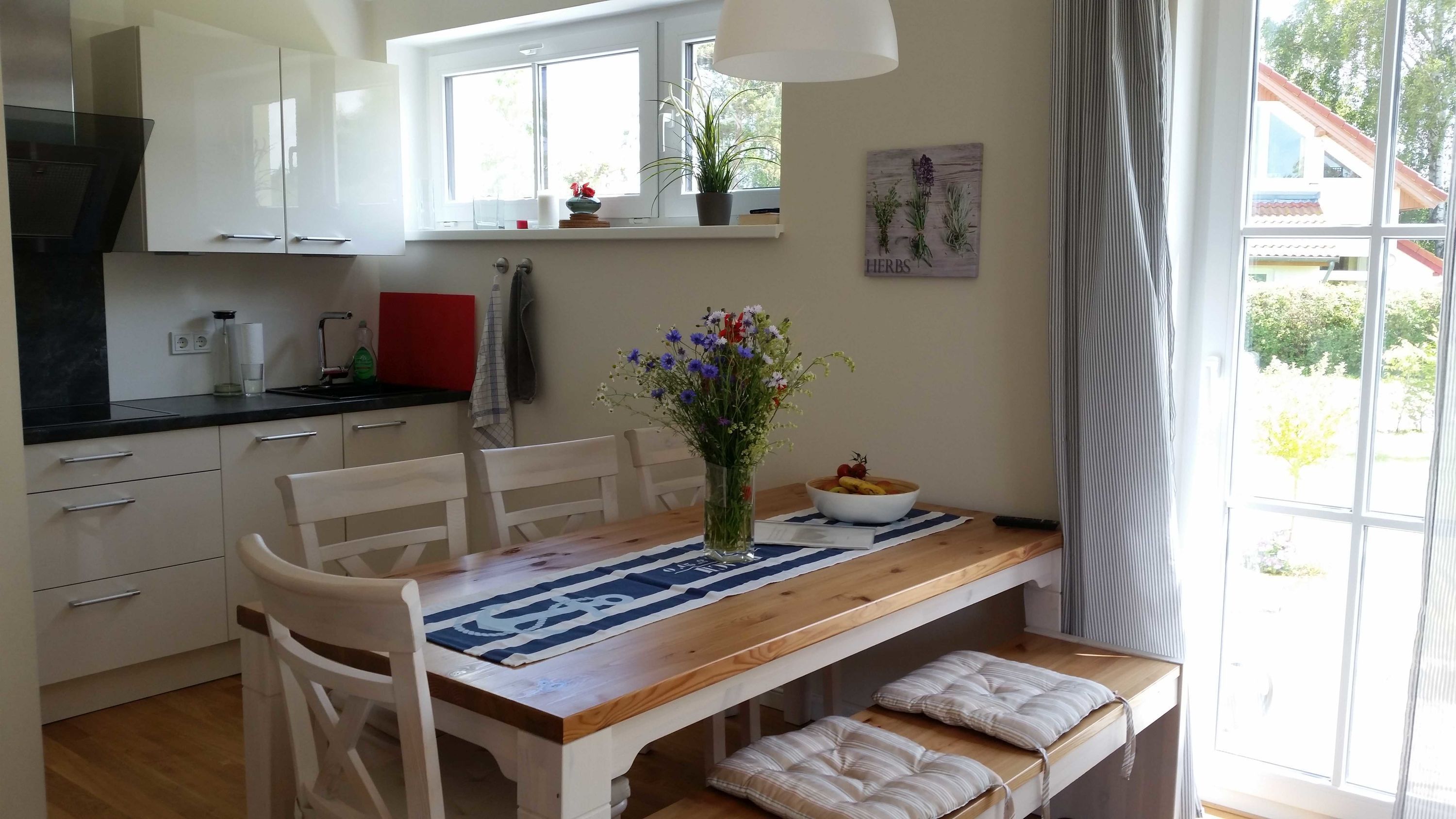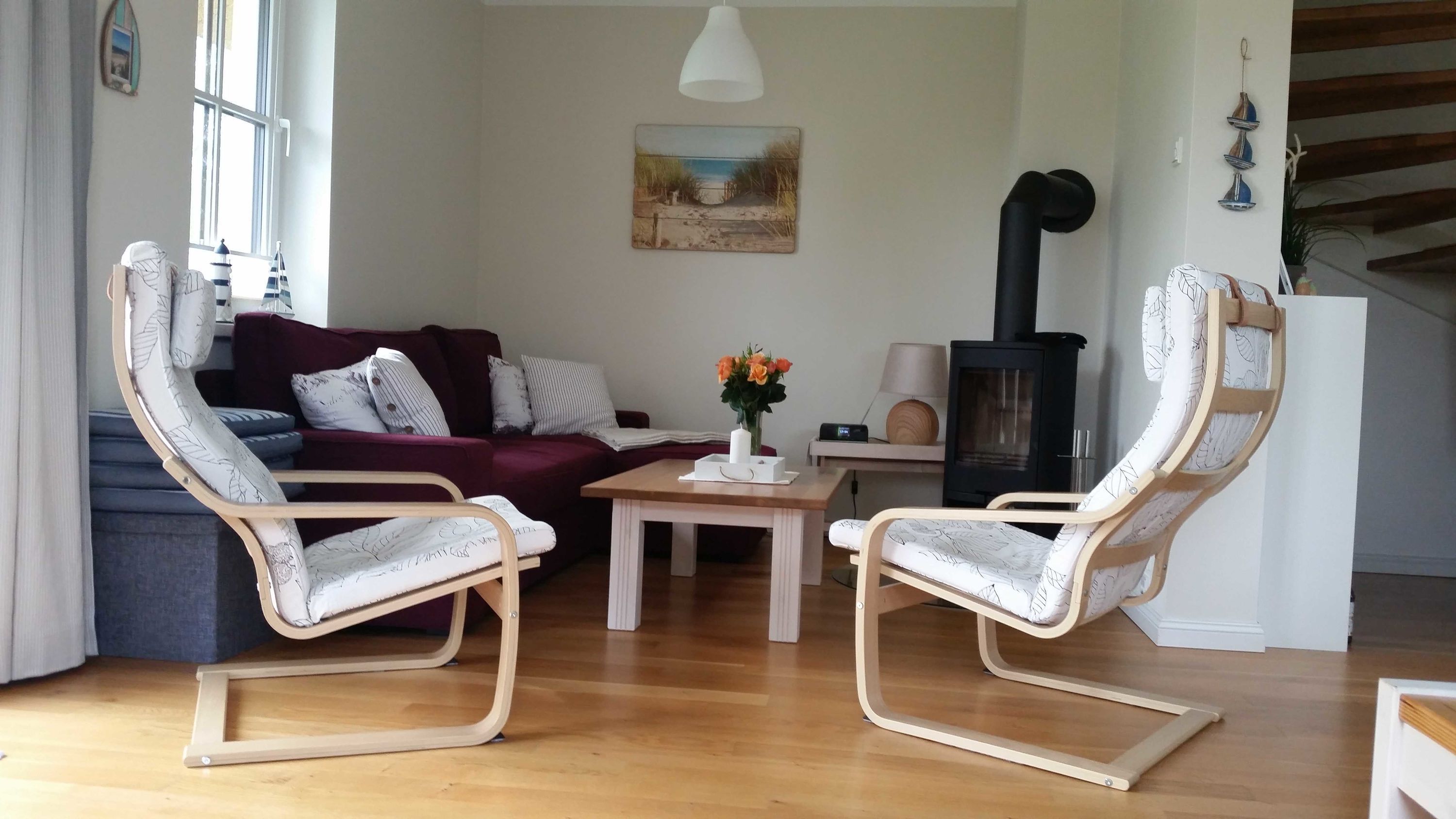 Die gemütliche Eckcouch im Wohnbereich ist auch als Doppelbett nutzbar. Ist das Wetter einmal nicht zum Aufenthalt im Freien geeignet, stehen hier ein Flachbild-Smart-TV mit Mediathek-und Radio, ein Blu-ray-Player und ein großer Tisch für Spieleabende mit sechs Sitzplätzen zur Verfügung. Entschleunigende, gemütliche Stunden lassen sich vor dem Kaminofen verleben (Kaminholz muss selbst organisiert werden).