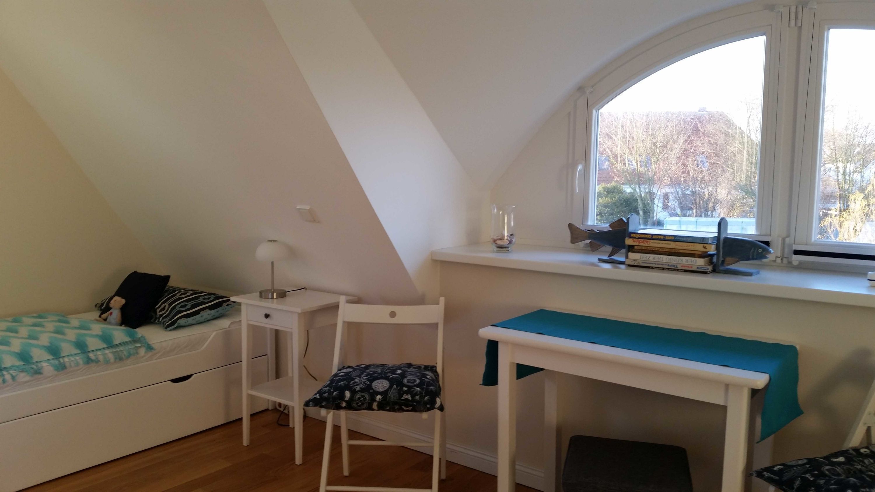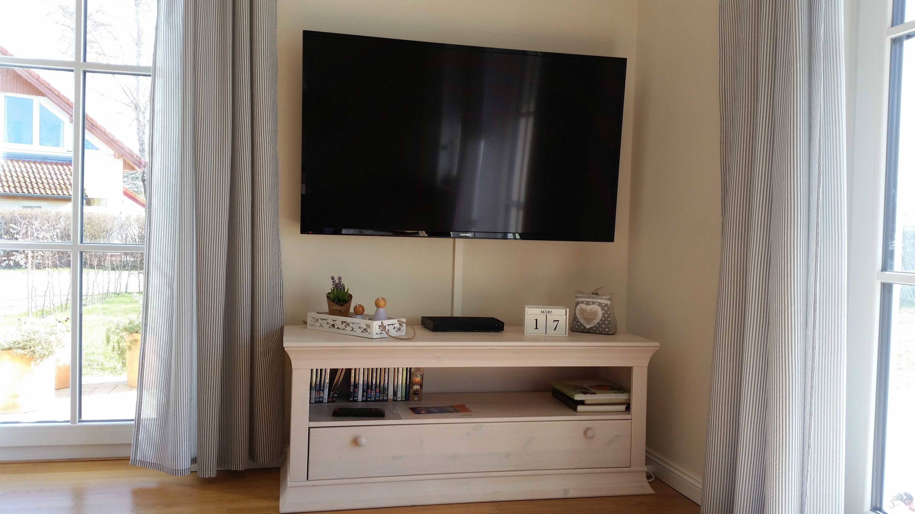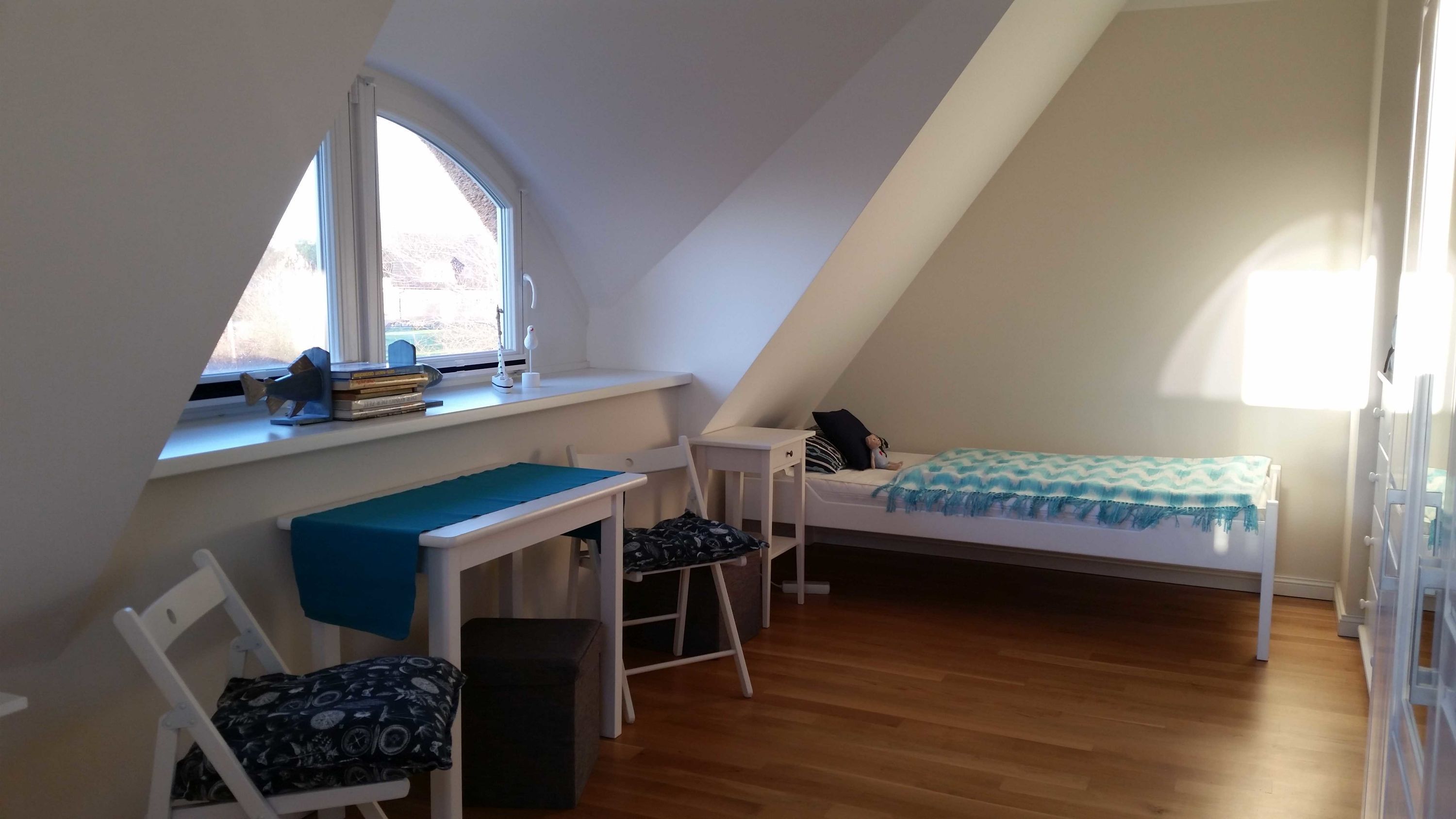Beide Schlafzimmer liegen im Obergeschoss. Das erste besitzt ein 1,80 m breites Doppelbett und ein Smart-TV Gerät. In dem zweiten stehen zwei Einzelbetten. Eines davon hat ein untergeschobenes Rollbett. In den Kleiderschränken ist ausreichend Platz für die Urlaubsgarderobe.