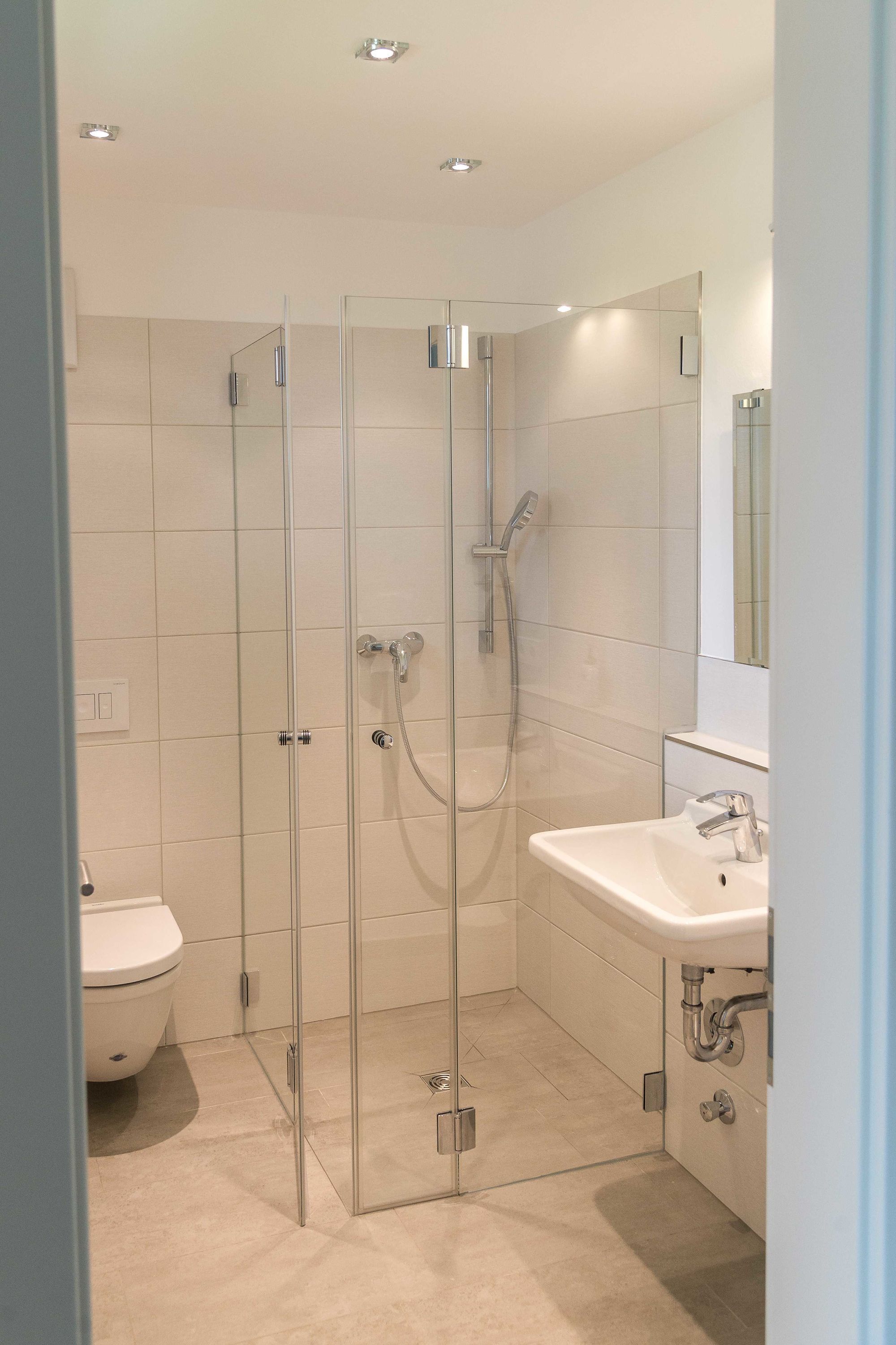 Das Ferienhaus verfügt über zwei Bäder mit einer jeweils verglasten Dusche, einer Handtuchheizung und einem WC. In dem sehr geräumigen Bad im Obergeschoss ist eine angenehme Regendusche installiert.