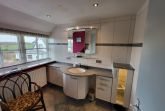 Neue Einbauküche mit Geschirrspüler , Cerankochfeld, Backofen und Mikrowelle und einer Kühl-Gefrierkombination. In der separaten Küche befindet sich eine kleine Sitzecke sowie ein kleiner Fernseher.
