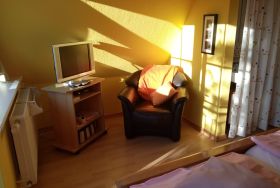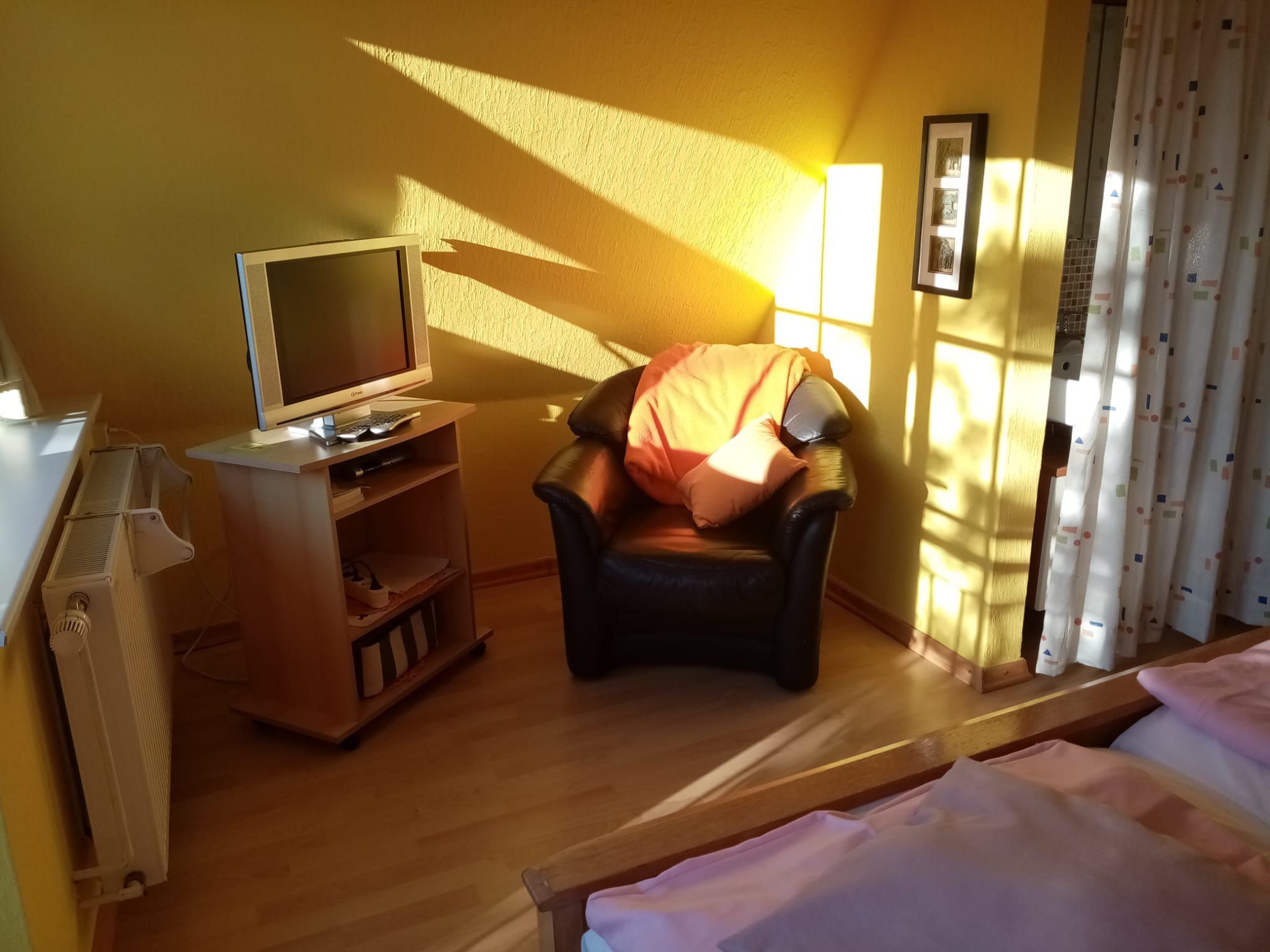 Flachbildfernseher und Sessel laden zum Entspannen ein. Ebenfalls im Zimmer ist eine kleine Frühstücksecke mit Tisch und zwei Stühlen, dazu kommt ein Kühlschrank, Kaffeemaschine und Wasserkocher.