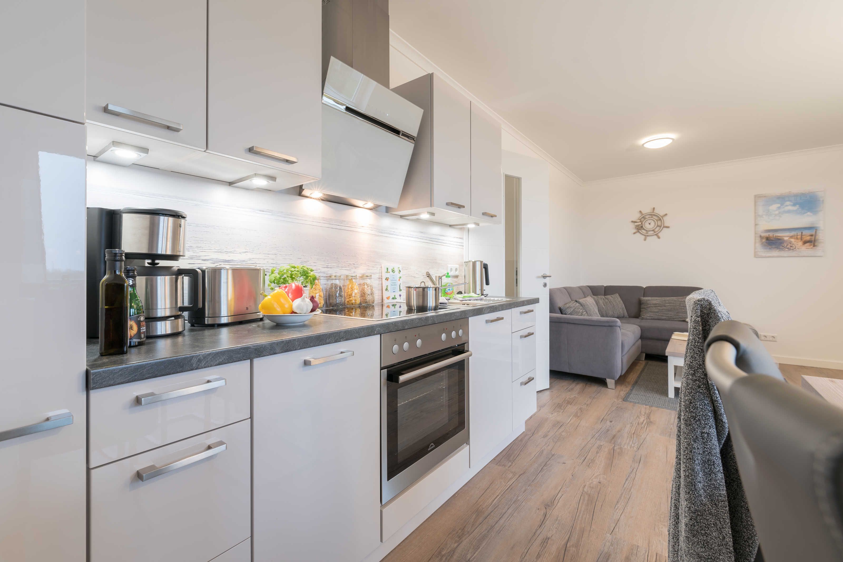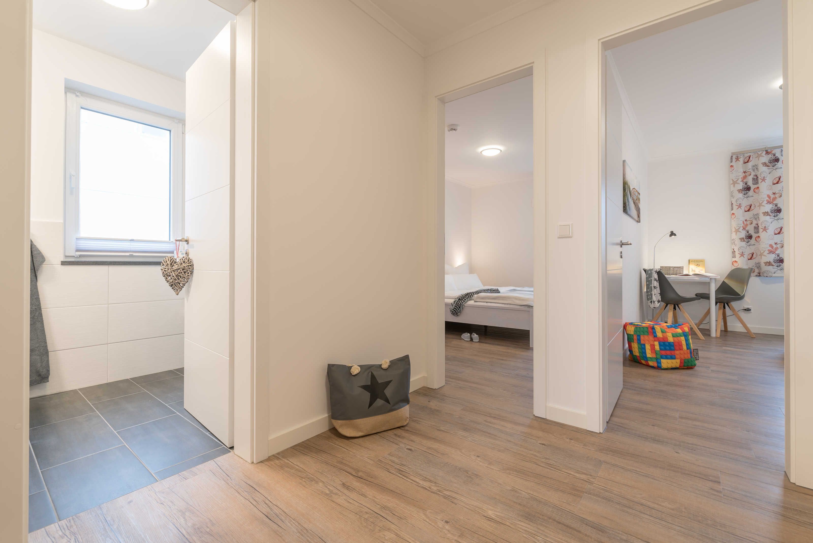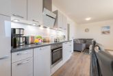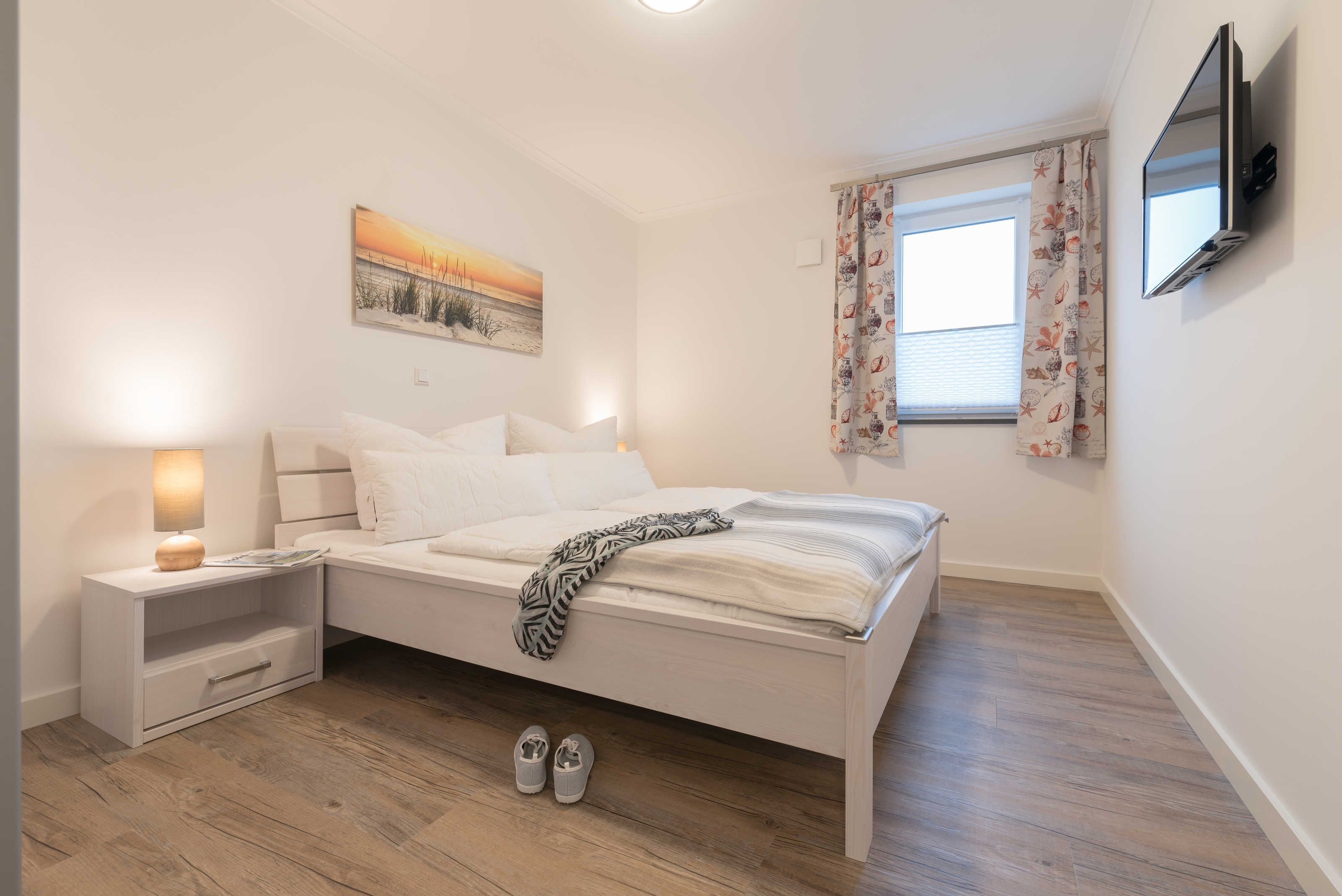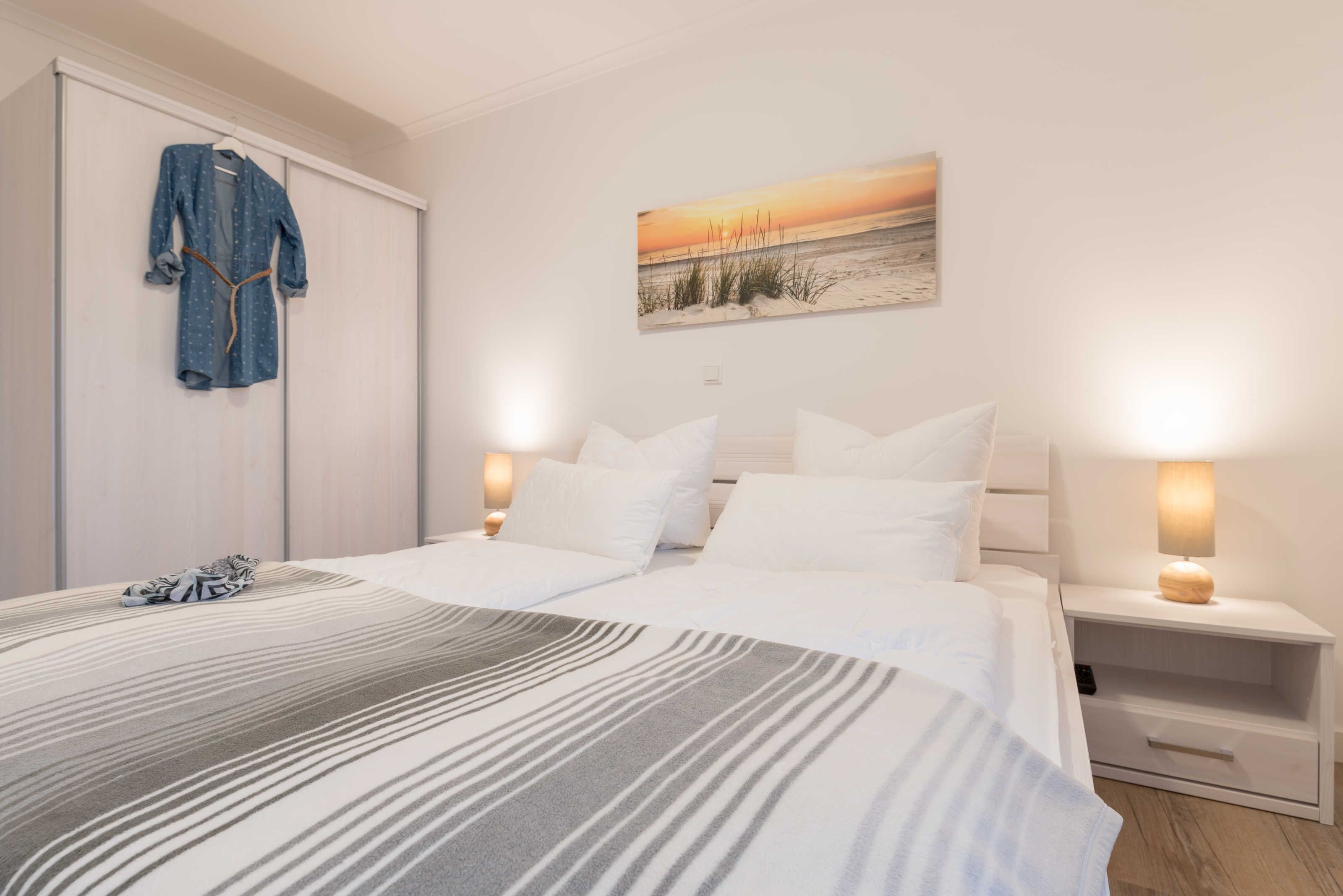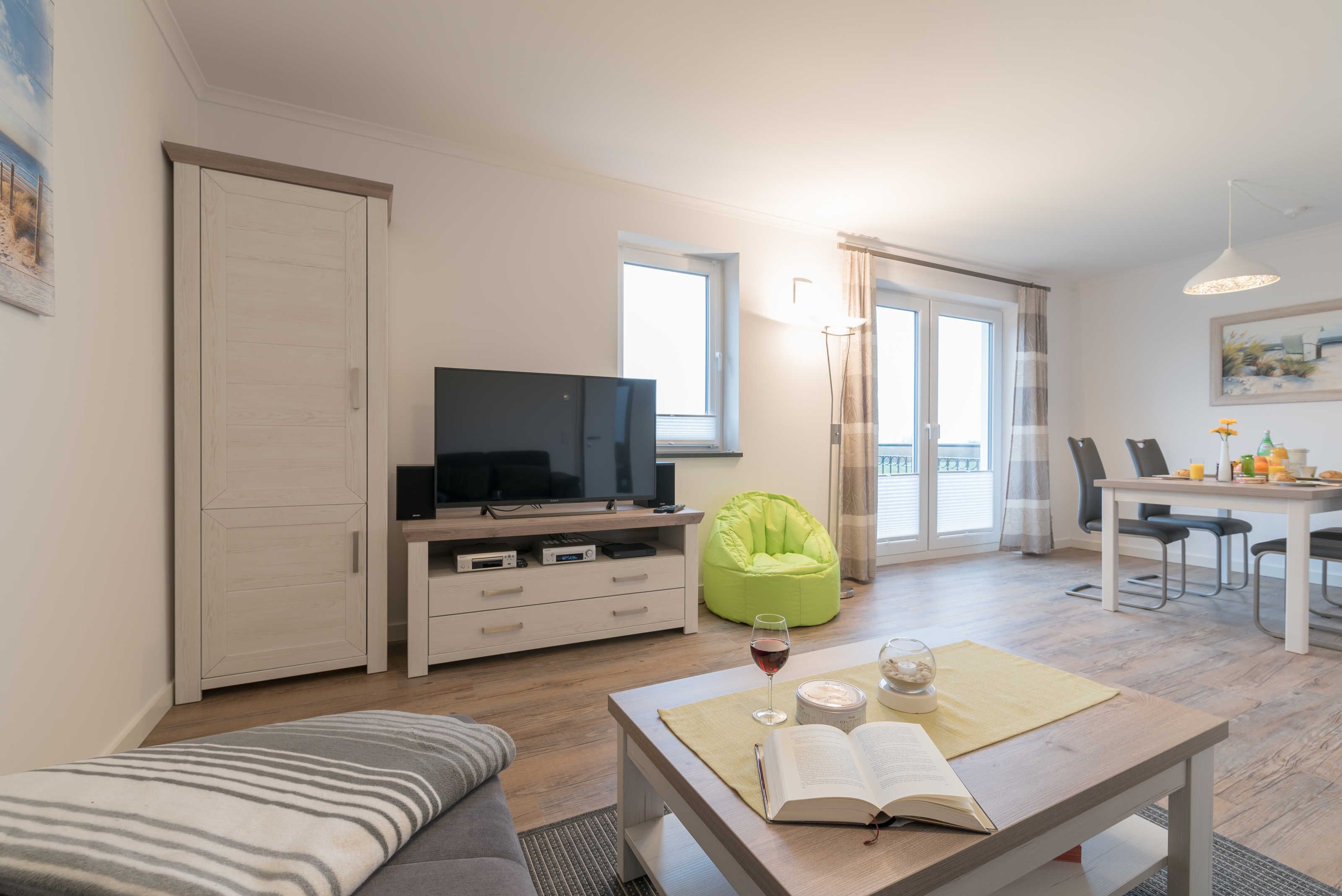 Die im maritimen Stil eingerichtete 3-Zimmer Wohnung besteht aus großzügigem Schlafzimmer, einem zweiten Schlafraum, einem kombiniertem Wohn-Esszimmer mit offener Einbauküche, einem Bad mit ebenerdiger Dusche sowie einem Abstellraum. Im hell eingerichteten Wohnzimmer laden eine gemütliche Couch sowie ein großer Esstisch, der vier Personen bequem Platz bietet, zum Verweilen ein. Die bodentiefen Fensterelemente sorgen für lichtdurchfluteten Wohngenuss und bieten Zugang zum Balkon. Die Fußbodenheizung und die einstellbare Lüftung sorgen in allen Jahreszeiten für ein angenehmes Raumklima und Gemütlichkeit. Weiterhin verfügt die Ferienwohnung über zwei separate Schlafräume. Im größeren Schlafzimmer stehen ein Doppelbett (1,90 m x 2,00 m) und ein geräumiger Kleiderschrank. Im zweiten Schlafzimmer befinden sich ein Duobett mit ausziehbarem Unterbett (0,90 m x 2,00 m) sowie ein weiterer Kleiderschrank. Die Flatscreen-TV´s in Wohn- und Schlafzimmer, ein Blu-Ray-Player und eine Stereo-Anlage gehören zur modernen Ausstattung dieser Ferienwohnung. Die Einbauküche verfügt über einen Geschirrspüler, einen Kühlschrank mit Gefrierfach, einen Backofen, ein Cerankochfeld, eine Mikrowelle, einen Toaster, eine Kaffeemaschine, einen Wasserkocher und vom Kochtopf bis zum Eierbecher über eine komplette Küchenausstattung. Das helle Badezimmer mit Fenster und ebenerdiger Dusche ist ausgestattet mit einem Waschtisch inklusive großem Spiegel, einem Haartrockner und Abstellmöglichkeiten für Ihre Waschutensilien. Im Abstellraum der Wohnung finden Sie eine Waschmaschine (4 kg), ein Wäschegestell, einen Staubsauger und haben Platz zur Lagerung.