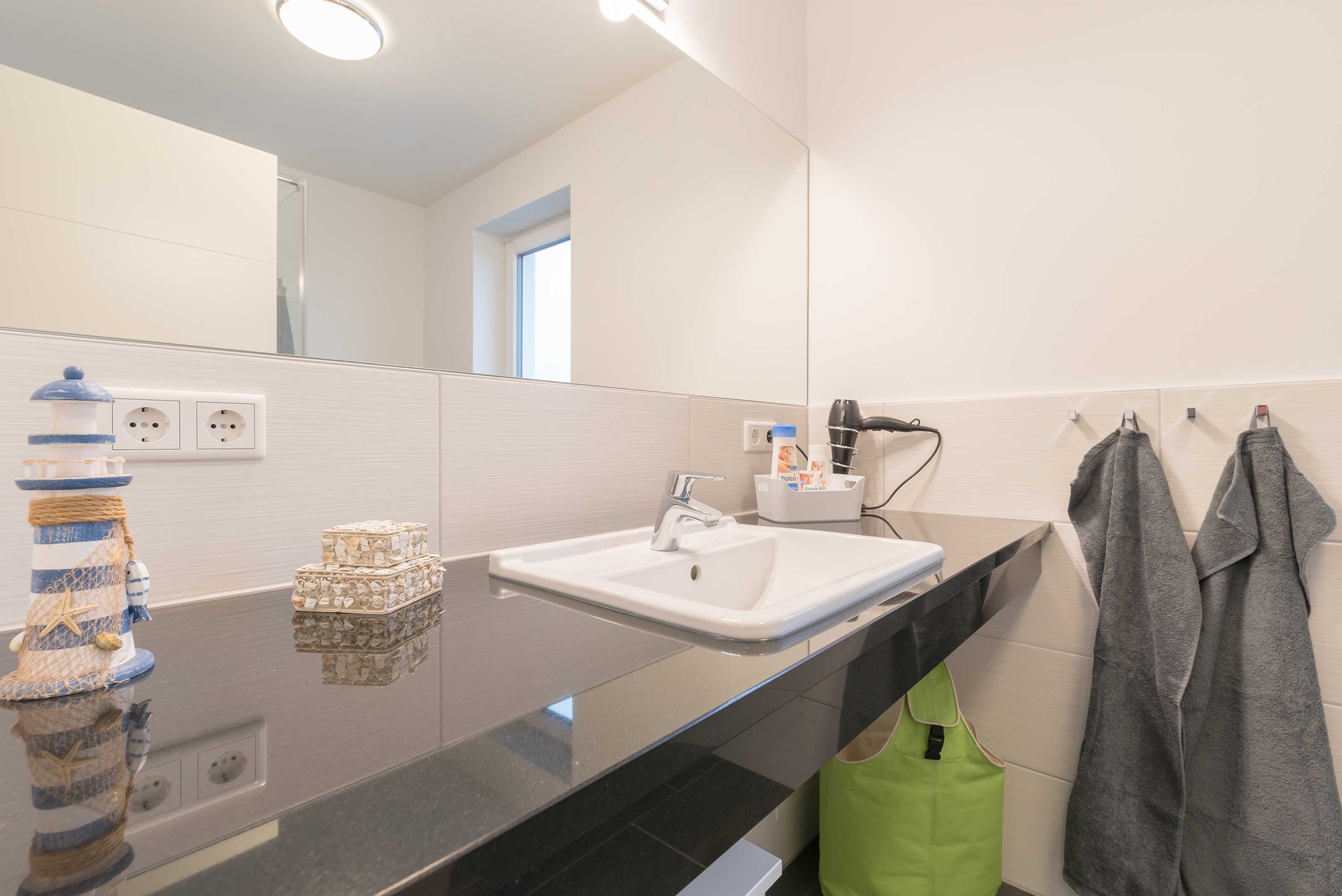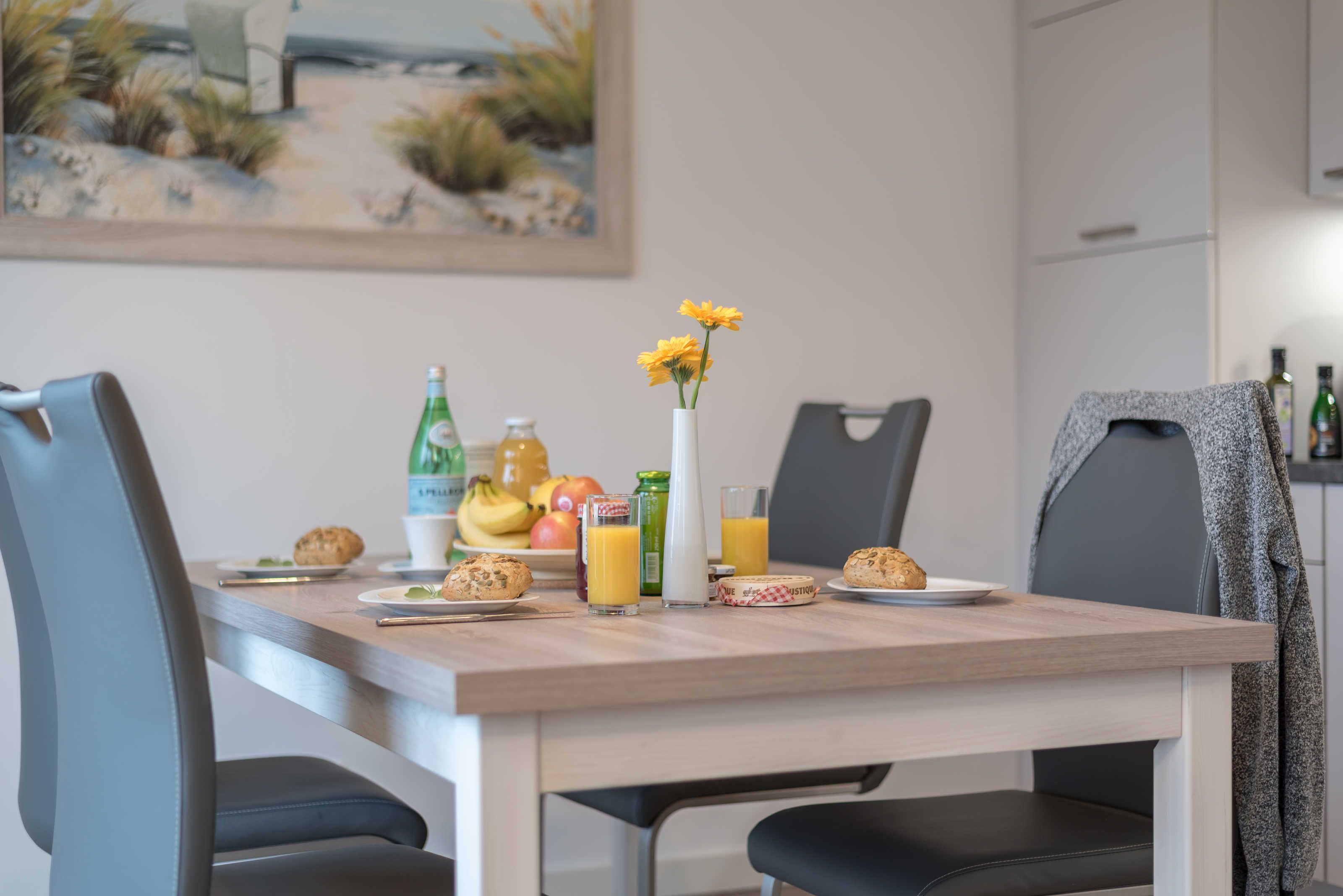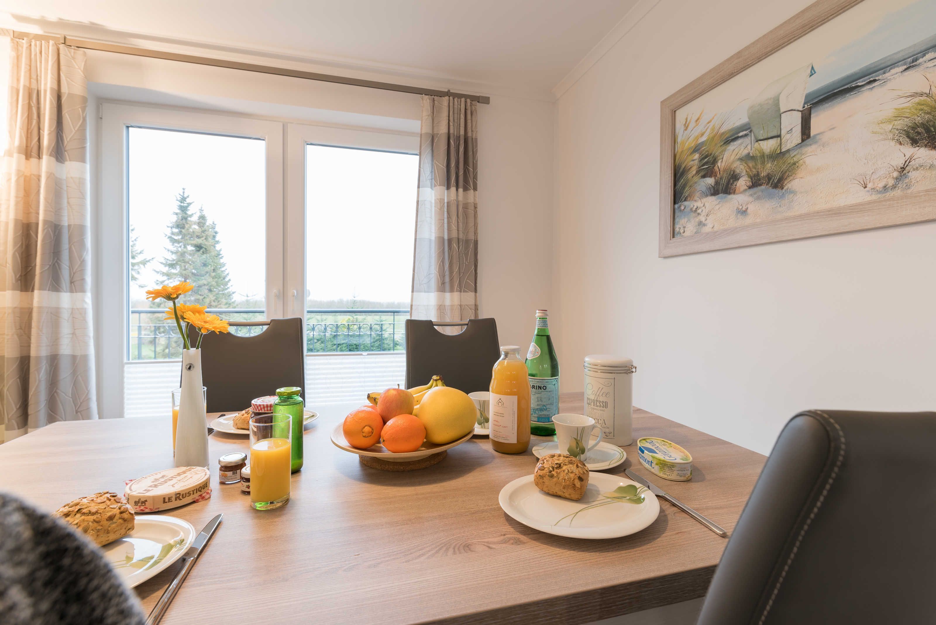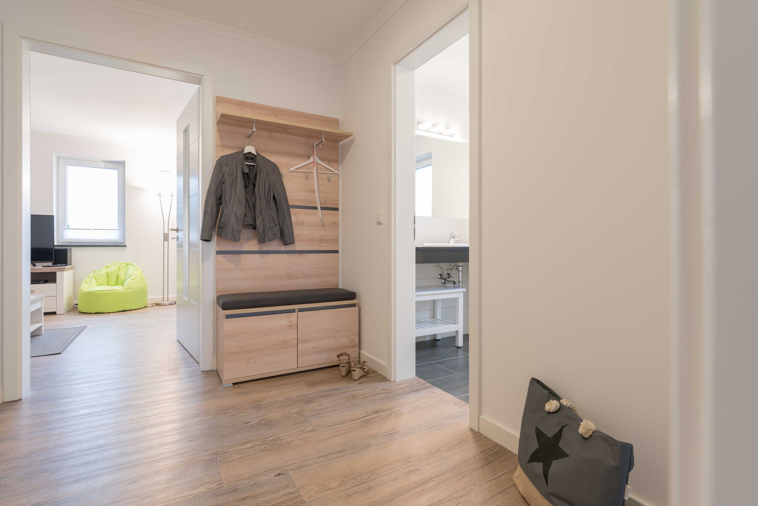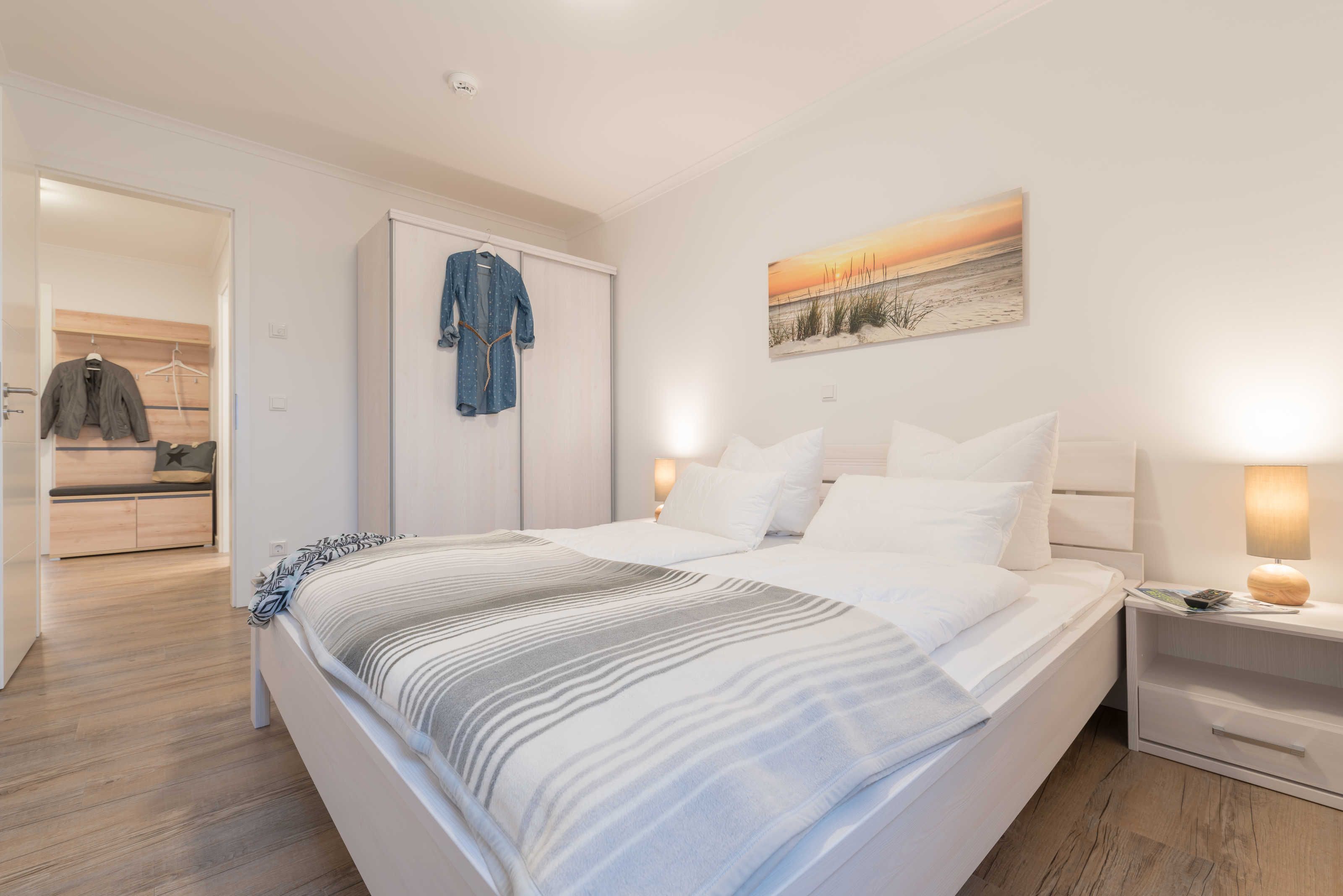 Die im maritimen Stil eingerichtete 3-Zimmer Wohnung besteht aus großzügigem Schlafzimmer, einem zweiten Schlafraum, einem kombiniertem Wohn-Esszimmer mit offener Einbauküche, einem Bad mit ebenerdiger Dusche sowie einem Abstellraum. Im hell eingerichteten Wohnzimmer laden eine gemütliche Couch sowie ein großer Esstisch, der vier Personen bequem Platz bietet, zum Verweilen ein. Die bodentiefen Fensterelemente sorgen für lichtdurchfluteten Wohngenuss und bieten Zugang zum Balkon. Die Fußbodenheizung und die einstellbare Lüftung sorgen in allen Jahreszeiten für ein angenehmes Raumklima und Gemütlichkeit. Weiterhin verfügt die Ferienwohnung über zwei separate Schlafräume. Im größeren Schlafzimmer stehen ein Doppelbett (1,90 m x 2,00 m) und ein geräumiger Kleiderschrank. Im zweiten Schlafzimmer befinden sich ein Duobett mit ausziehbarem Unterbett (0,90 m x 2,00 m) sowie ein weiterer Kleiderschrank. Die Flatscreen-TV´s in Wohn- und Schlafzimmer, ein Blu-Ray-Player und eine Stereo-Anlage gehören zur modernen Ausstattung dieser Ferienwohnung. Die Einbauküche verfügt über einen Geschirrspüler, einen Kühlschrank mit Gefrierfach, einen Backofen, ein Cerankochfeld, eine Mikrowelle, einen Toaster, eine Kaffeemaschine, einen Wasserkocher und vom Kochtopf bis zum Eierbecher über eine komplette Küchenausstattung. Das helle Badezimmer mit Fenster und ebenerdiger Dusche ist ausgestattet mit einem Waschtisch inklusive großem Spiegel, einem Haartrockner und Abstellmöglichkeiten für Ihre Waschutensilien. Im Abstellraum der Wohnung finden Sie eine Waschmaschine (4 kg), ein Wäschegestell, einen Staubsauger und haben Platz zur Lagerung.