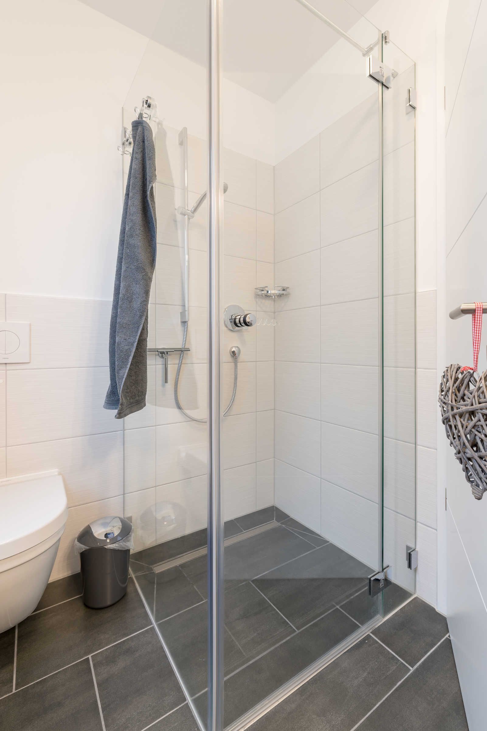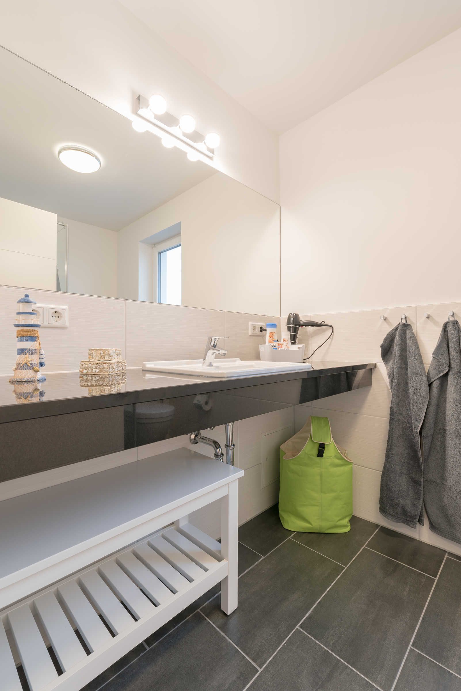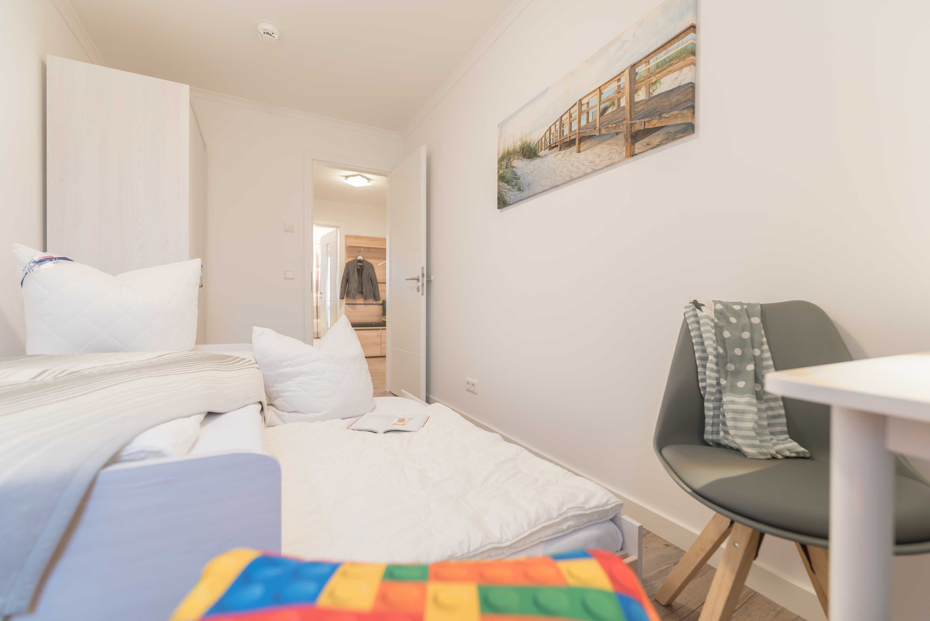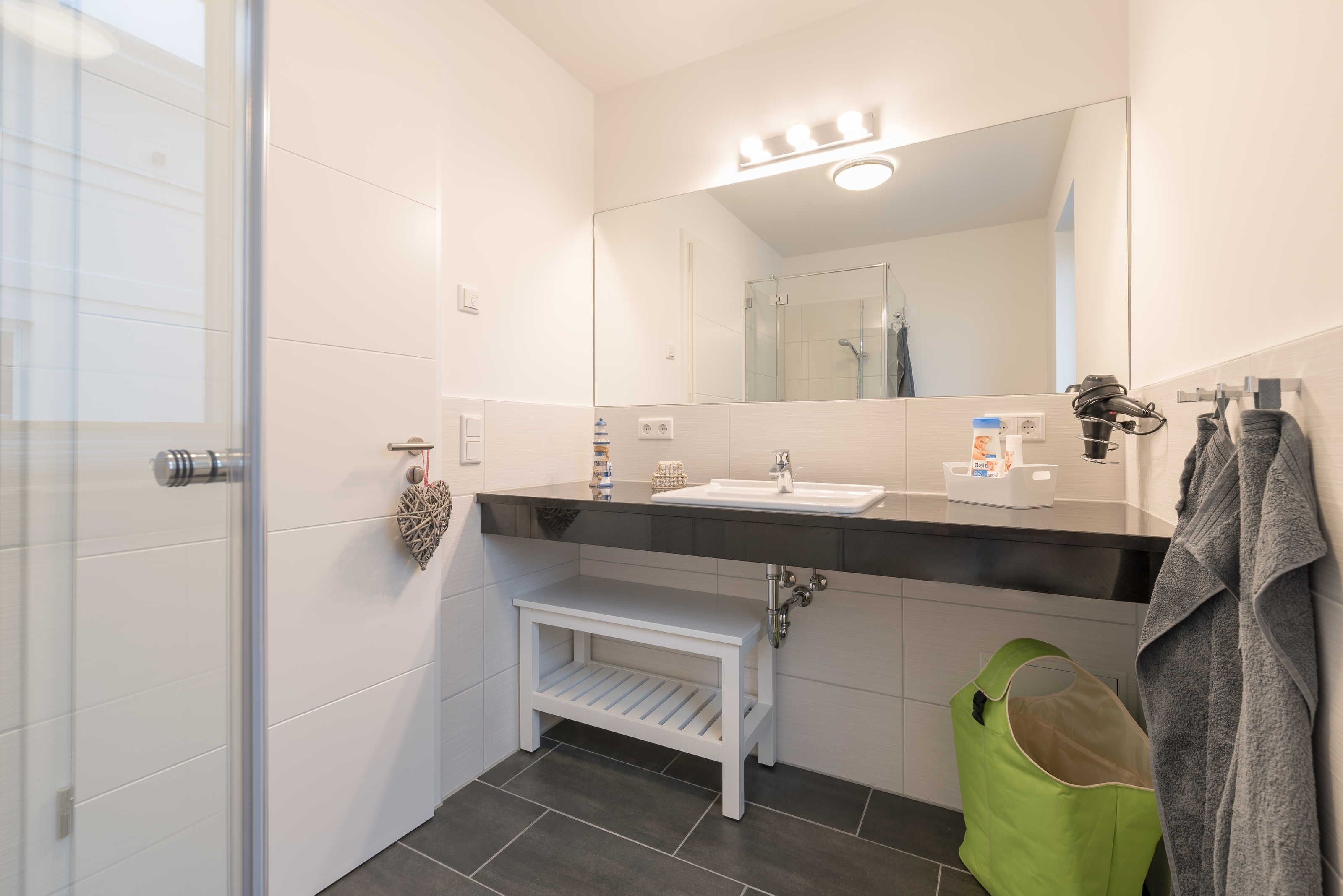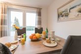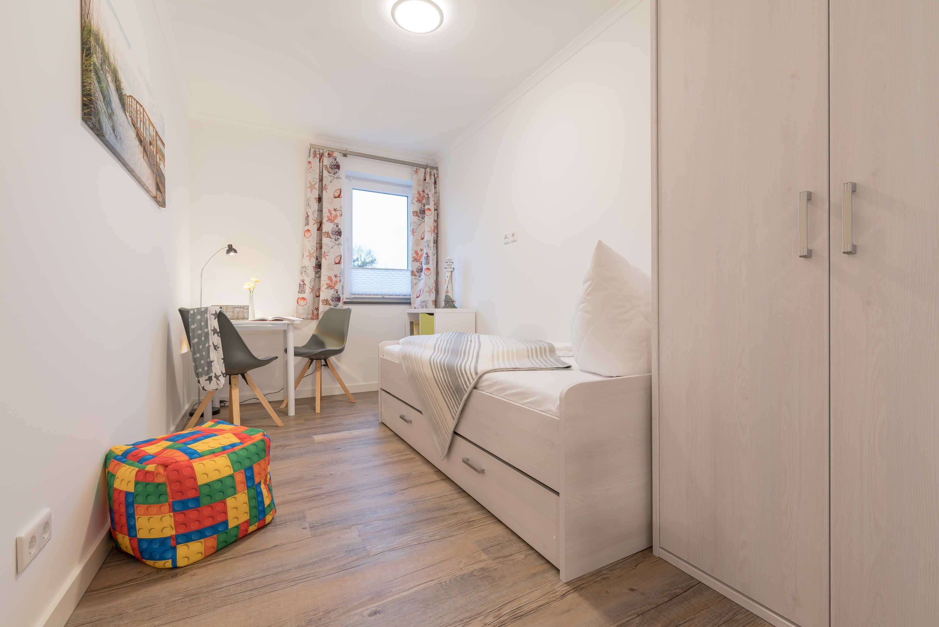 Die im maritimen Stil eingerichtete 3-Zimmer Wohnung besteht aus großzügigem Schlafzimmer, einem zweiten Schlafraum, einem kombiniertem Wohn-Esszimmer mit offener Einbauküche, einem Bad mit ebenerdiger Dusche sowie einem Abstellraum. Im hell eingerichteten Wohnzimmer laden eine gemütliche Couch sowie ein großer Esstisch, der vier Personen bequem Platz bietet, zum Verweilen ein. Die bodentiefen Fensterelemente sorgen für lichtdurchfluteten Wohngenuss und bieten Zugang zum Balkon. Die Fußbodenheizung und die einstellbare Lüftung sorgen in allen Jahreszeiten für ein angenehmes Raumklima und Gemütlichkeit. Weiterhin verfügt die Ferienwohnung über zwei separate Schlafräume. Im größeren Schlafzimmer stehen ein Doppelbett (1,90 m x 2,00 m) und ein geräumiger Kleiderschrank. Im zweiten Schlafzimmer befinden sich ein Duobett mit ausziehbarem Unterbett (0,90 m x 2,00 m) sowie ein weiterer Kleiderschrank. Die Flatscreen-TV´s in Wohn- und Schlafzimmer, ein Blu-Ray-Player und eine Stereo-Anlage gehören zur modernen Ausstattung dieser Ferienwohnung. Die Einbauküche verfügt über einen Geschirrspüler, einen Kühlschrank mit Gefrierfach, einen Backofen, ein Cerankochfeld, eine Mikrowelle, einen Toaster, eine Kaffeemaschine, einen Wasserkocher und vom Kochtopf bis zum Eierbecher über eine komplette Küchenausstattung. Das helle Badezimmer mit Fenster und ebenerdiger Dusche ist ausgestattet mit einem Waschtisch inklusive großem Spiegel, einem Haartrockner und Abstellmöglichkeiten für Ihre Waschutensilien. Im Abstellraum der Wohnung finden Sie eine Waschmaschine (4 kg), ein Wäschegestell, einen Staubsauger und haben Platz zur Lagerung.