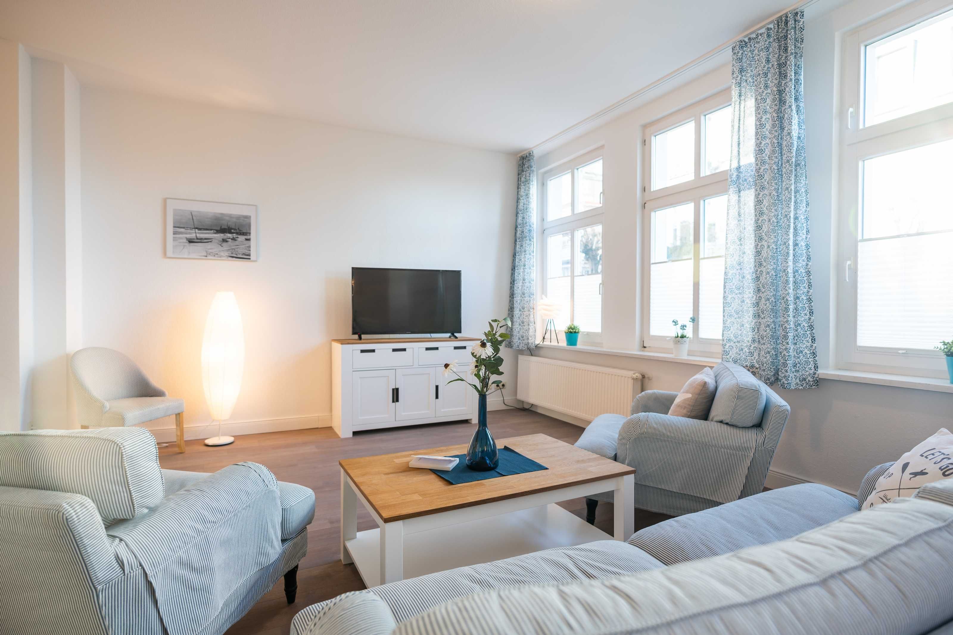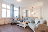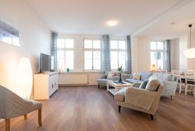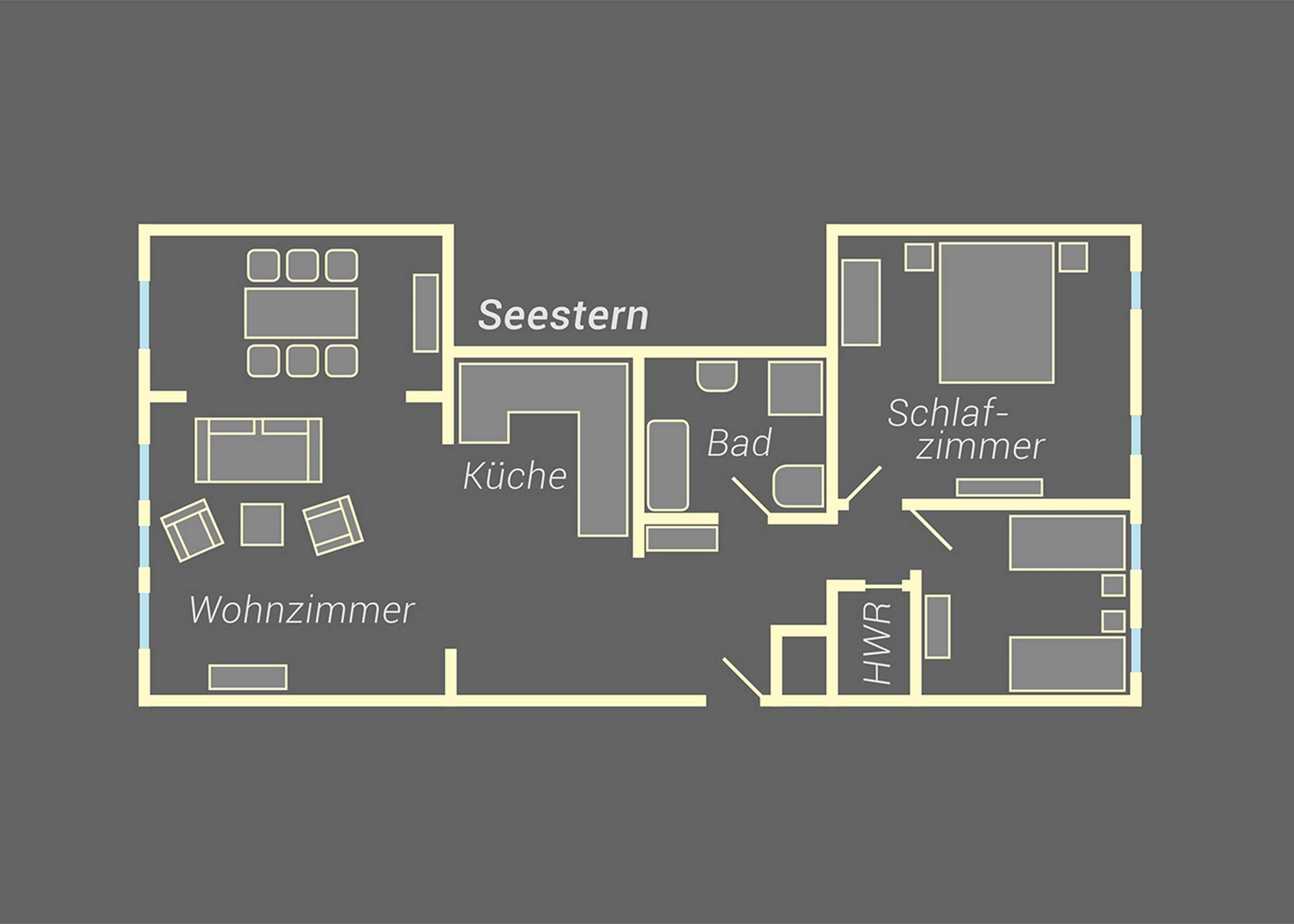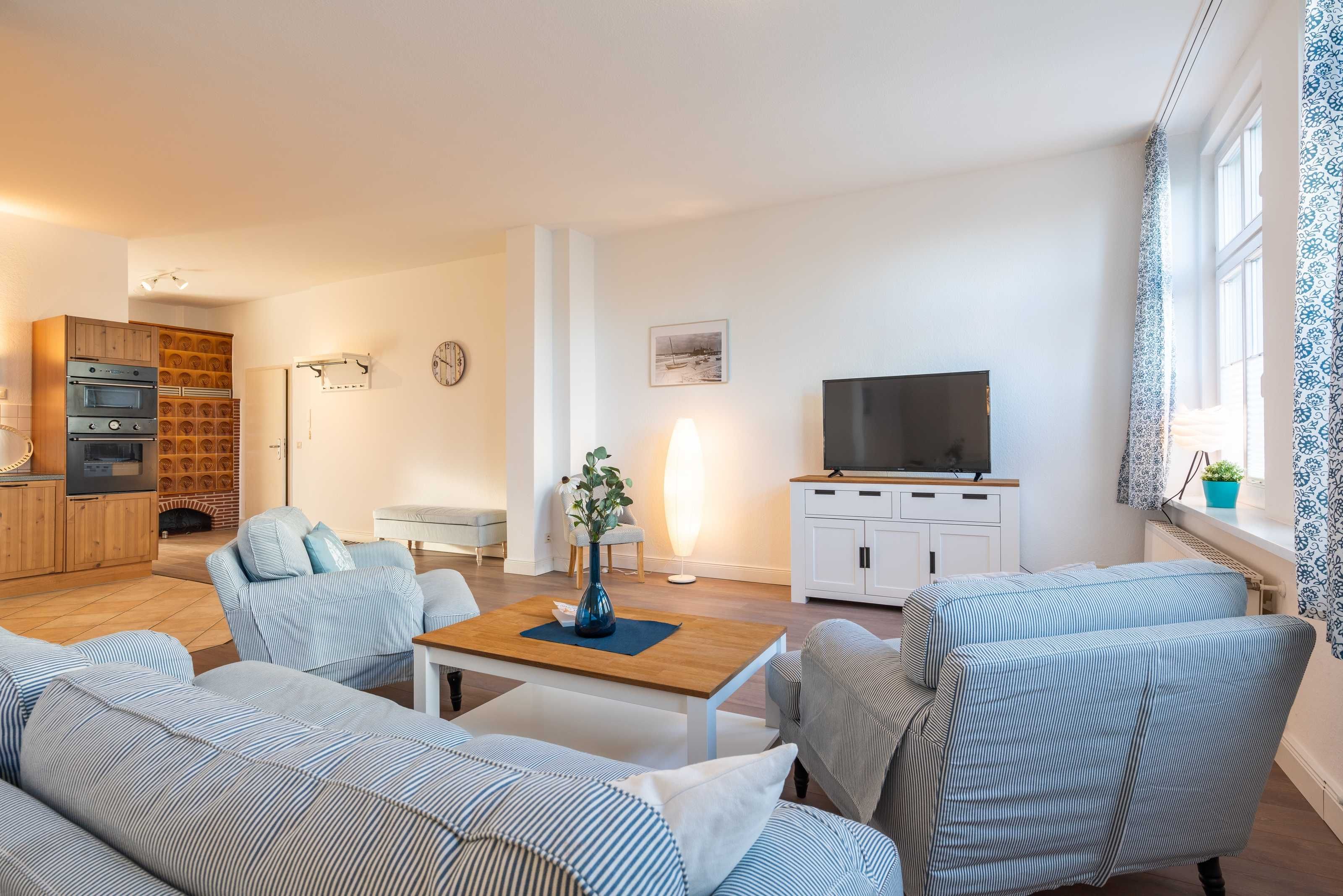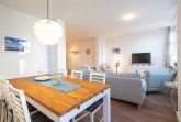 Das 85 qm große Appartement Seestern verfügt über geräumiges Wohnzimmer mitgemütlicher Wohnlandschaft und einen großen Essplatz. Die offene Küche ist komplett mit Spülmaschine, Mikrowelle, Herd und Backofen ausgestattet und lässt keine Wünsche offen, um eine tolle Mahlzeit zuzubereiten.