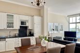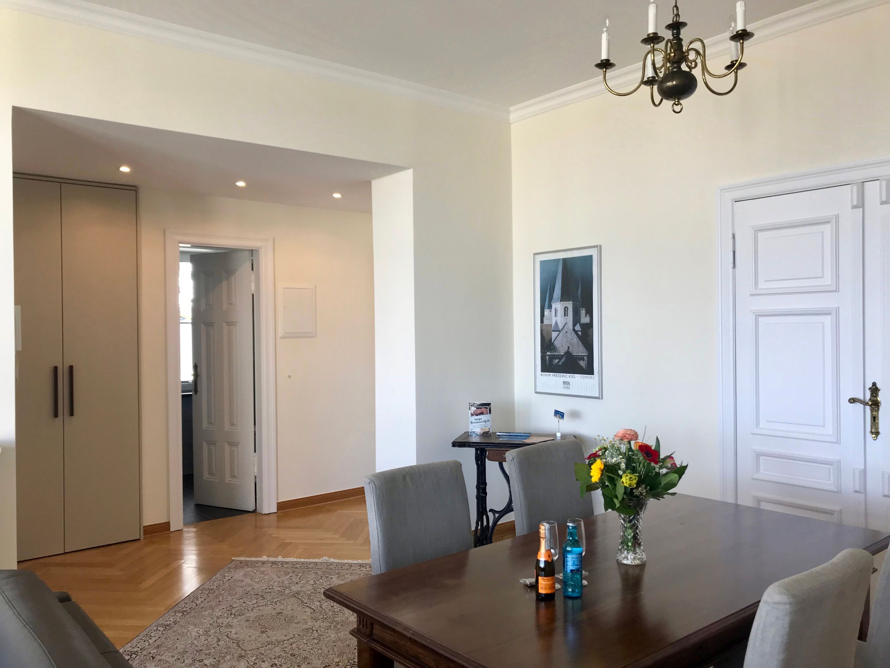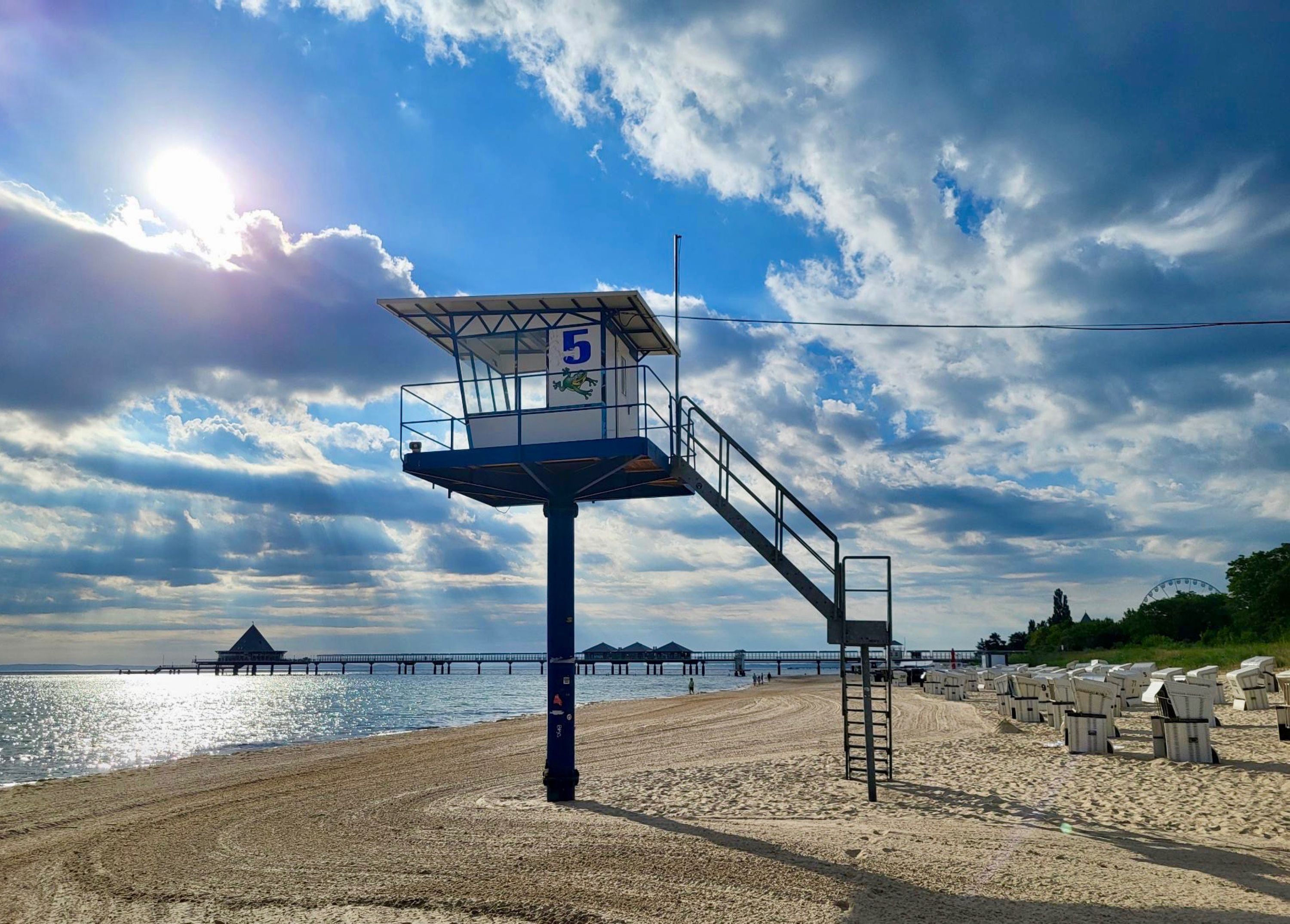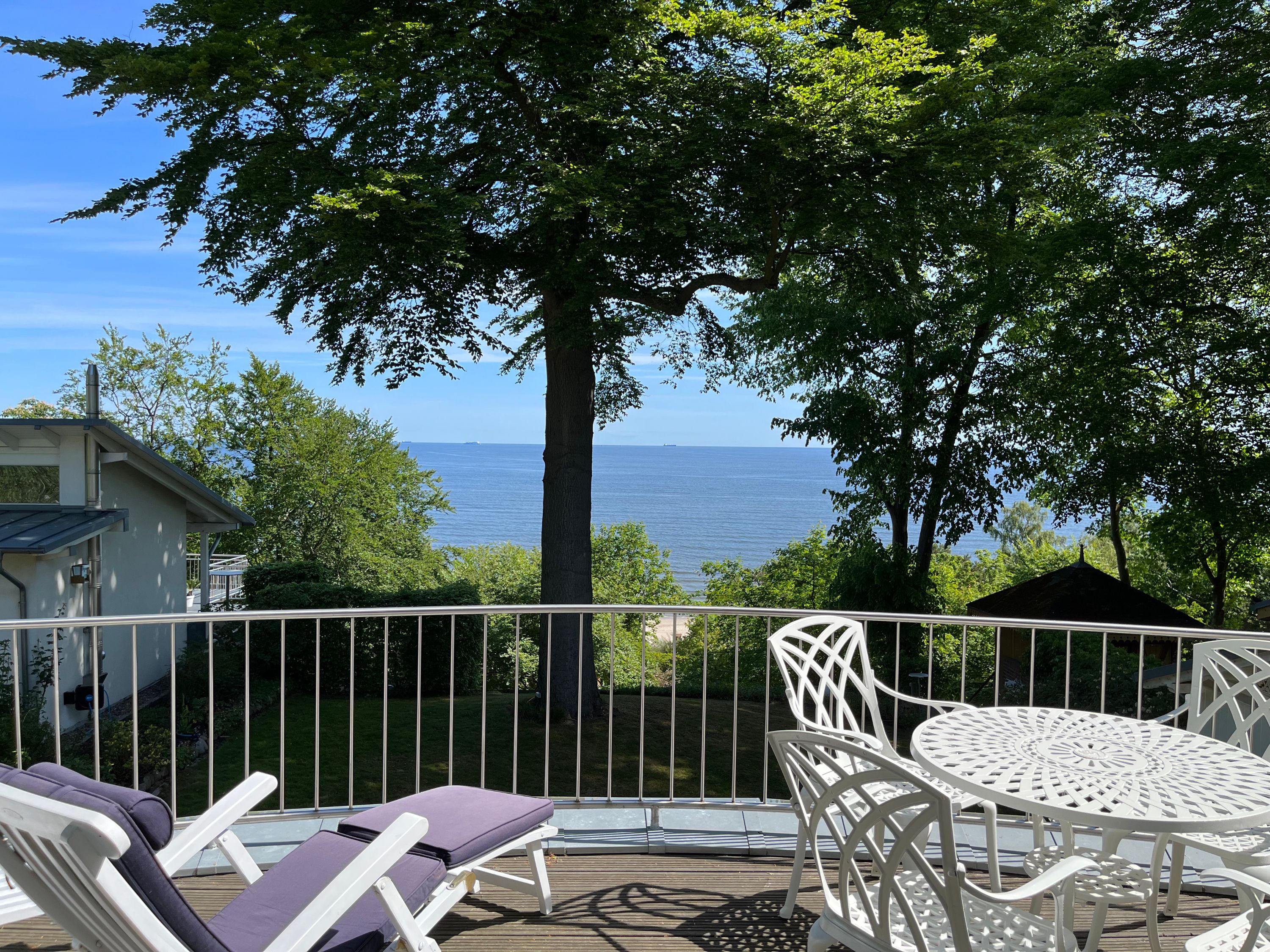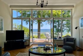Diese ca. 65 qm große Wohnung ist ein wahrer Logenplatz am Meer. Durch die großen Fensterfassaden ist die Ostsee immer präsent. Dieser Blick auf die Ostsee ist zu jeder Jahreszeit beeindruckend. Im Sommer das satte Grün der Bäume und das herrliche Blau des Meeres, mit Schiffen am Horizont, mit Möwengeschrei und dem vom Strand herauf wehenden Lachen der Badenden. Und bei all dem ist man ganz für sich und kann erholsam die Seele baumeln lassen.
