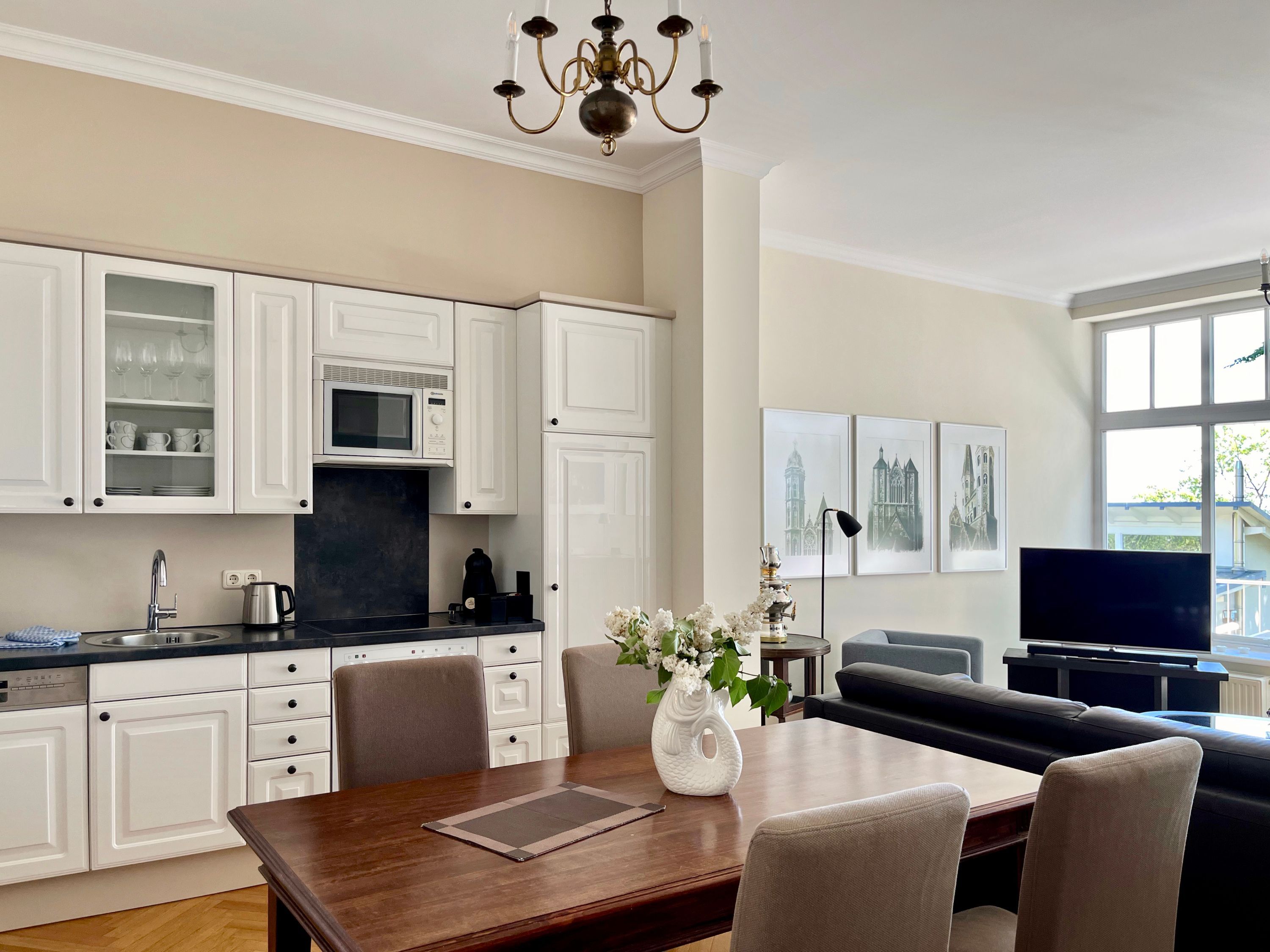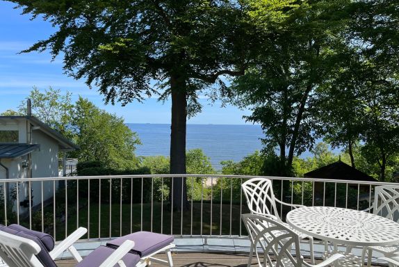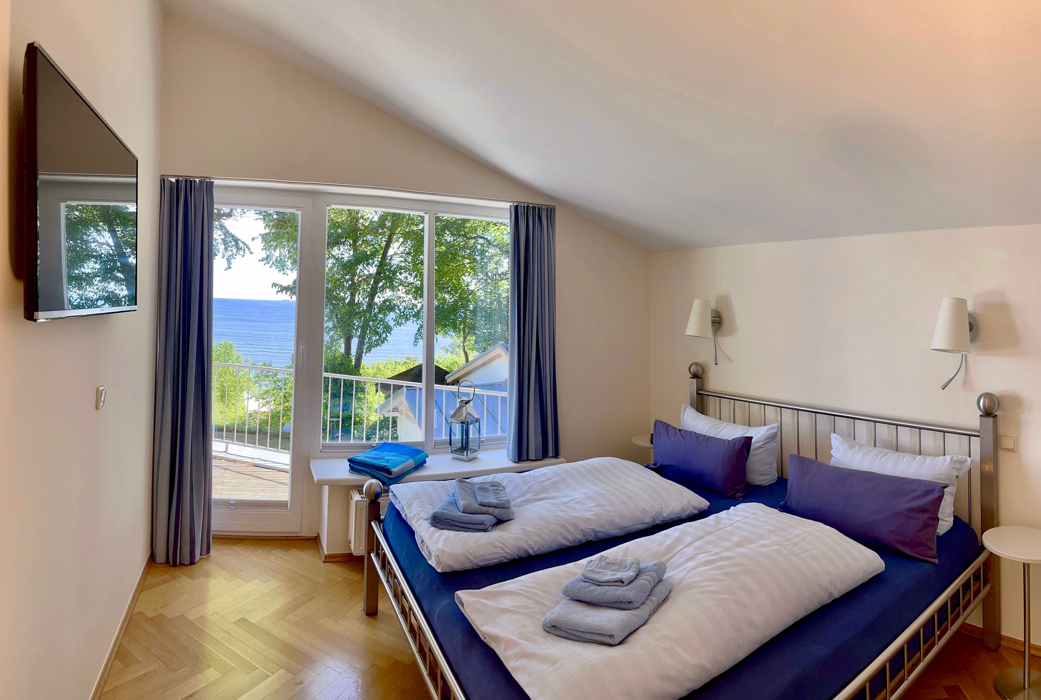 Komfortable Ferienwohnung mit Meerblick aus dem Wohn- und Schlafzimmer. Von der großzügigen Terrasse mit Liegestühlen und Essplatz genießen Sie einen herrlichen Blick auf die Ostsee. All unsere Wohnungen sind geschmackvoll und individuell eingerichtet. Das Schlafzimmer ist mit einem manufakturgefertigten Edelstahlbett, Einbauschrank incl. Safe, Flachbild-TV und Verdunklung ausgestattet, die Terrassentür ist mit Insektenschutz versehen. Ausgesuchte Möbelstücke und Bilder des Braunschweiger Künstlers Achim Kiel, Echtholz-Parkett - teils mit hochwertigen Teppichen belegt prägen den Stil des Hauses. Als zusätzliche Schlafgelegenheit befindet sich im Wohnbereich eine komfortable ausklappbare Ledercouch. Zur Ausstattung gehört ein Smart-TV mit Soundbar - zur einfachen Verbindung mit Ihrem Smartphone, iPad oder anderen bluetoothfähigen Geräten - sowie ein DVD-Player. In den Wohn-/Essbereich integriert ist ein Tisch für vier Personen und eine komplett ausgestattete Küchenzeile (Kühlschrank mit Gefrierfach, Backofen, Cerankochfeld, Dunstabzug, Mikrowelle, Toaster, Wasserkocher, Filter-Kaffeemaschine u. Nespresso-Kapselmaschine, Rührgerät etc.). Das Badezimmer ist ein Tageslicht-Bad mit Dusche.