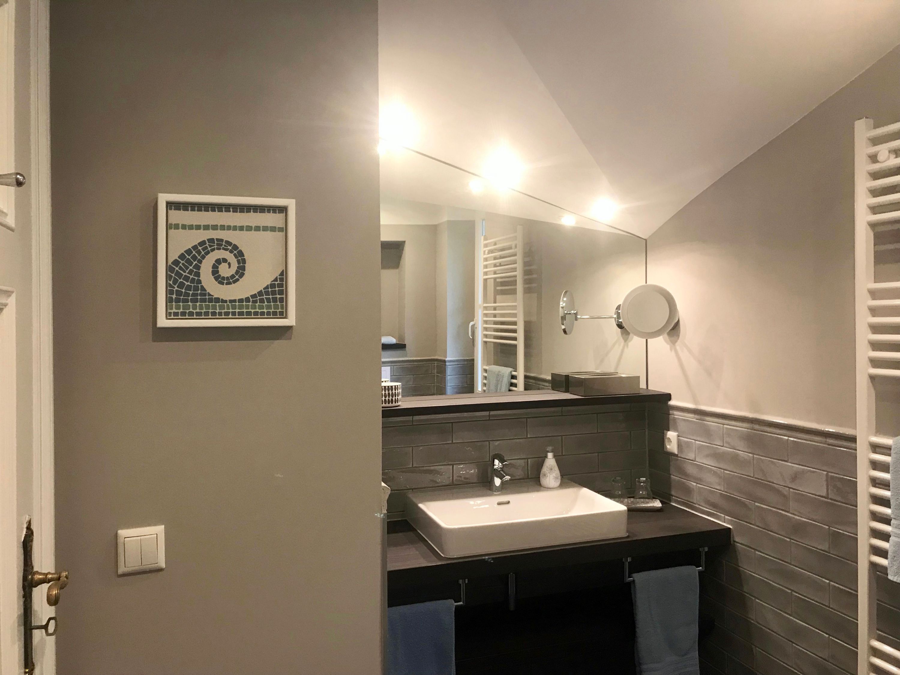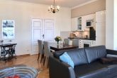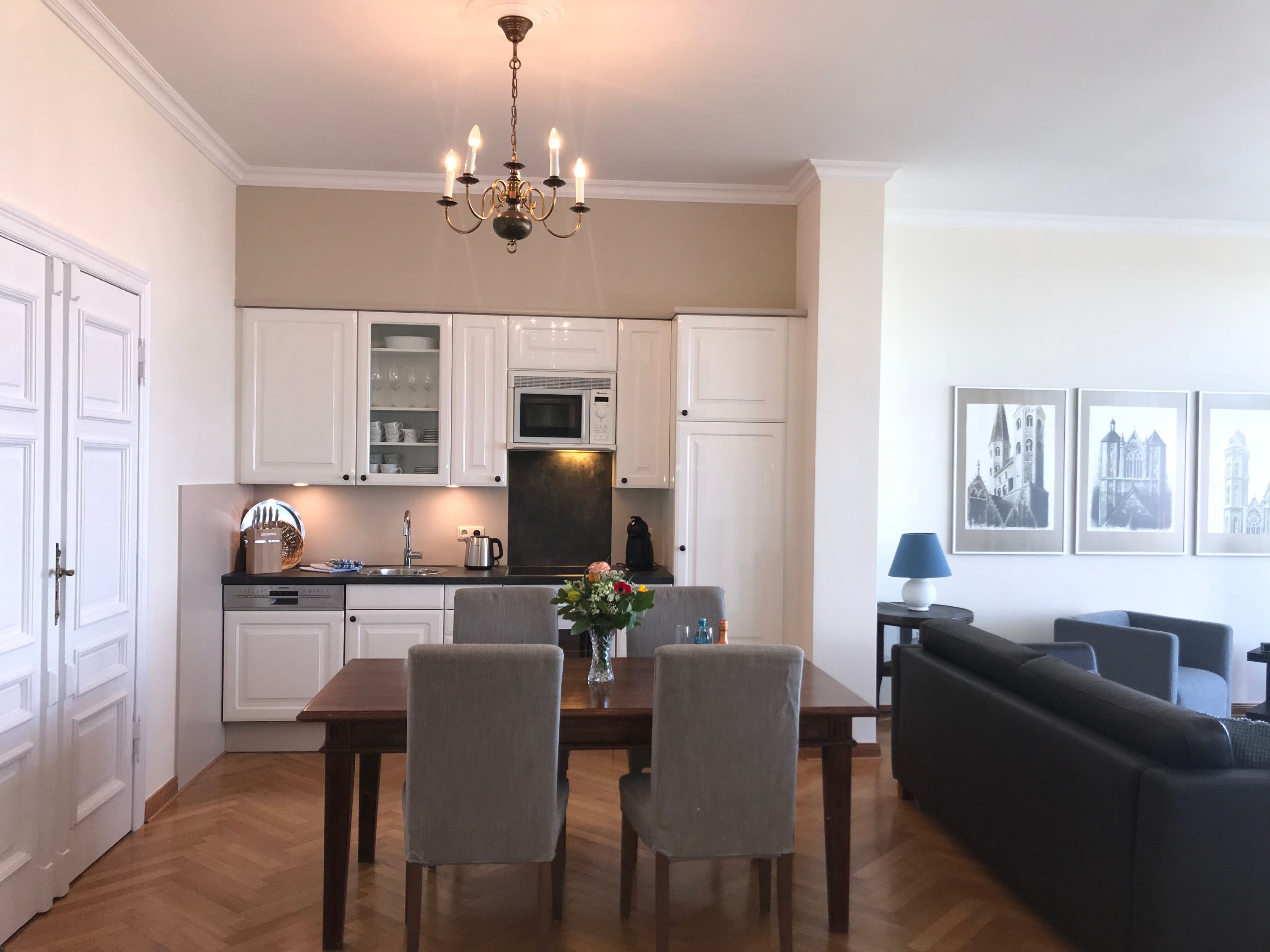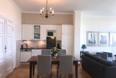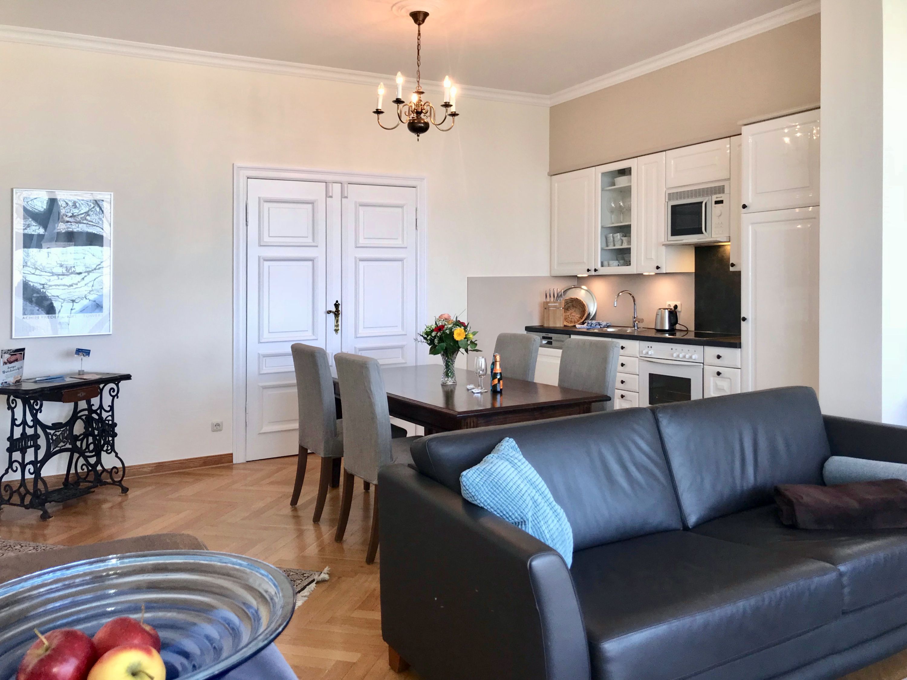 Komfortable Ferienwohnung mit Meerblick aus dem Wohn- und Schlafzimmer. Von der großzügigen Terrasse mit Liegestühlen und Essplatz genießen Sie einen herrlichen Blick auf die Ostsee. All unsere Wohnungen sind geschmackvoll und individuell eingerichtet. Das Schlafzimmer ist mit einem manufakturgefertigten Edelstahlbett, Einbauschrank incl. Safe, Flachbild-TV und Verdunklung ausgestattet, die Terrassentür ist mit Insektenschutz versehen. Ausgesuchte Möbelstücke und Bilder des Braunschweiger Künstlers Achim Kiel, Echtholz-Parkett - teils mit hochwertigen Teppichen belegt prägen den Stil des Hauses. Als zusätzliche Schlafgelegenheit befindet sich im Wohnbereich eine komfortable ausklappbare Ledercouch. Zur Ausstattung gehört ein Smart-TV mit Soundbar - zur einfachen Verbindung mit Ihrem Smartphone, iPad oder anderen bluetoothfähigen Geräten - sowie ein DVD-Player. In den Wohn-/Essbereich integriert ist ein Tisch für vier Personen und eine komplett ausgestattete Küchenzeile (Kühlschrank mit Gefrierfach, Backofen, Cerankochfeld, Dunstabzug, Mikrowelle, Toaster, Wasserkocher, Filter-Kaffeemaschine u. Nespresso-Kapselmaschine, Rührgerät etc.). Das Badezimmer ist ein Tageslicht-Bad mit Dusche.