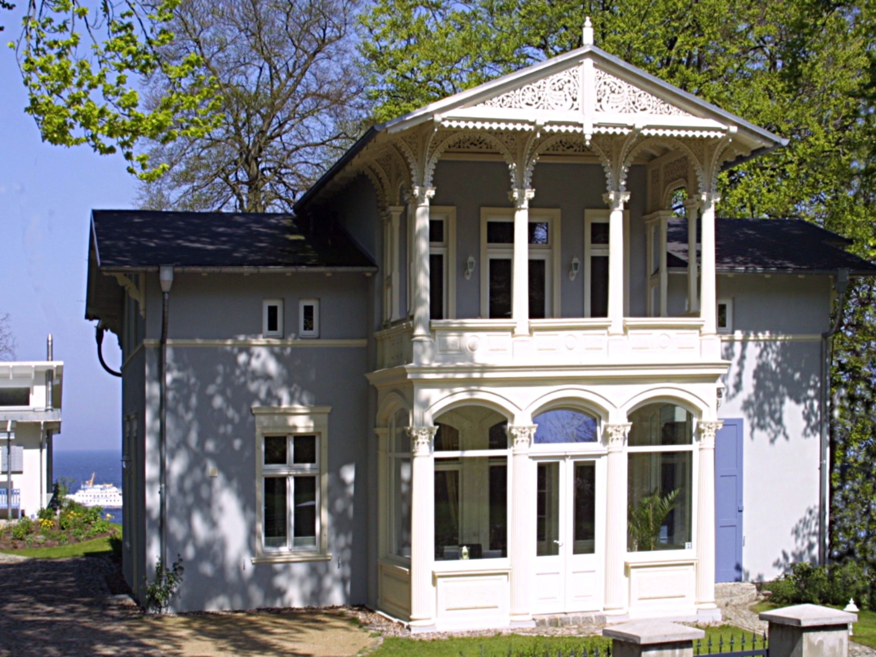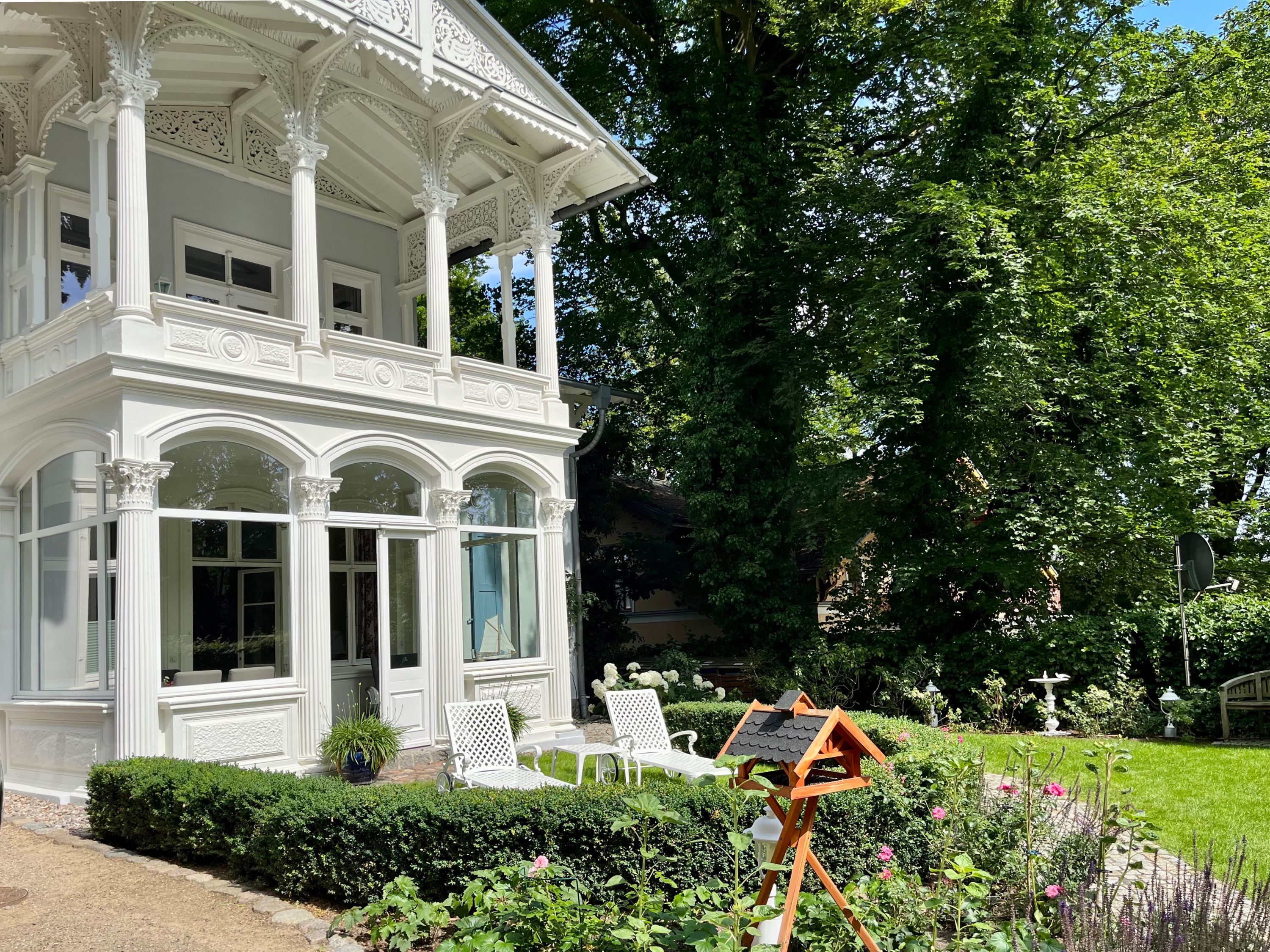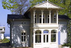 Die bezaubernde 5-Sterne-Villa (erbaut im Jahre 1845) ist eine der ältesten erhaltenen Villen Heringsdorfs. Erhaben liegt sie - mit phantastischem Blick - auf der Anhöhe des Kulms, auf einem großzügigen, gepflegten Grundstück mit altem Baumbestand. Meerseitig wurde das Haus erweitert und öffnet sich zur Ostsee mit Meerblick aus allen Wohnungen. Viele Stammgäste kehren immer wieder an diesen erholsamen Ort zurück und schätzen das inhabergeführte Haus.