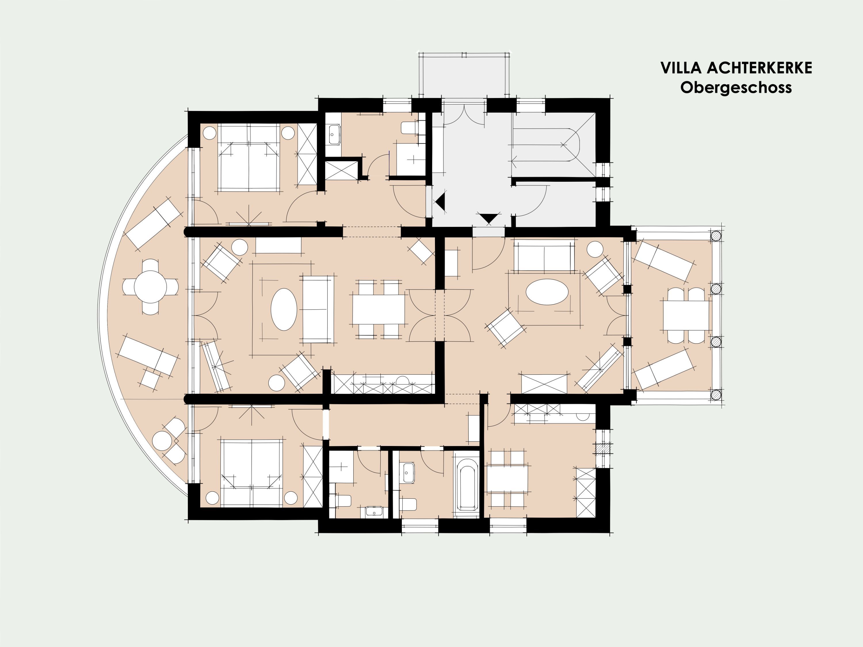 Sie bewohnen großzügig eine komplette Etage der Villa mit zwei Schlafzimmern und Bädern. Dabei genießen Sie die vorteilhafte Ausrichtung des Hauses mit dem herrlichen Meerblick auf der Nord-Ost-Seite und dem historischen Verandenvorbau auf der Süd-West-Seite, mit Sonnenschein bis in die Abendstunden. Da eine Etage aus zwei miteinander verbundenen Wohnungen besteht, kann durch Schließen der zweiflügeligen Verbindungstüren eine Trennung der Wohnbereiche vorgenommen werden. Ausgesuchte Möbelstücke und Bilder, Echtholz-Parkett - teils mit hochwertigen Teppichen belegt – prägen den Stil des Hauses. Die Meerblick-Schlafzimmer sind mit manufakturgefertigten Edelstahlbetten, Einbauschränken incl. Safe, Flachbild-TV sowie Verdunklung und Insektenschutz ausgestattet. Komfortable Leder(Schlaf)couches in den Wohnzimmern können als zusätzliche Schlafgelegenheiten genutzt werden. Zum Inventar gehören weiterhin Smart-TV`s mit Soundbar - zur einfachen Verbindung mit dem Smartphone, iPad oder einem anderen bluetoothfähigen Gerät - sowie DVD-Player. Es steht eine komplett ausgestattete, in sich abgeschlossene Küche (Kühlschrank mit Gefrierfach, Backofen, Cerankochfeld, Dunstabzug, Mikrowelle, Toaster, Wasserkocher, Filter-Kaffeemaschine u. Nespresso-Kapselmaschine, Rührgerät etc.) zur Verfügung. In den meerseitigen Wohnbereich ist eine weitere komplett ausgestattete Küchenzeile integriert. Bei den Bädern handelt es sich um Tageslicht-Badezimmer, wobei ein Bad zusätzlich mit einer Badewanne ausgestattet ist.