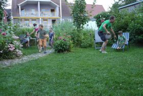 Der große, lebendig gestaltete Garten lädt zum Verweilen, Ausspannen und Spielen ein.