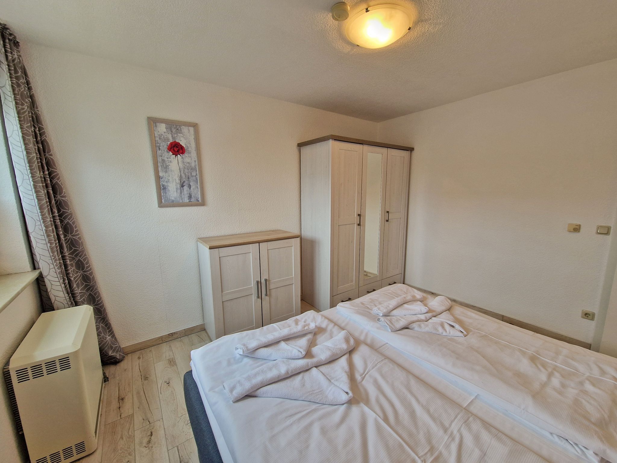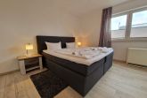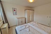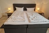 Schlafzimmer mit Doppelbett, je ein Nachttisch und Leselampe, einen Kleiderschrank