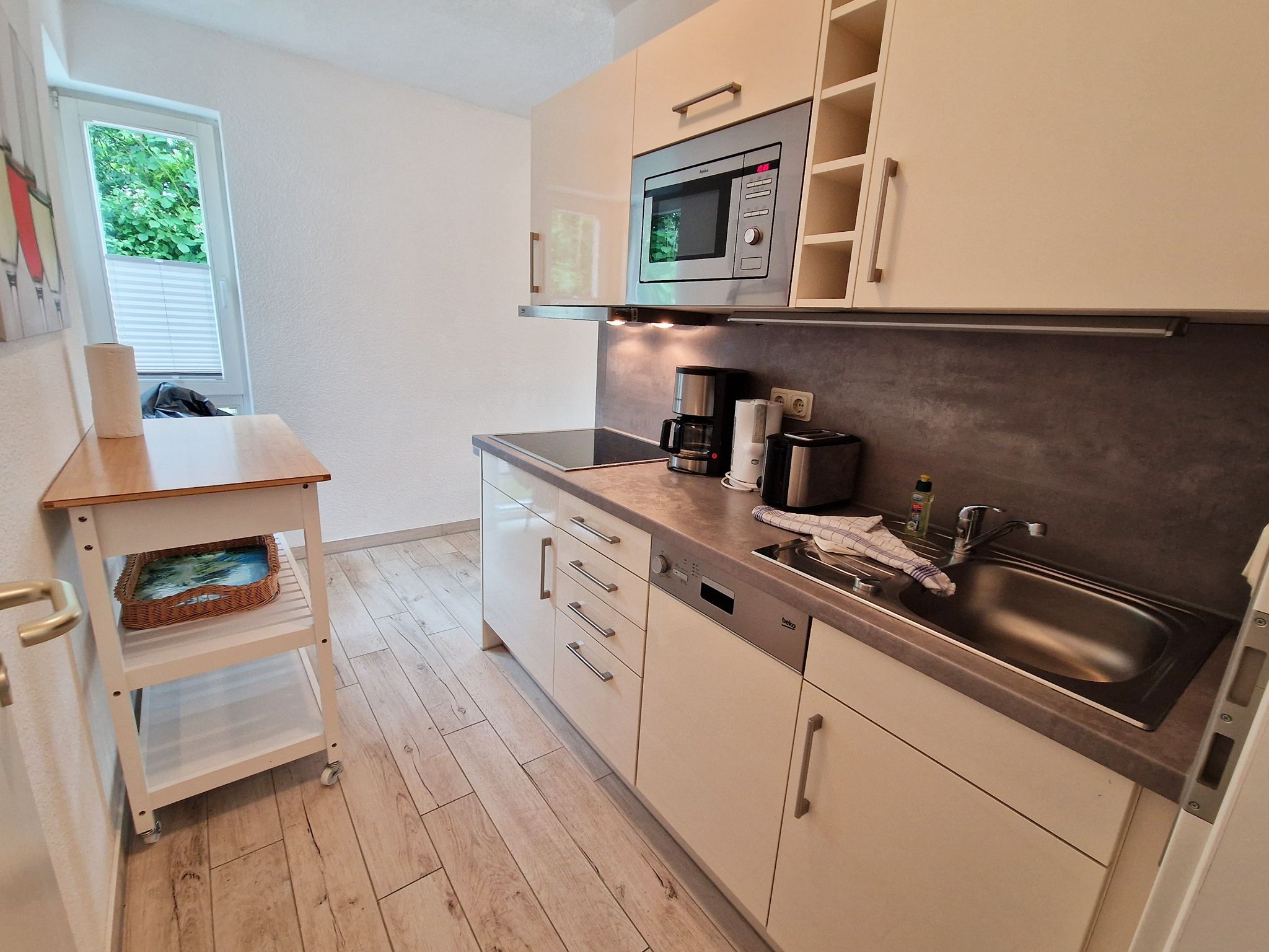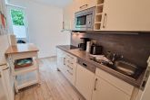 Kleine Küche ausgestattet mit Herd, Kaffeemaschine, Wasserkocher, Toaster und diversen Küchenutensilien