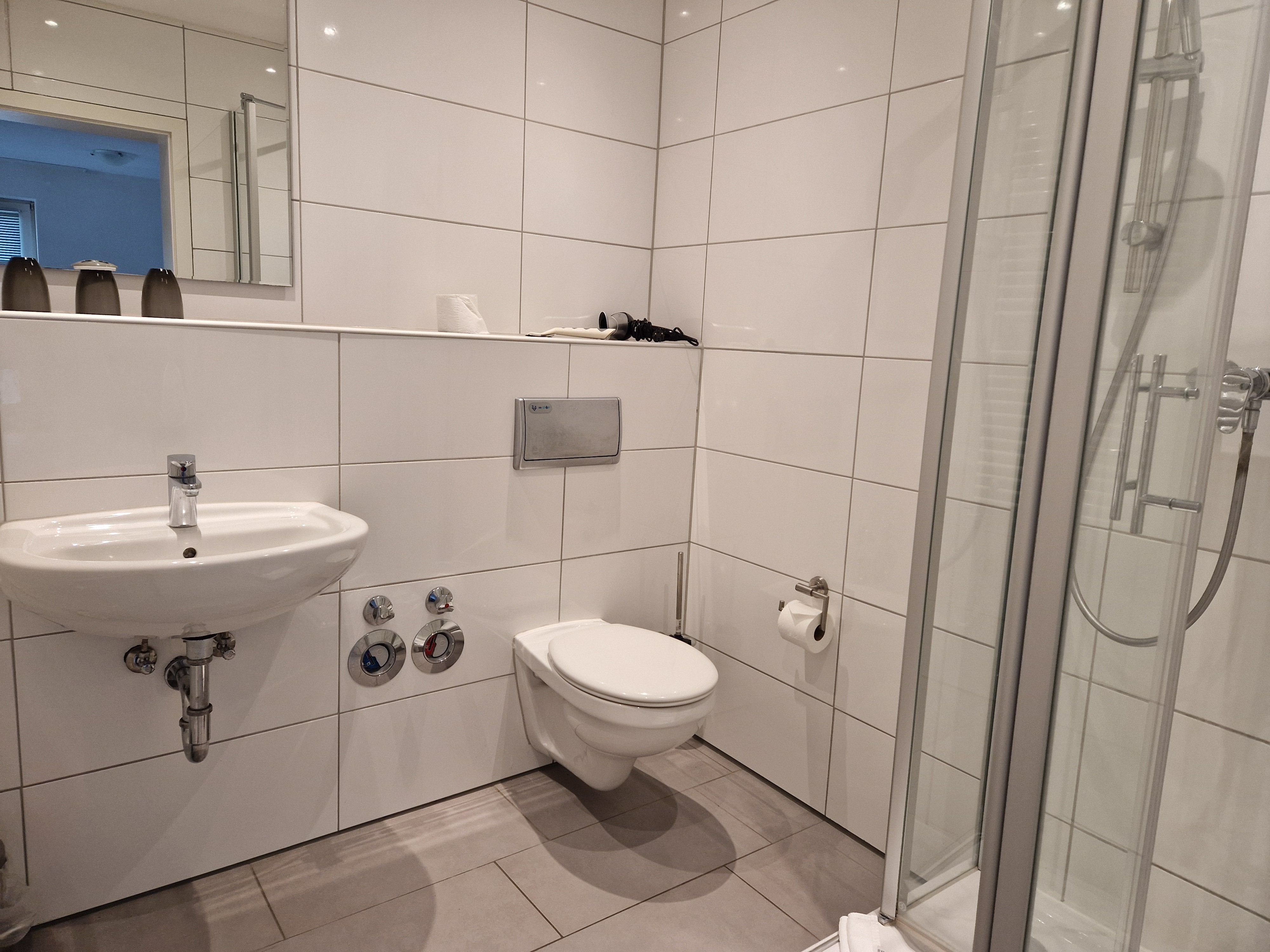 Ein Badezimmer mit Dusche und WC