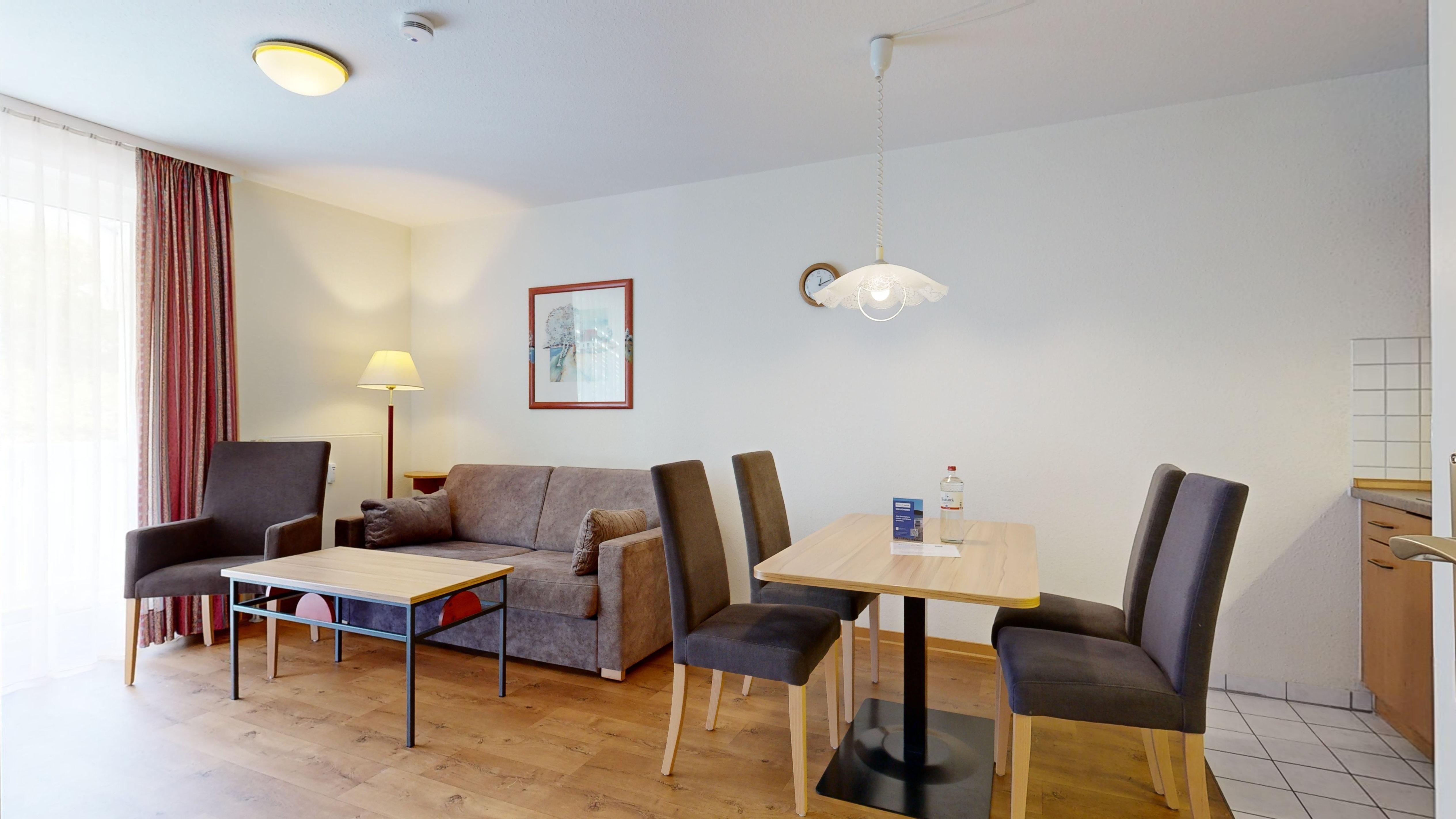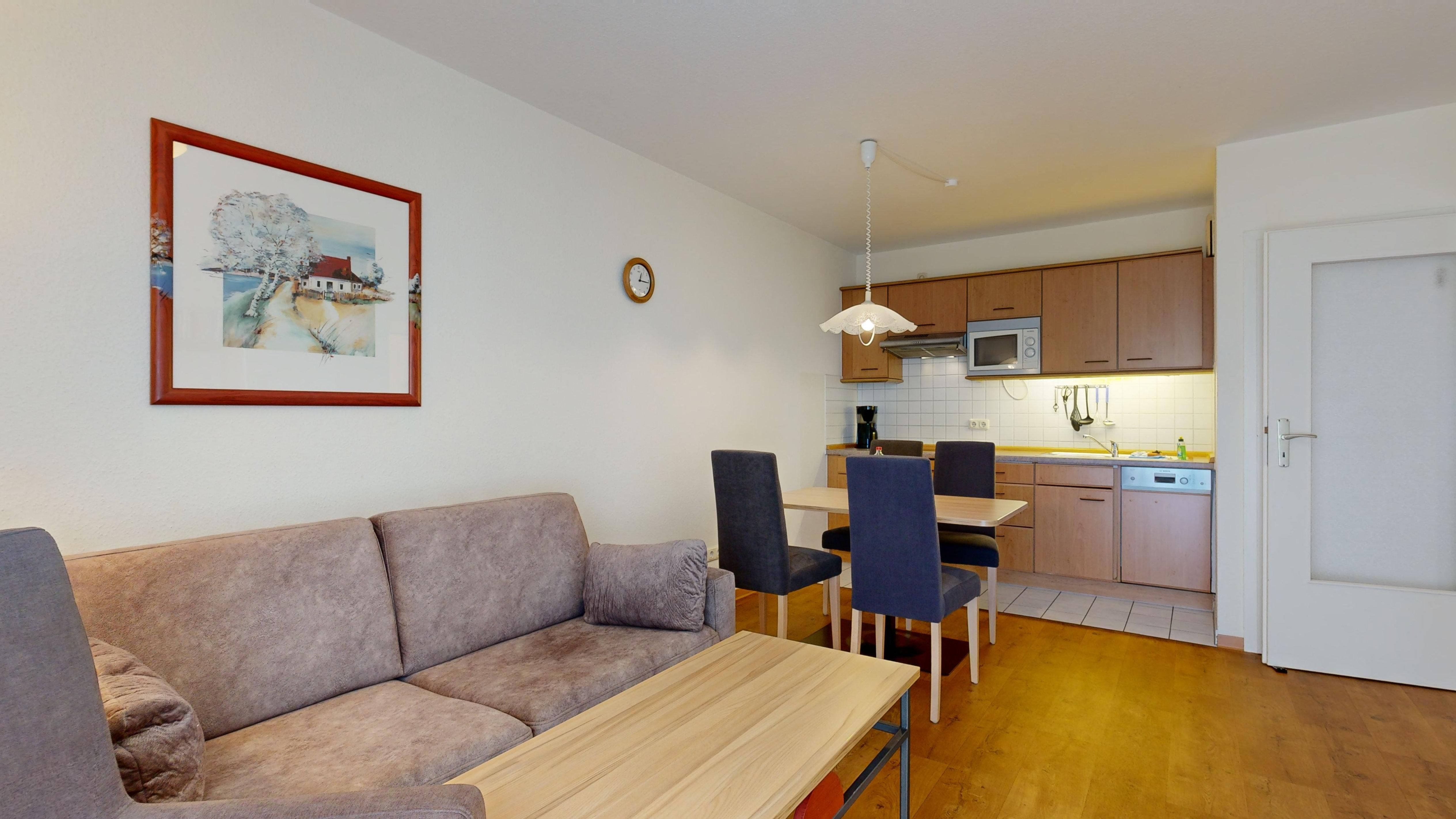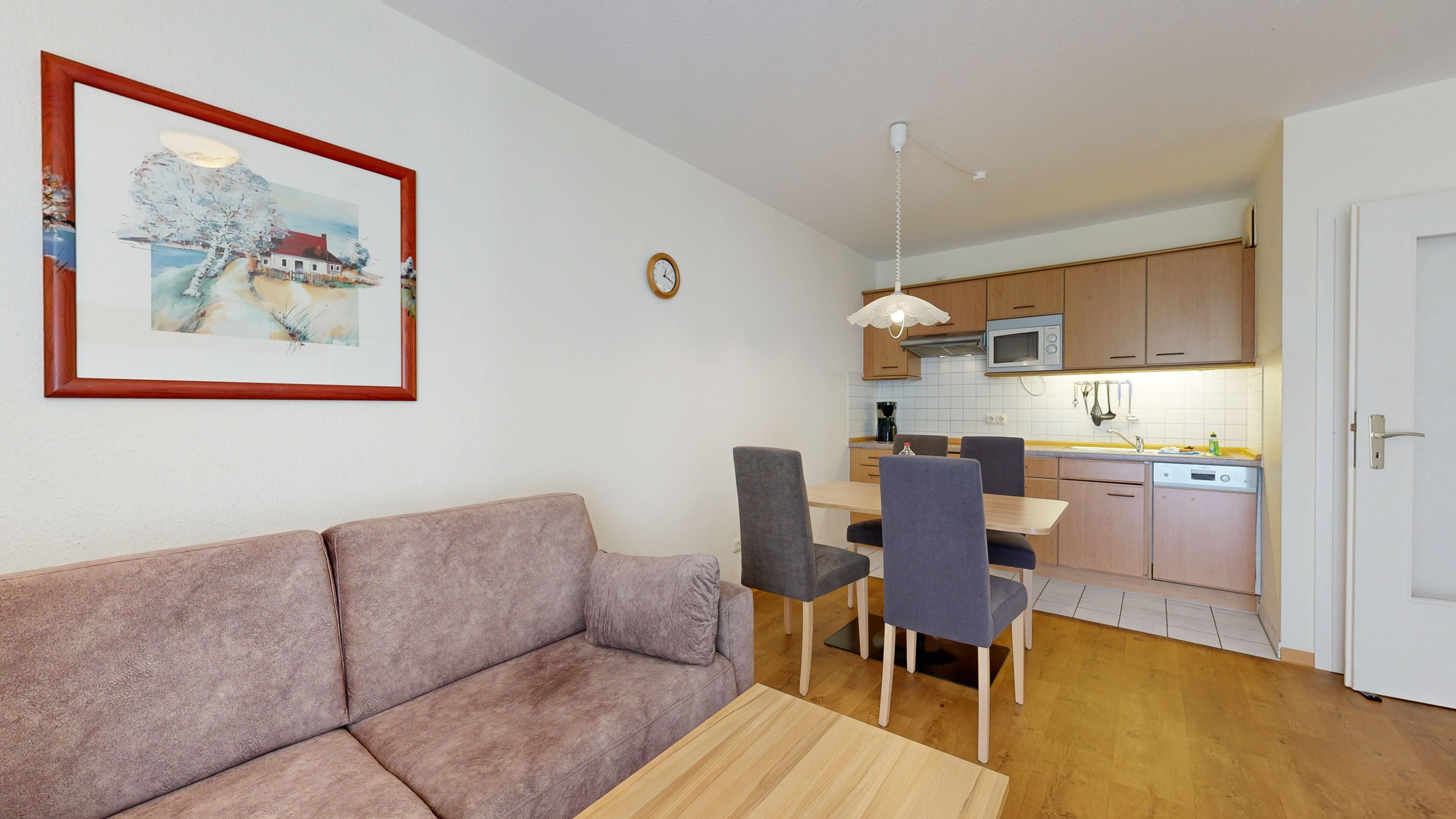 • 1 Wohn-/Essbereich mit einer Doppelbettcouch, Kabel-TV, Stereoanlage, Internetanschluss, Esstisch