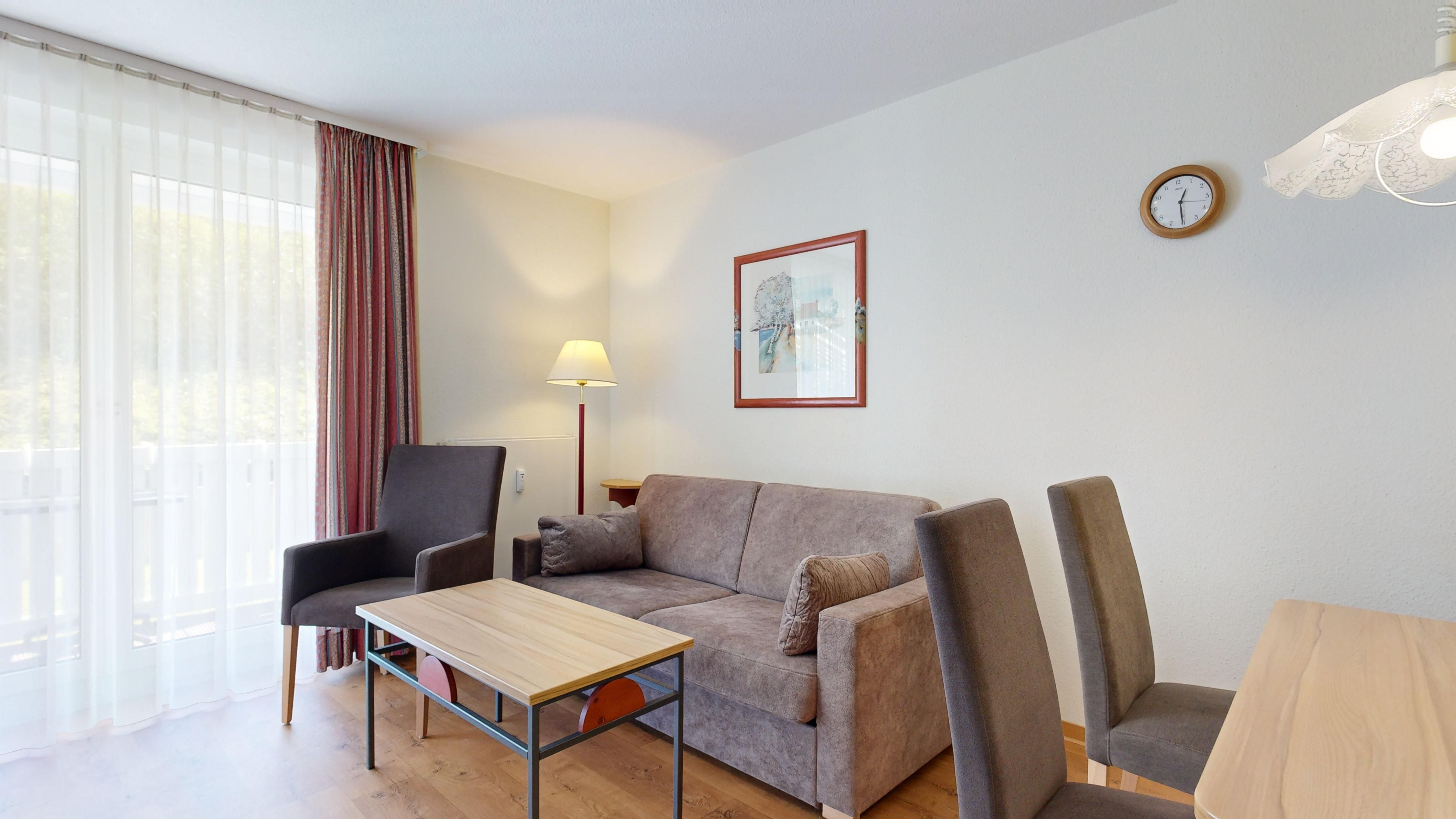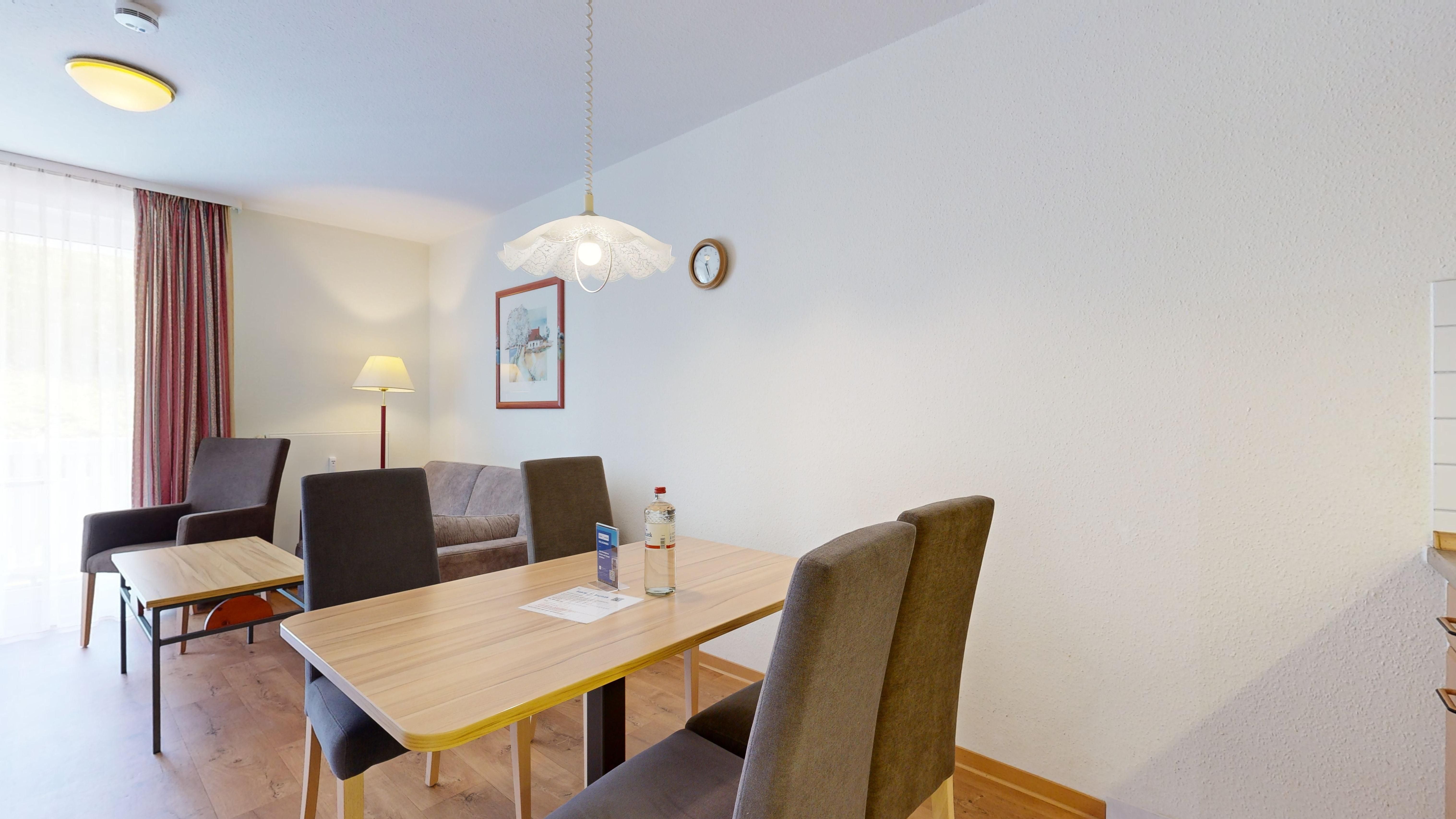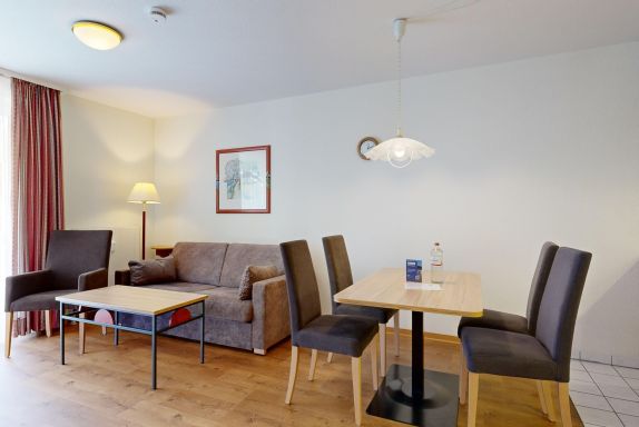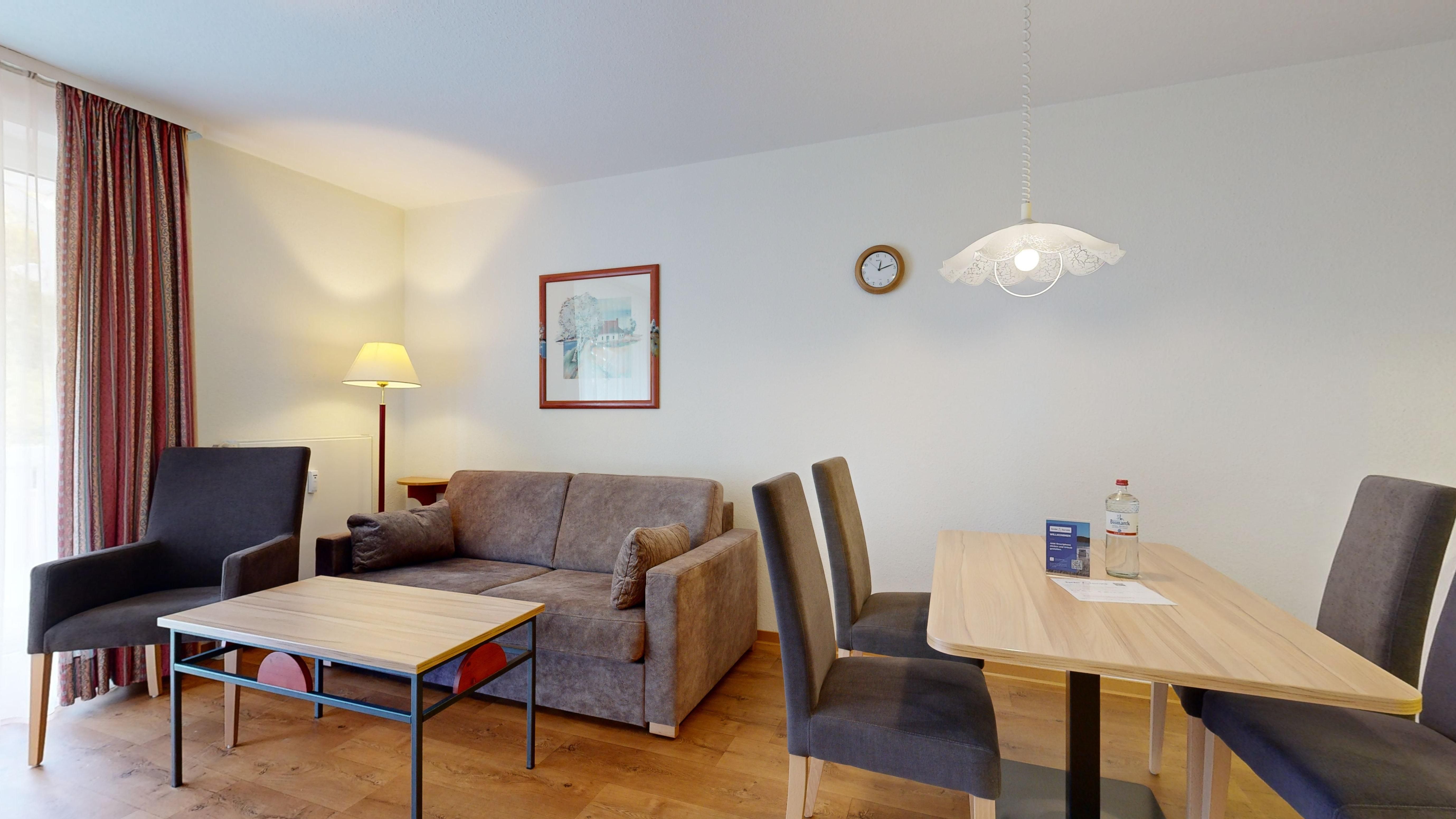 • 1 Wohn-/Essbereich mit einer Doppelbettcouch, Kabel-TV, Stereoanlage, Internetanschluss, Esstisch