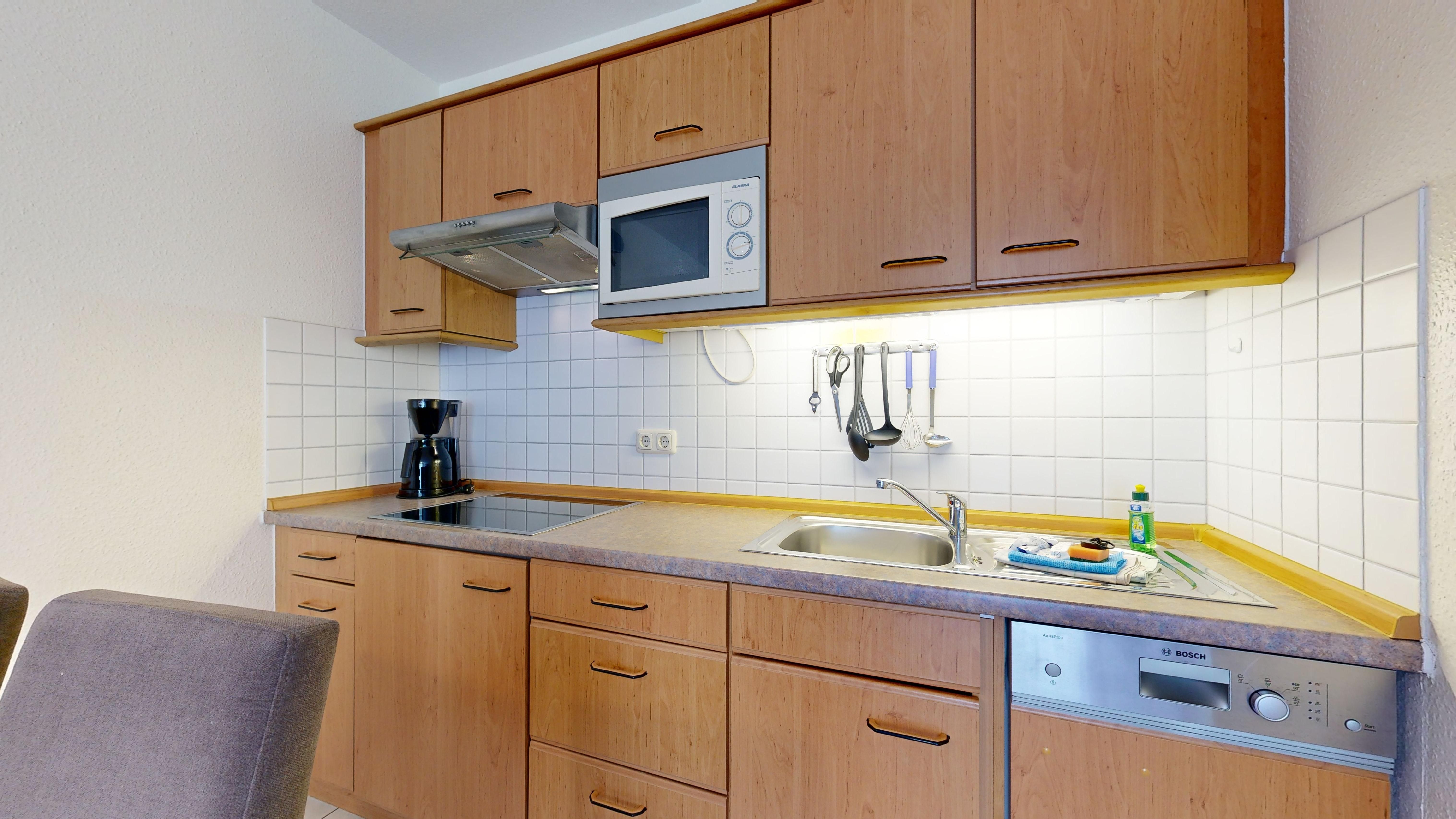 • Küchenzeile mit Spülmaschine, Ceranfeld, Mikrowelle, Kaffeemaschine, Toaster und Kühlschrank mit Gefrierfach