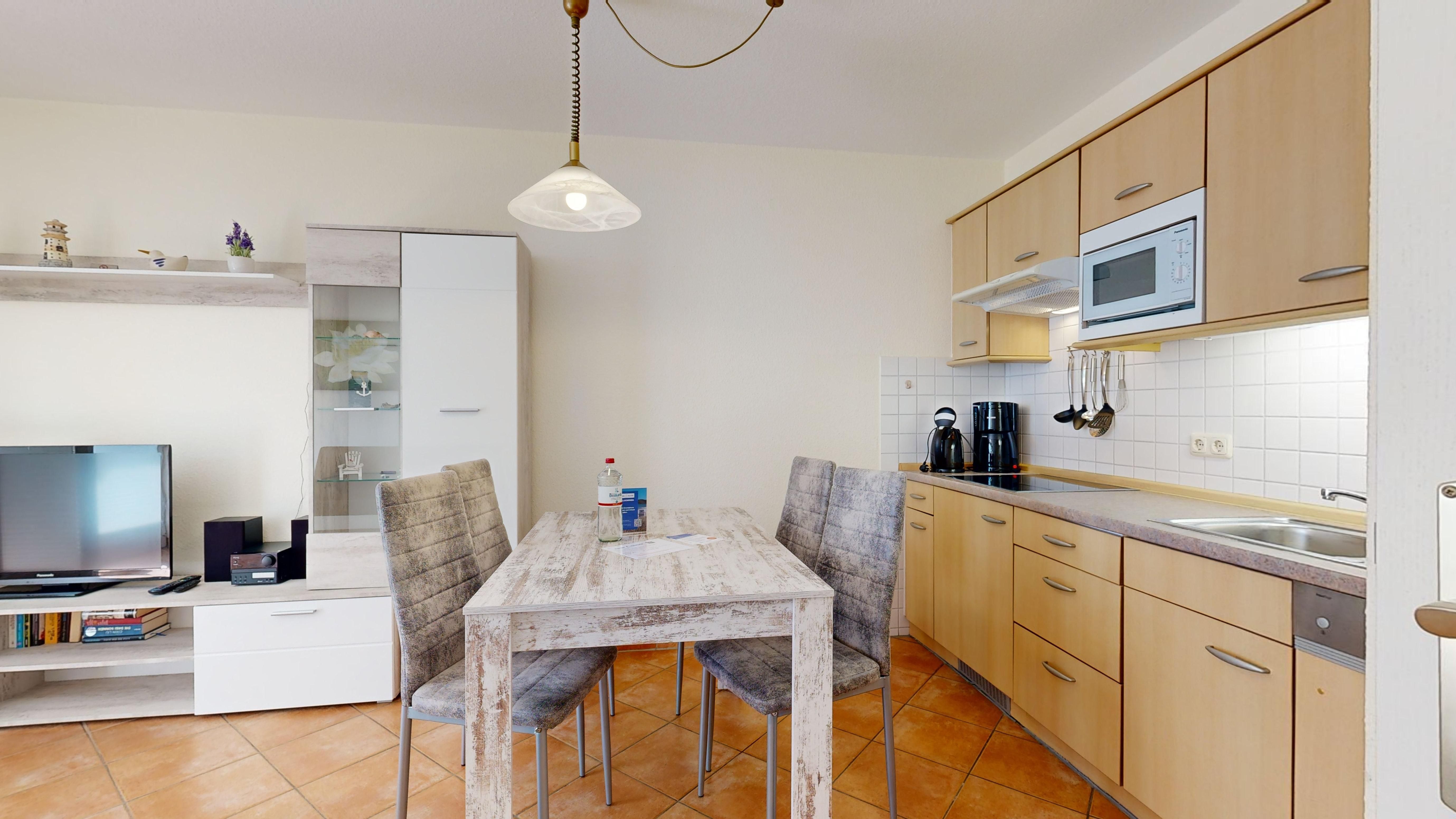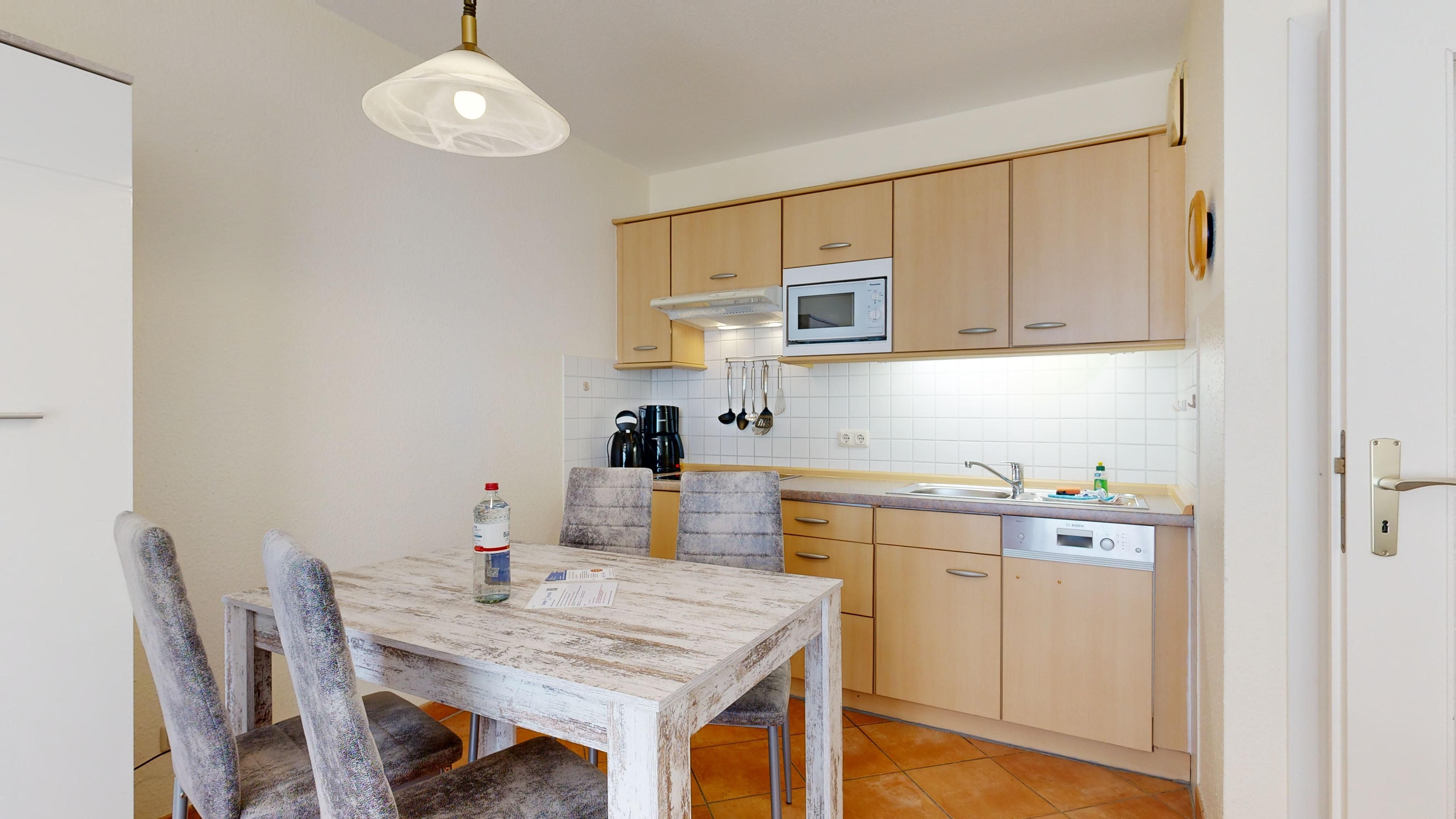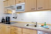 • Küchenzeile mit Spülmaschine, Ceranfeld, Mikrowelle, Kaffeemaschine, Toaster und Kühlschrank mit Gefrierfach