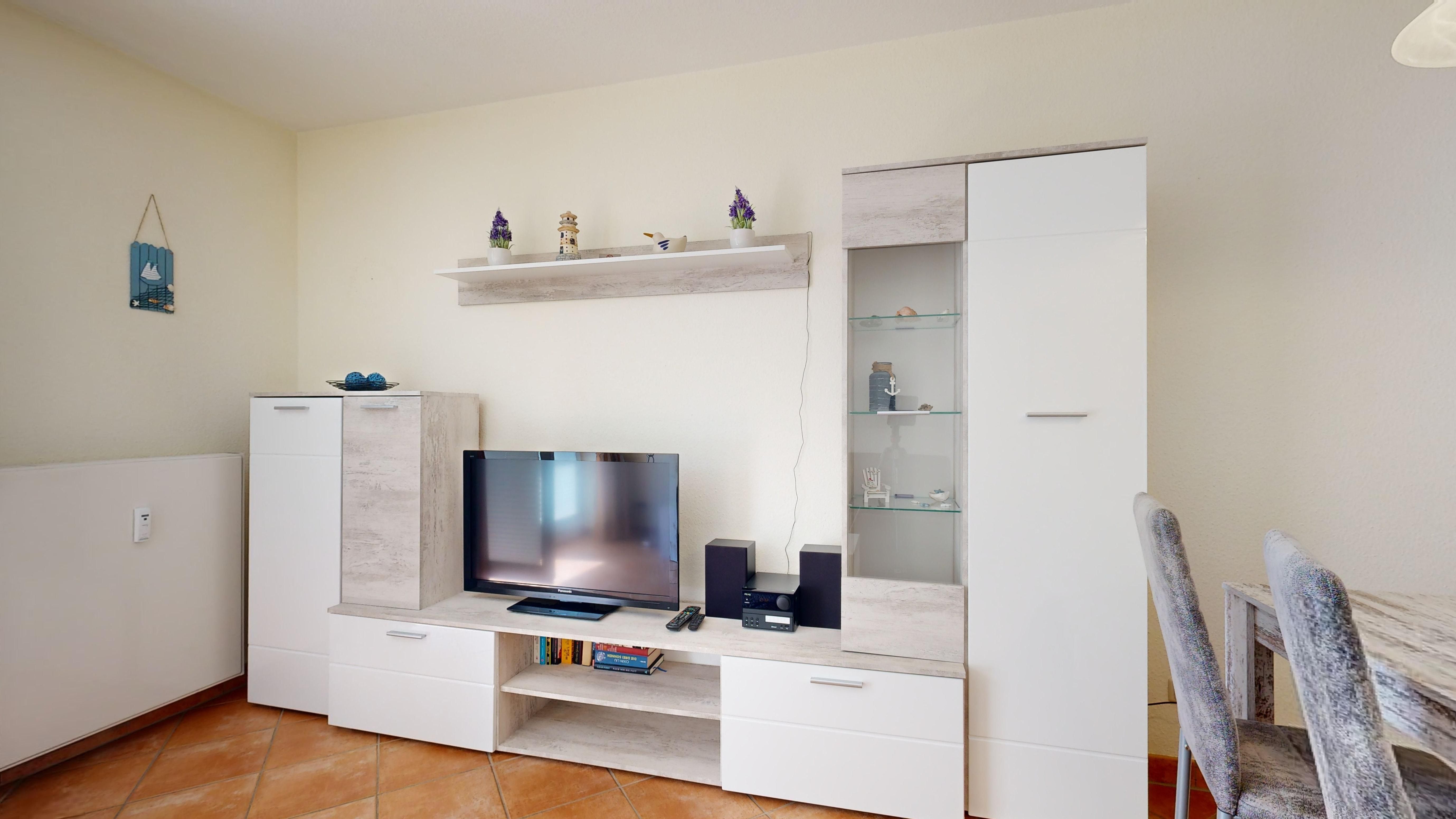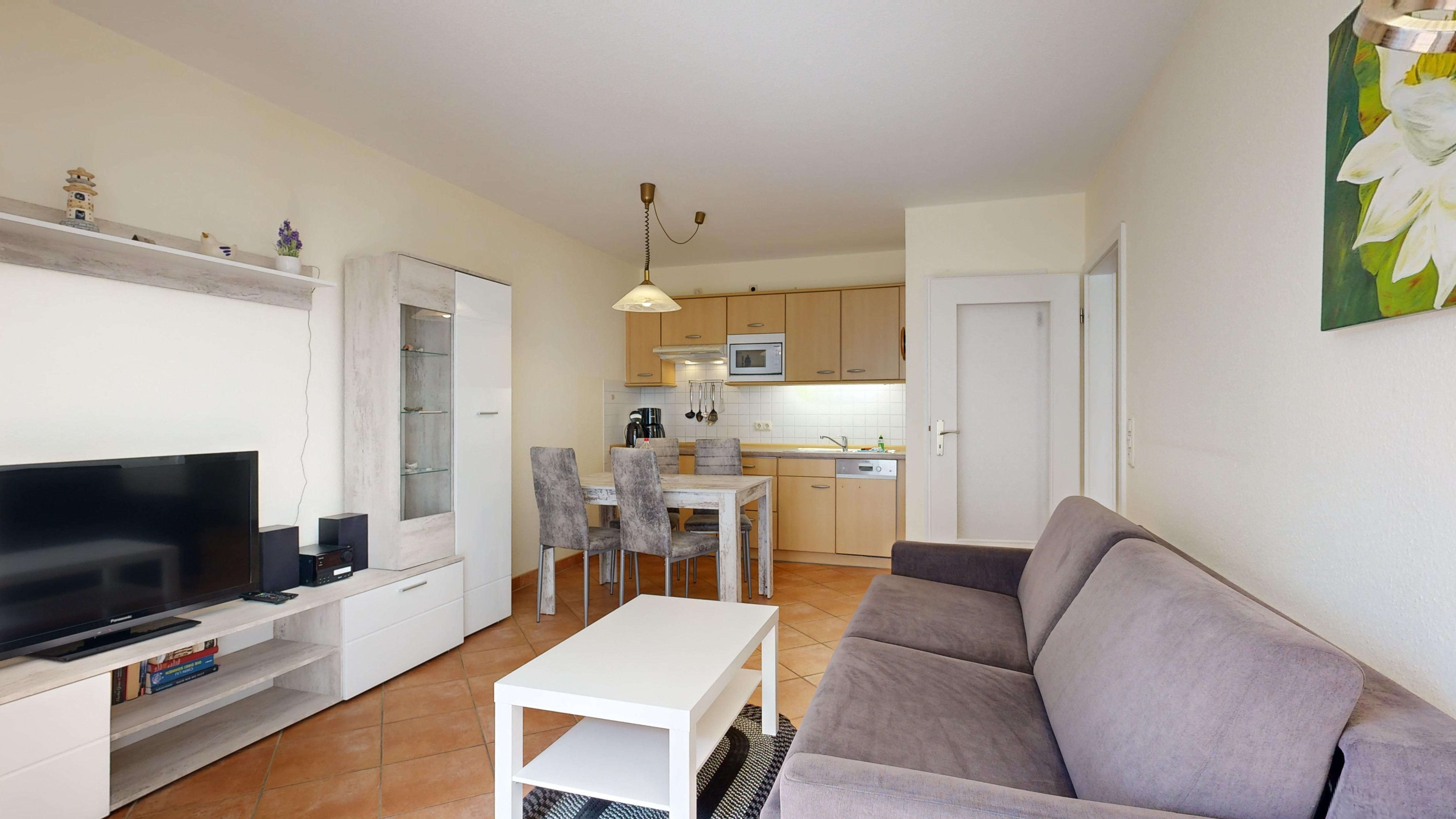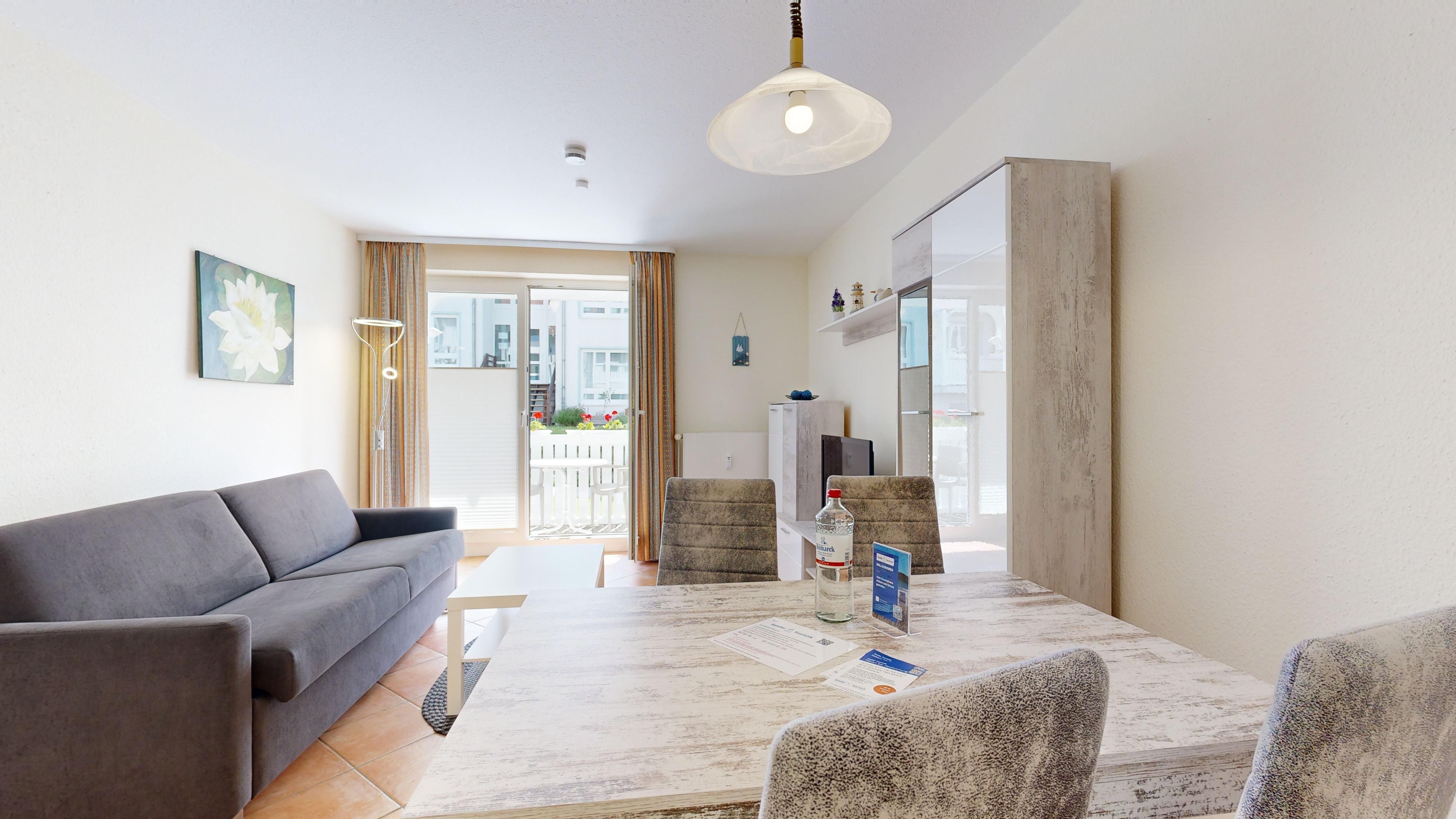 • 1 Wohn-/Essbereich mit einer Doppelbettcouch, Kabel-TV, Stereoanlage, Internetanschluss, Esstisch