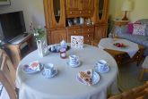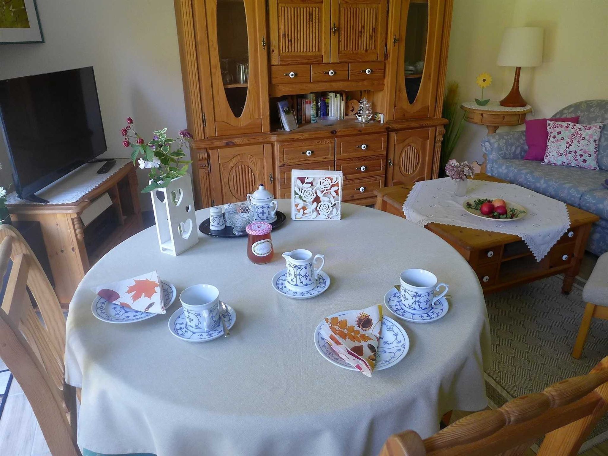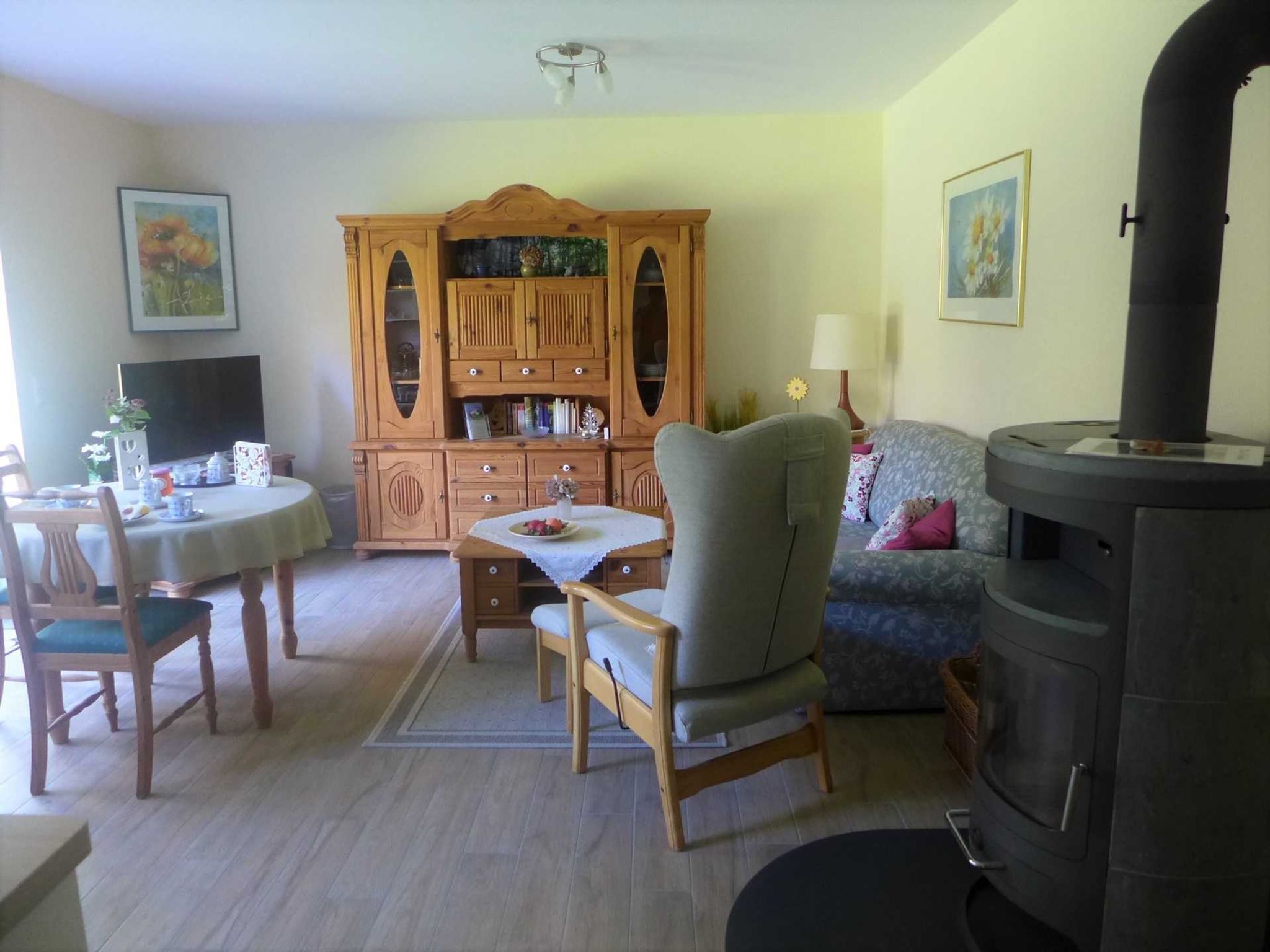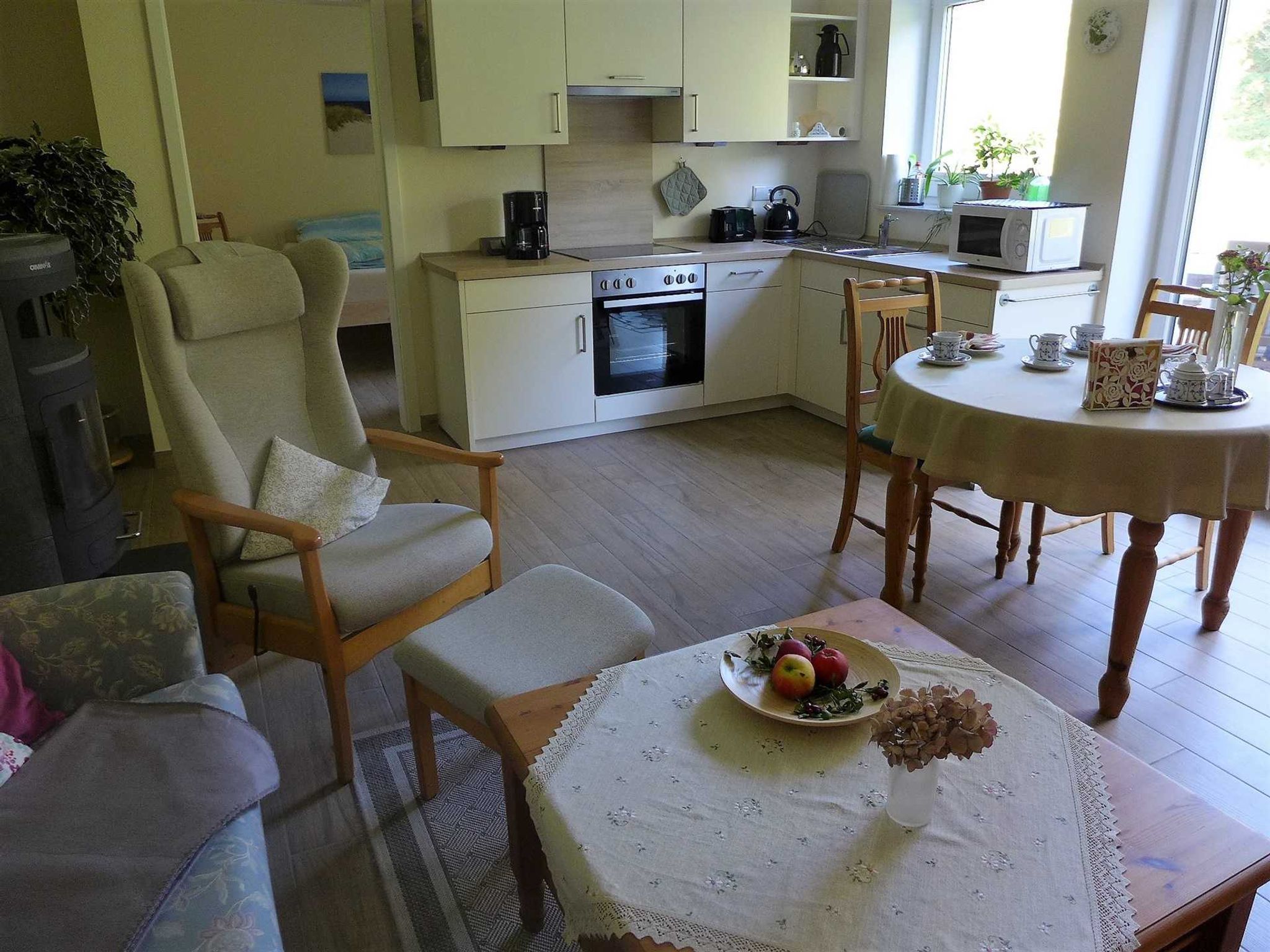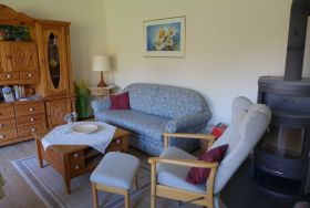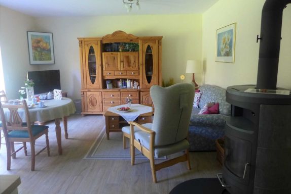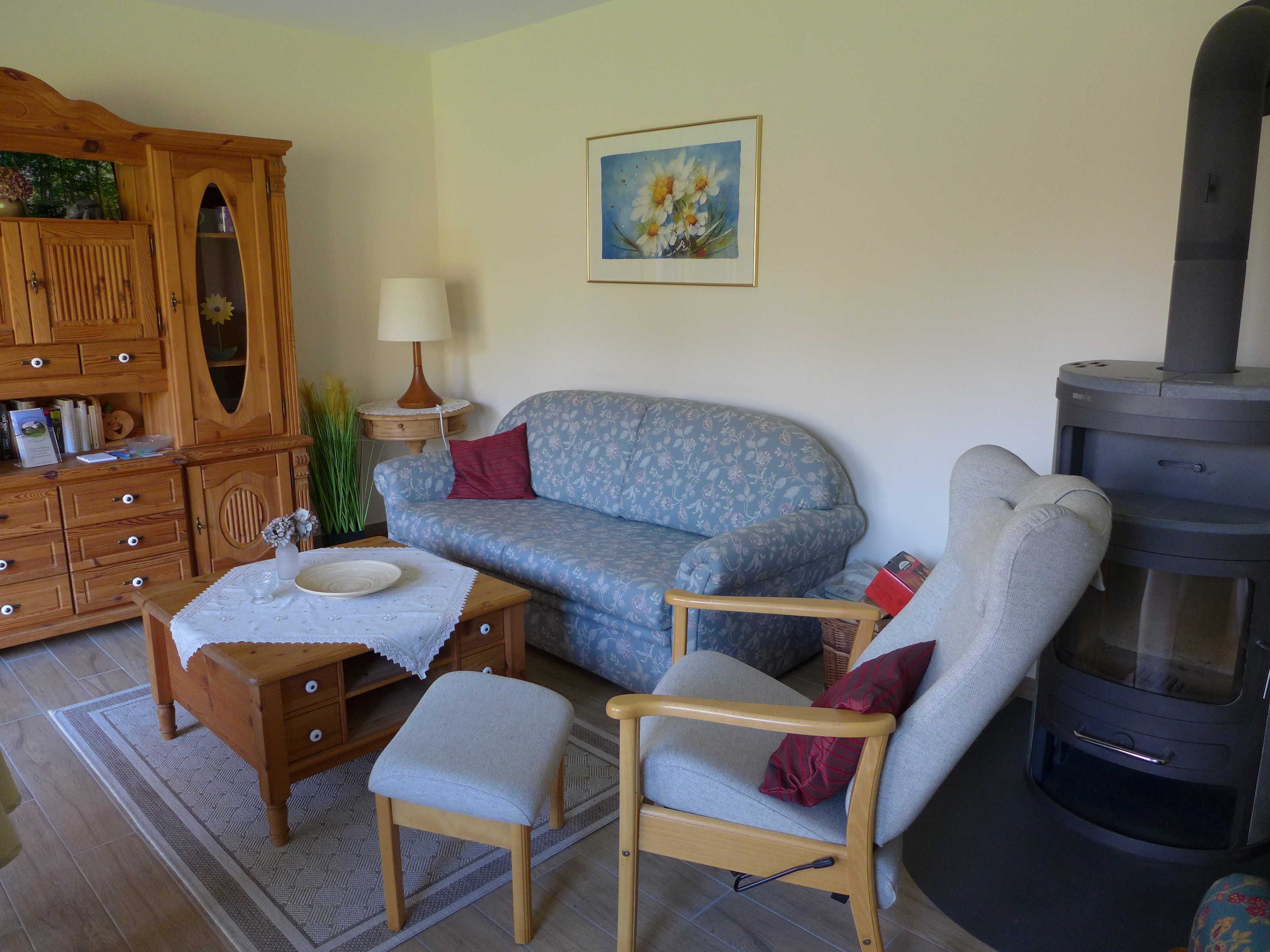 Das Wohnzimmer ist ausgestattet mit einer gemütlichen Sitzecke ( das vorhandene Schlafsofa bietet bis zu 2 zusätzlichen Personen eine Schlafgelegenheit), SAT-TV, Musikanlage, Büchern, Kaminofen, Eßplatz und offener Küche.