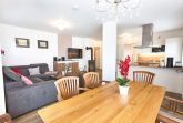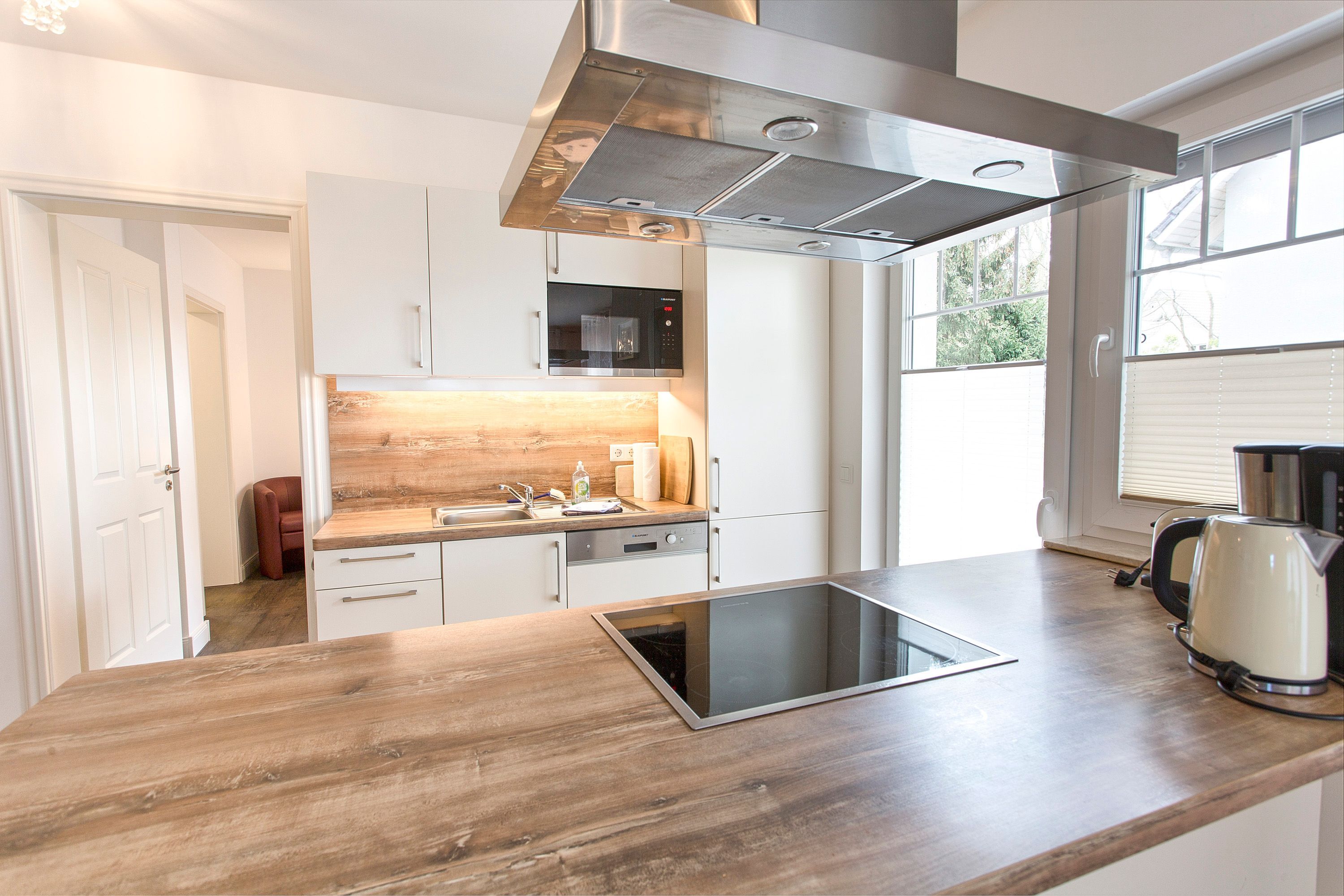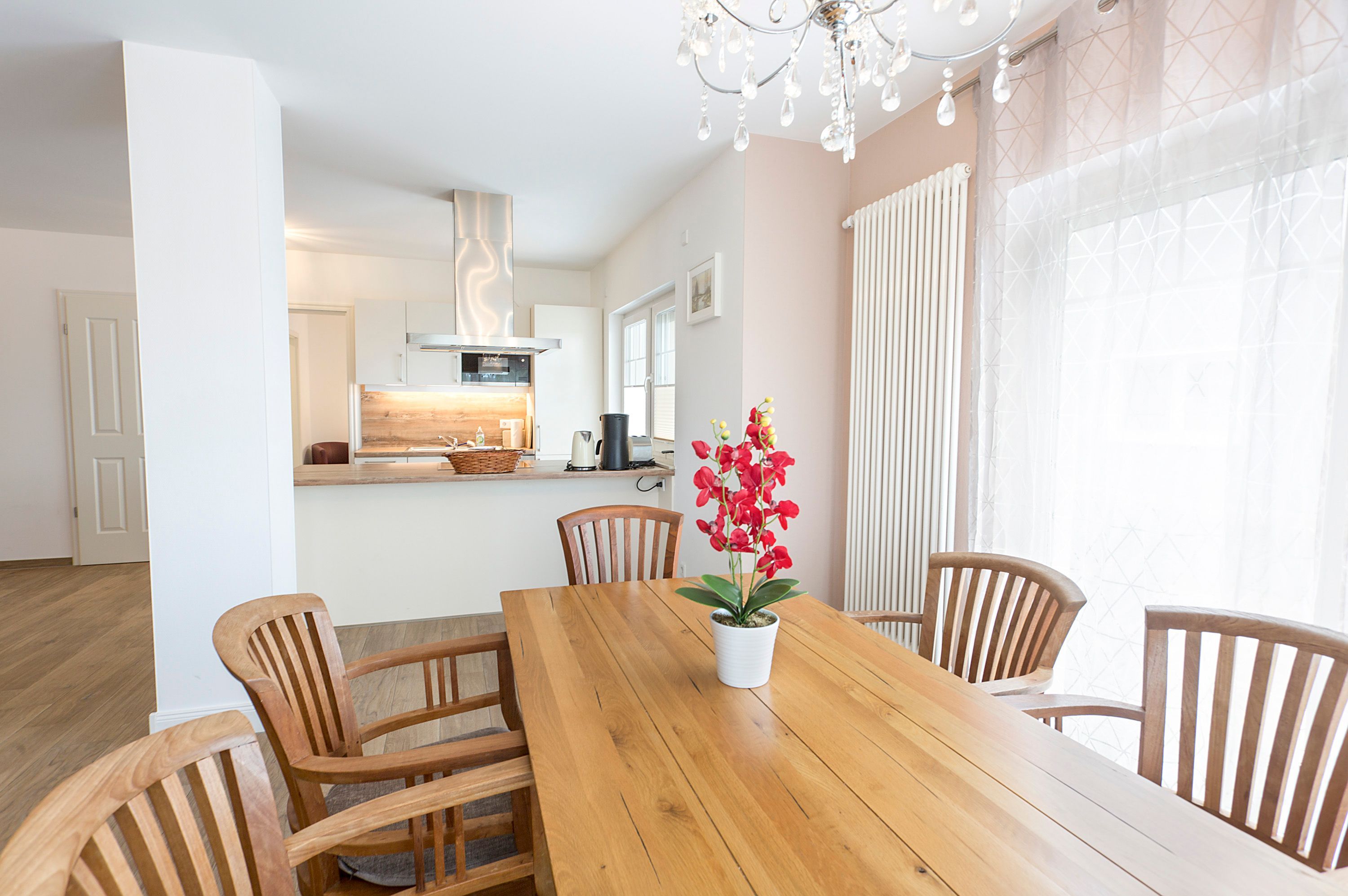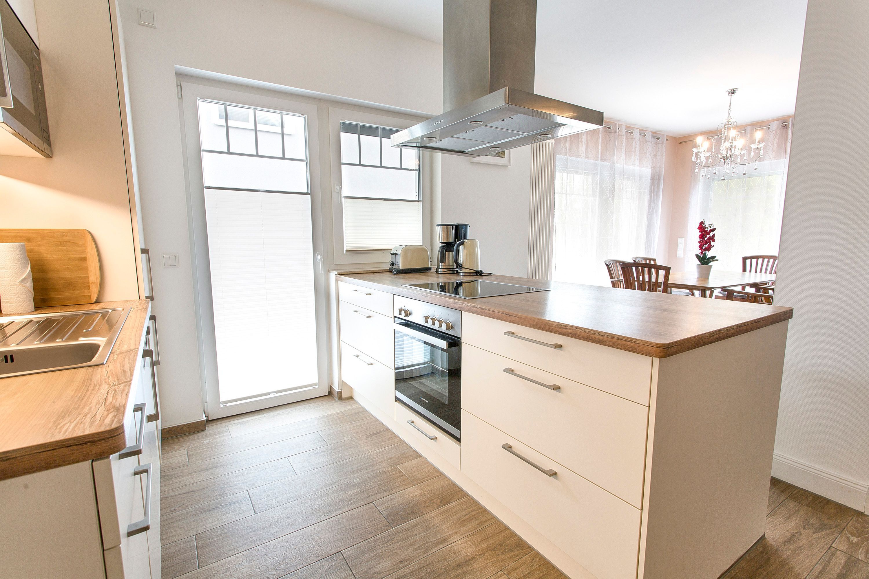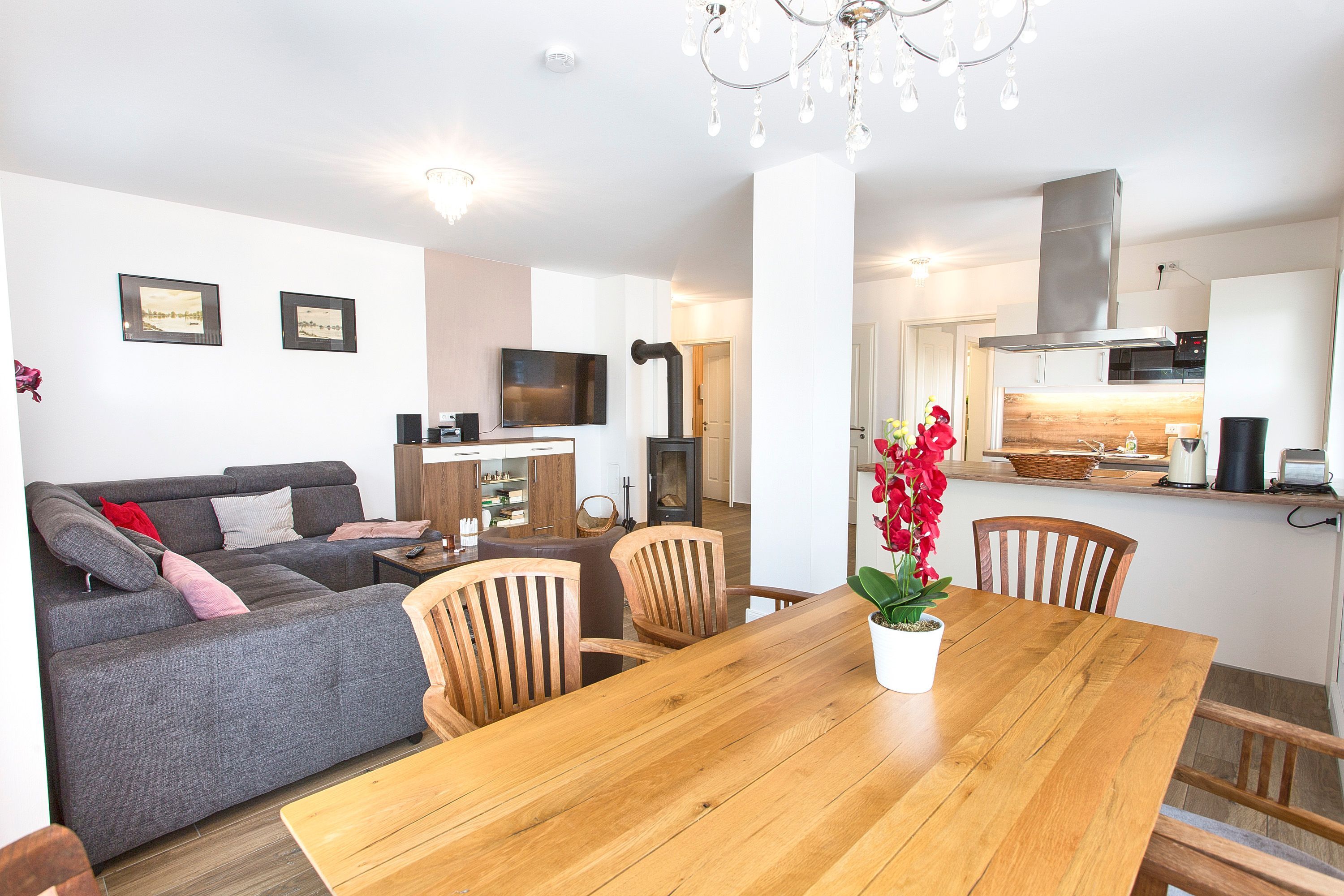 Im großzügigen Wohnbereich erwarten Sie eine gemütliche Wohnlandschaft, Kamin, Smart-TV, eine offen gestaltete Küche sowie ein großer Esstisch. Die Küche ist umfangreich ausgestattet mit Kühlschrank, Gefrierschrank, Ceran-Kochfeld, Backofen, Spülmaschine, Mikrowelle, Kaffeemaschine, Wasserkocher, Toaster und alle den kleinen Dingen des täglichen Bedarfs.
