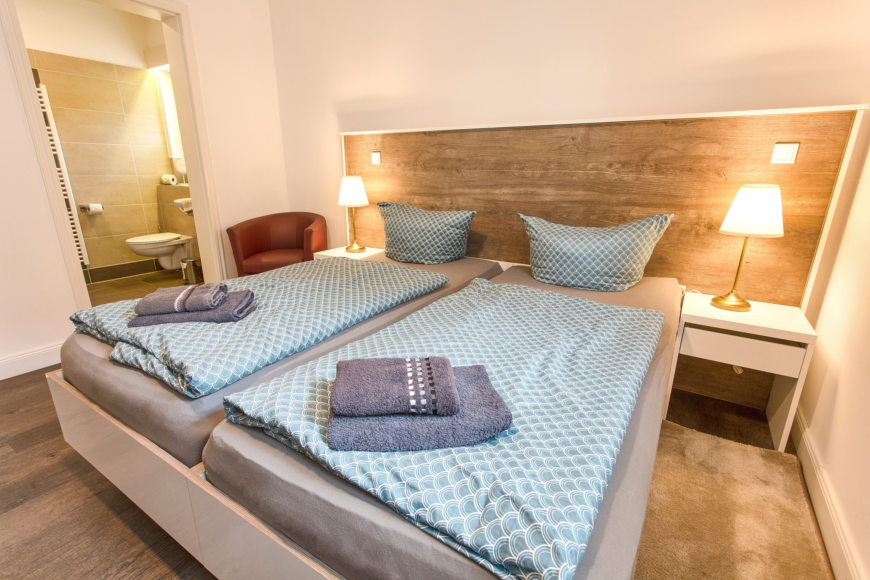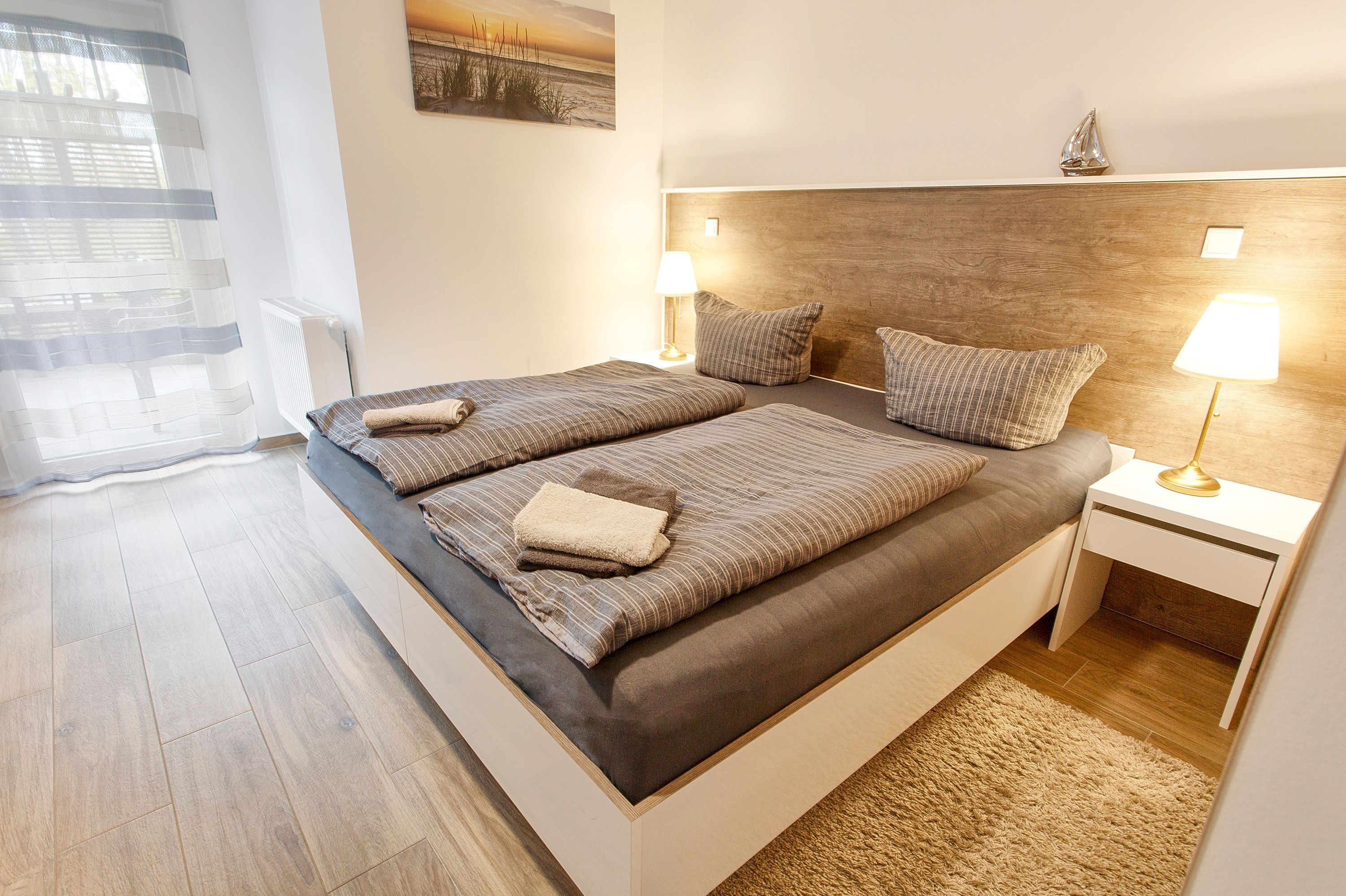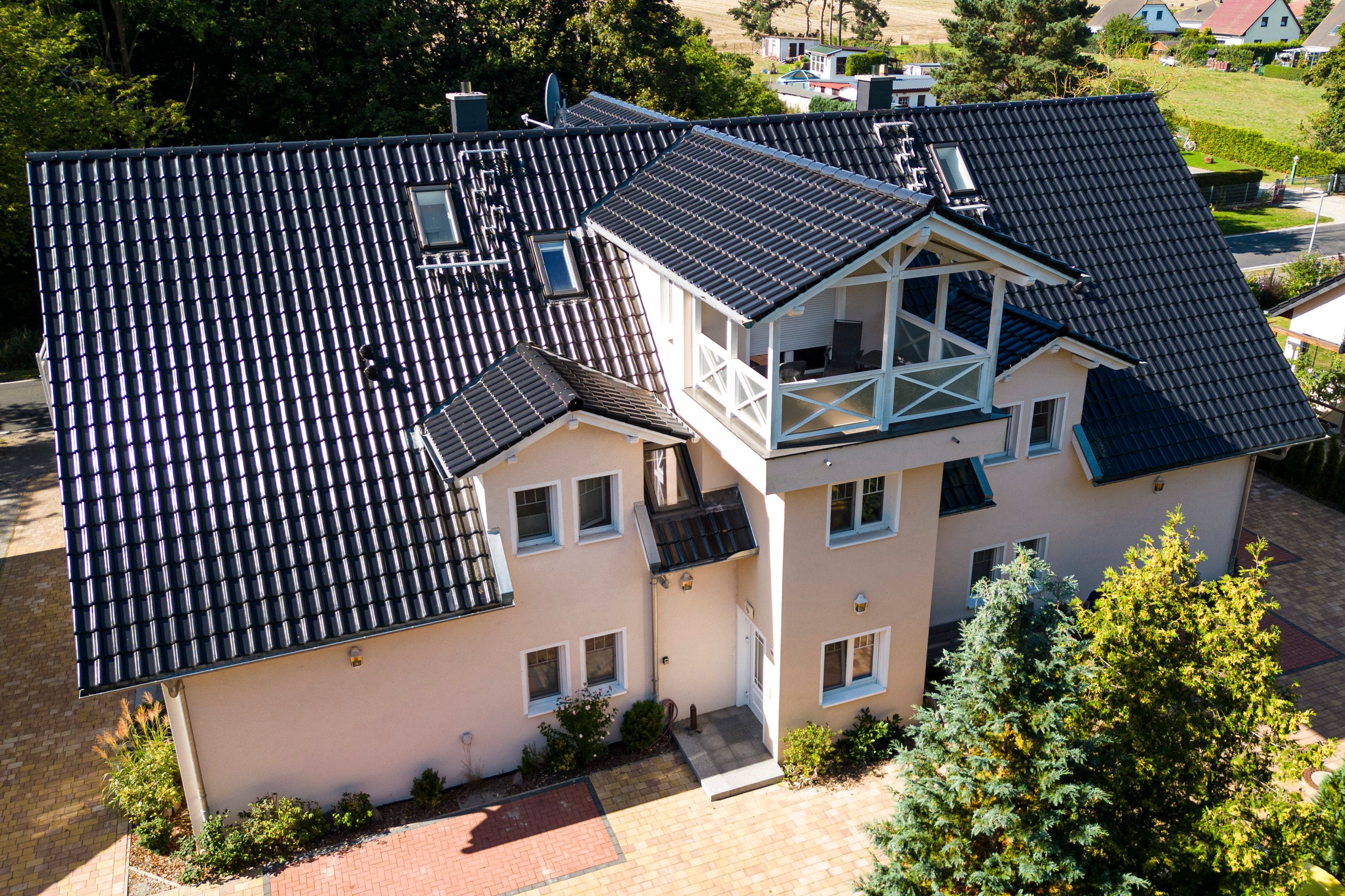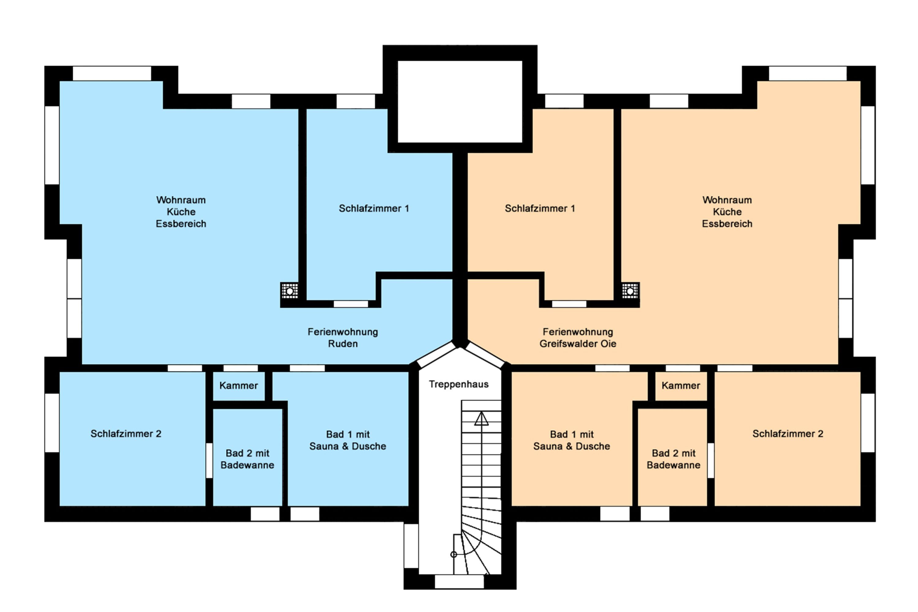Die zwei Ferienwohnungen im Obergeschoss verfügen jeweils über einen Wohnraum mit integriertem Küchen- und Essbereich und Kaminofen, vier separaten Schlafzimmern mit Balkonen und drei Bädern. Die Ferienwohnung Usedom hat einen 40m² großen Saunabereich mit Dusche, Ruheliegen und Balkon.
