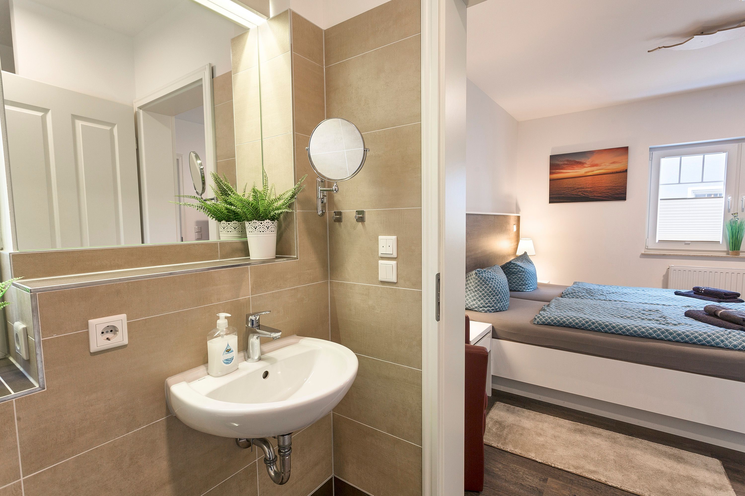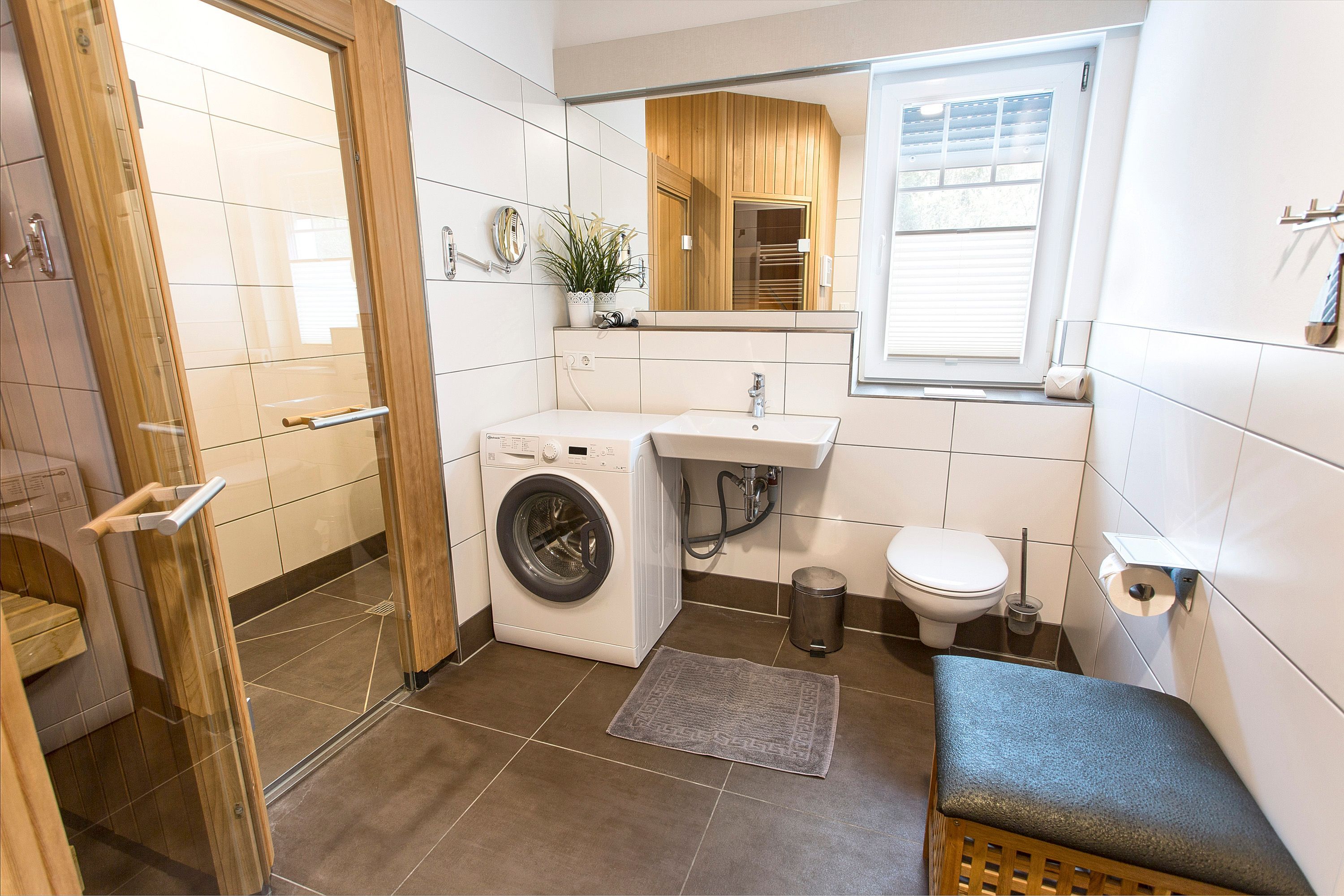 Ein Badezimmer ist mit Badewanne, Föhn und WC ausgestattet, das 2. Badezimmer mit Dusche, Föhn und WC, Waschmaschine und eigener Sauna, welche kostenfrei zur Verfügung steht.