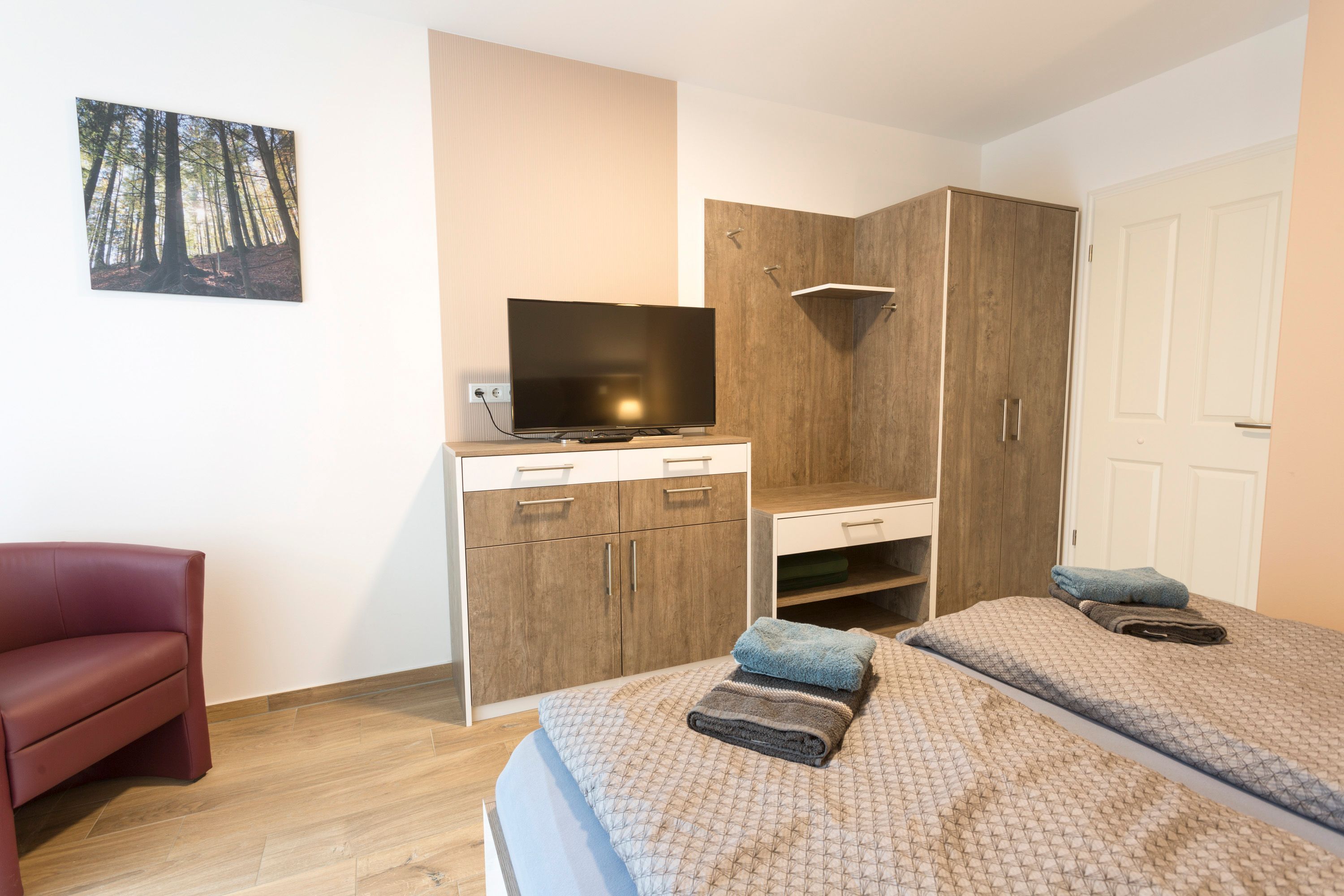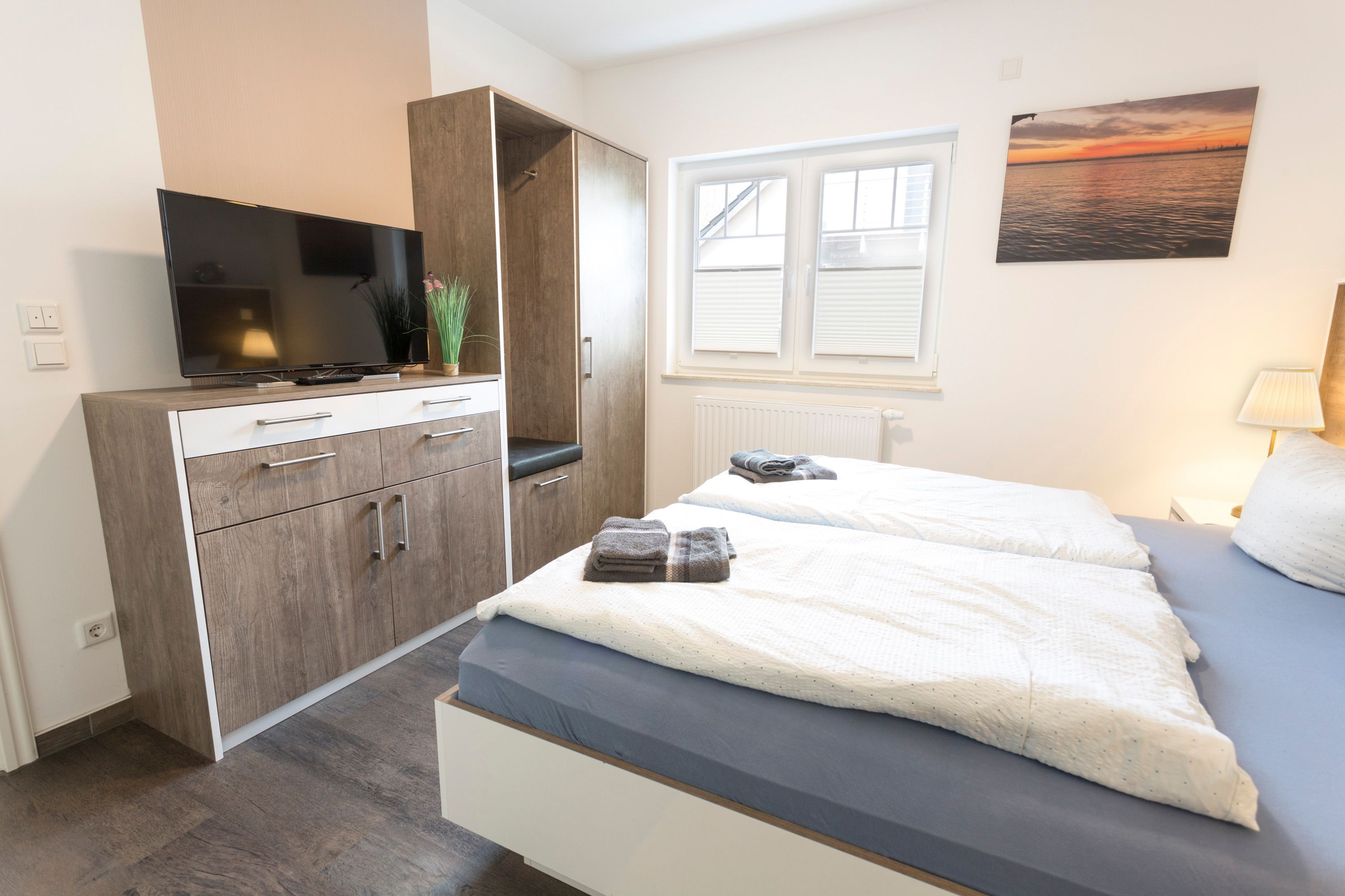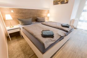 Die beiden Schlafzimmer sind mit Doppelbett (180x200; getrennte Matratzen, einzeln stellbar), Smart-TV, Kleiderschrank und Sessel ausgestattet. Die Fenster sind mit elektrischen Außenjalousien verdunkelbar und mit Insektenschutz versehen.
