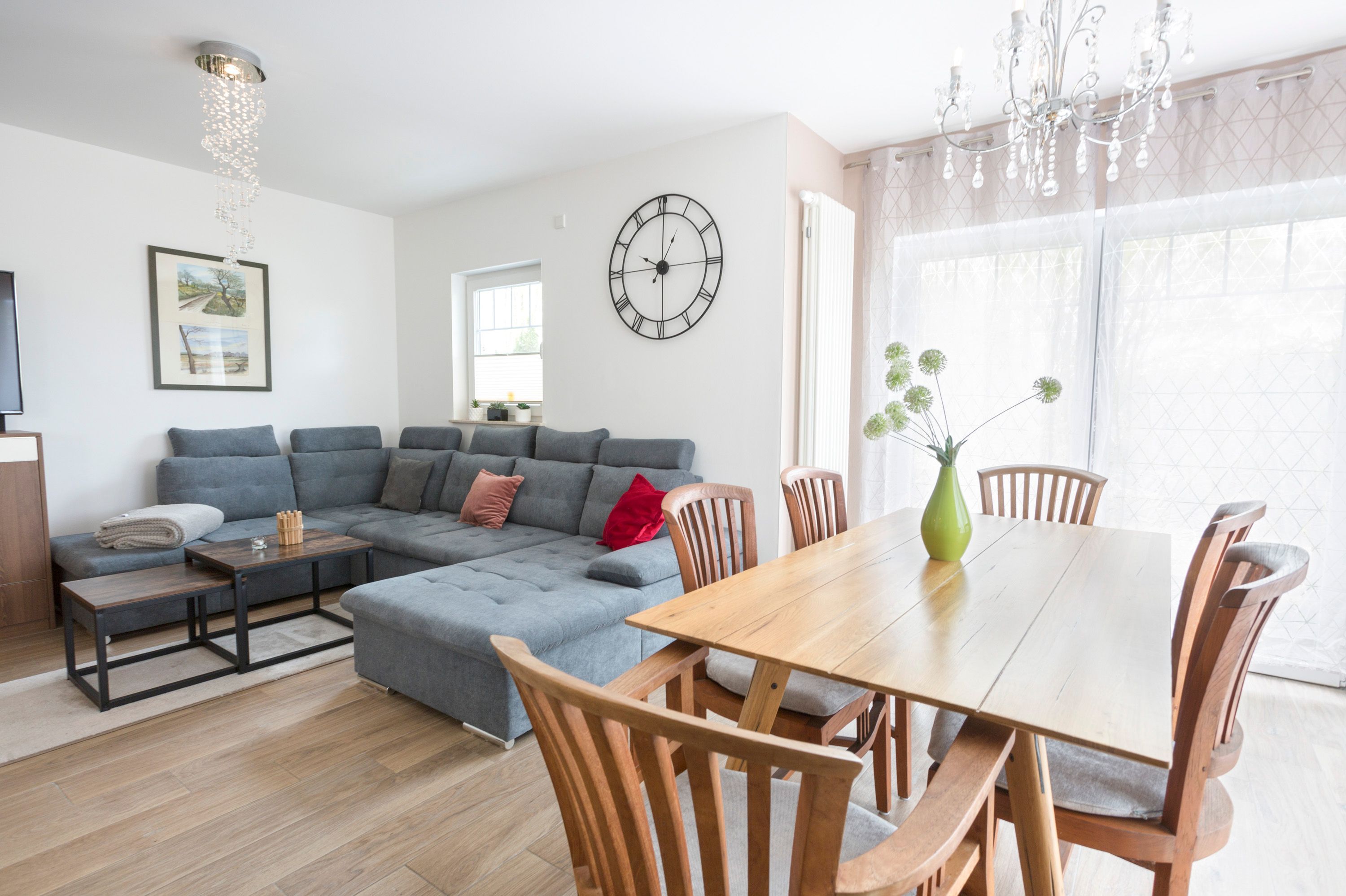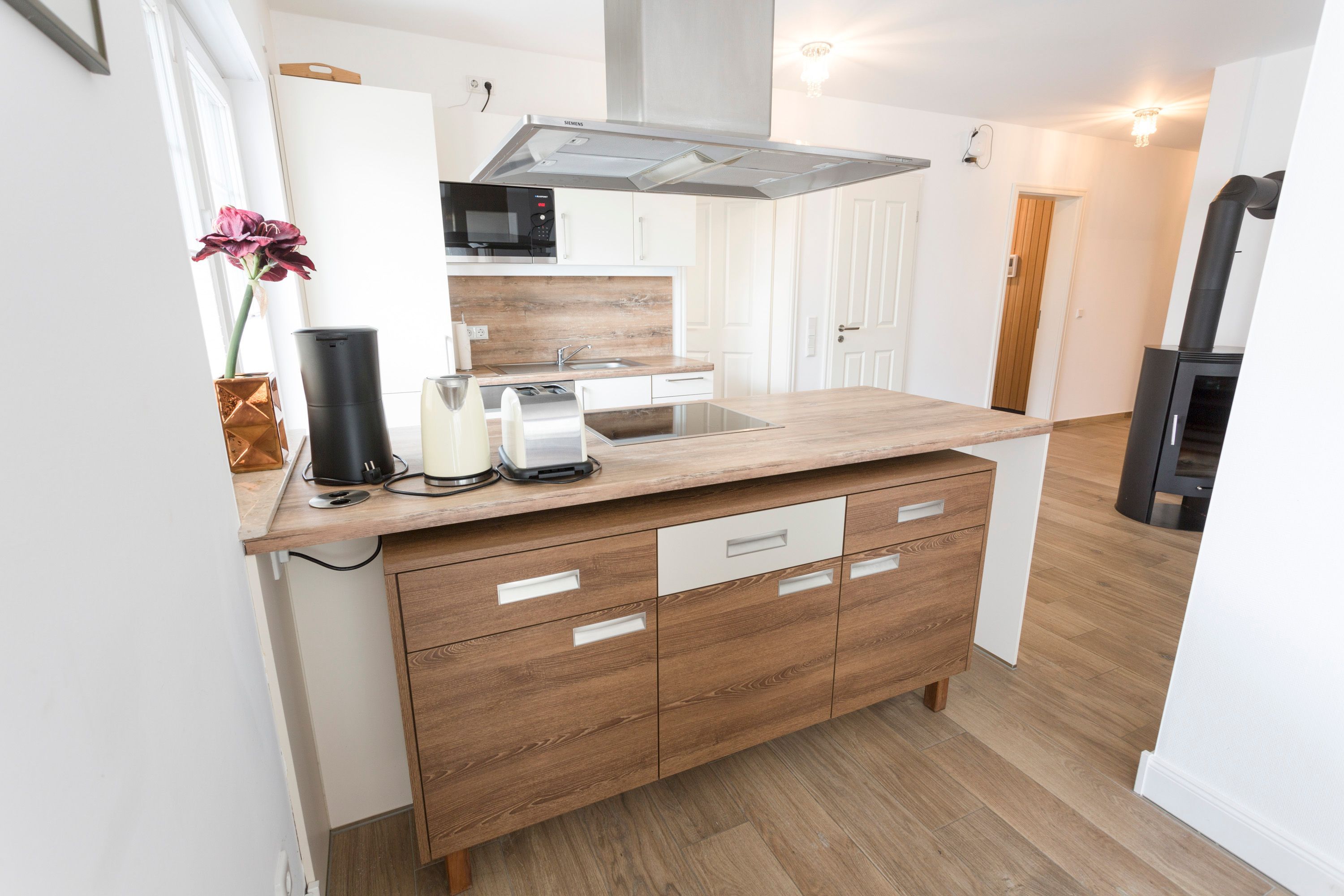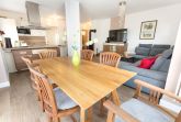 Im großzügigen Wohnbereich erwarten Sie eine gemütliche Wohnlandschaft, Kamin, Smart-TV, eine offen gestaltete Küche sowie ein großer Esstisch. Die Küche ist umfangreich ausgestattet mit Kühlschrank, Gefrierschrank, Ceran-Kochfeld, Backofen, Spülmaschine, Mikrowelle, Kaffeemaschine, Wasserkocher, Toaster und alle den kleinen Dingen des täglichen Bedarfs.