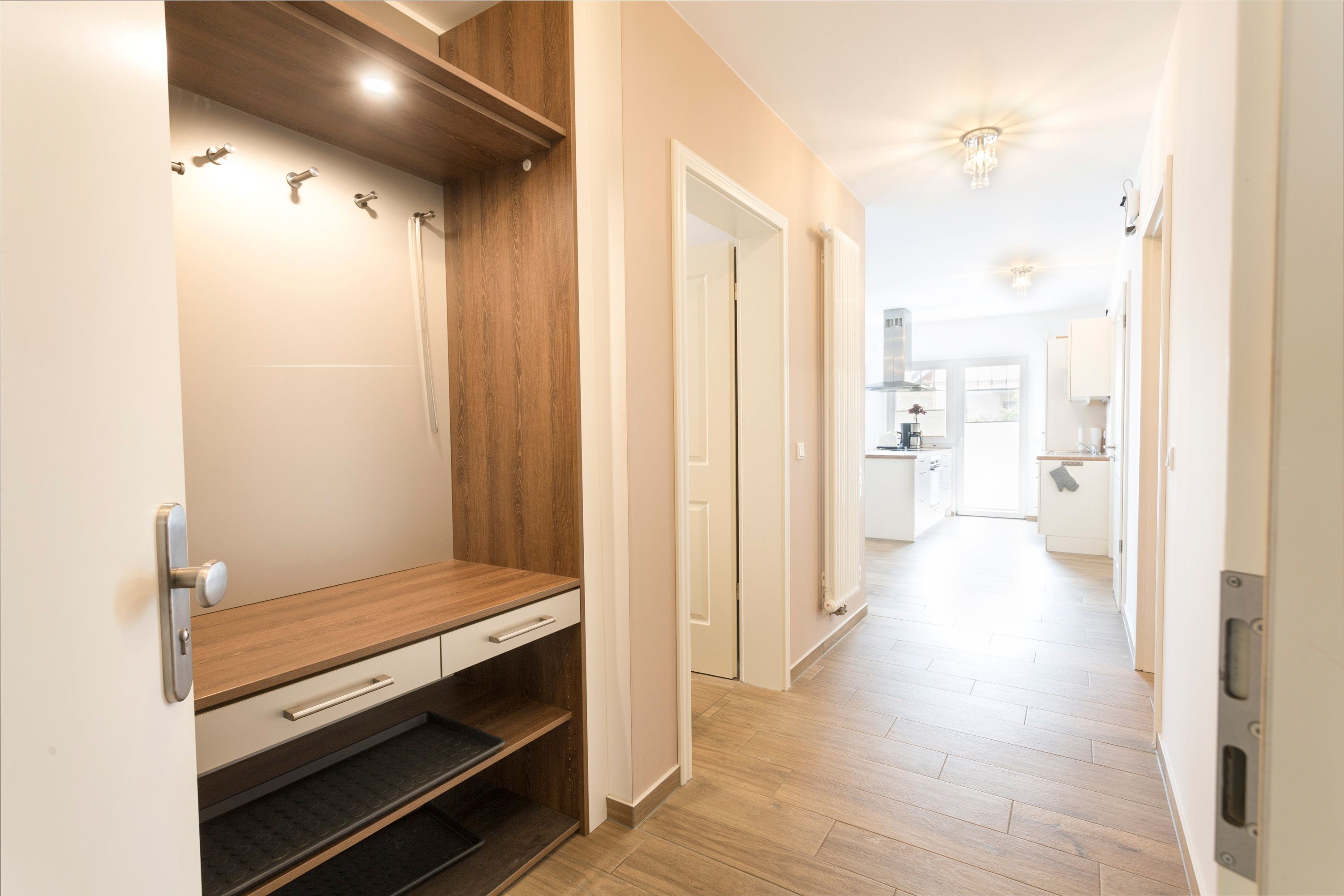 Die zwei Ferienwohnungen im Obergeschoss verfügen jeweils über einen Wohnraum mit integriertem Küchen- und Essbereich und Kaminofen, vier separaten Schlafzimmern mit Balkonen und drei Bädern. Die Ferienwohnung Usedom hat einen 40m² großen Saunabereich mit Dusche, Ruheliegen und Balkon.
