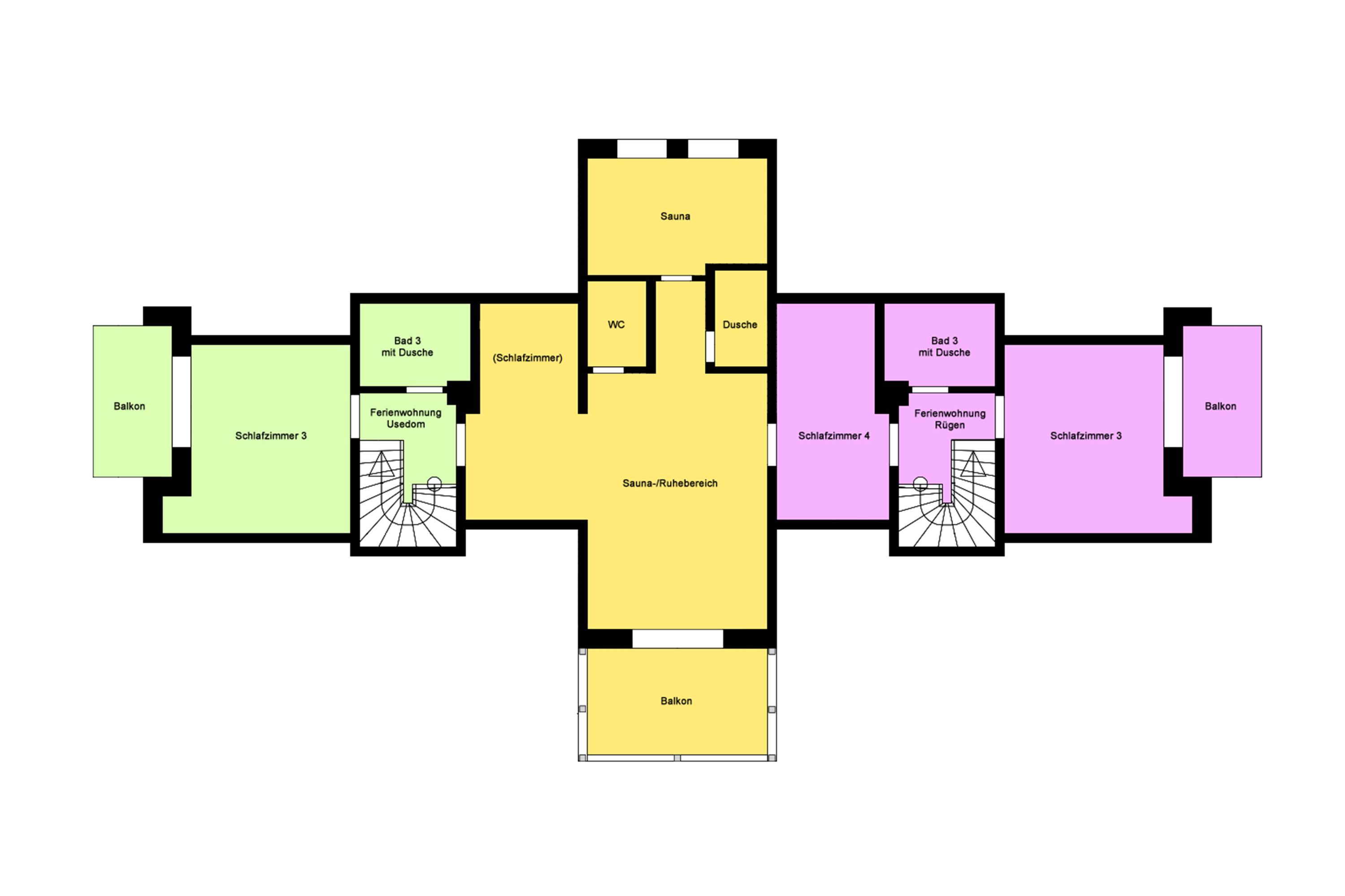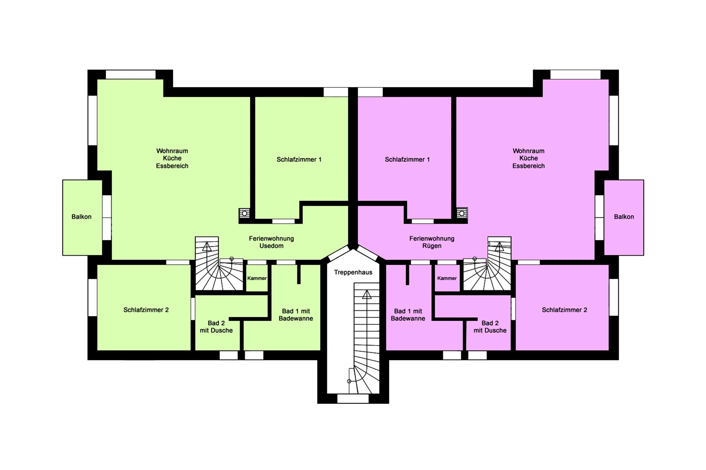 Die zwei Ferienwohnungen im Obergeschoss verfügen jeweils über einen Wohnraum mit integriertem Küchen- und Essbereich und Kaminofen, vier separaten Schlafzimmern mit Balkonen und drei Bädern. Die Ferienwohnung Usedom hat einen 40m² großen Saunabereich mit Dusche, Ruheliegen und Balkon.