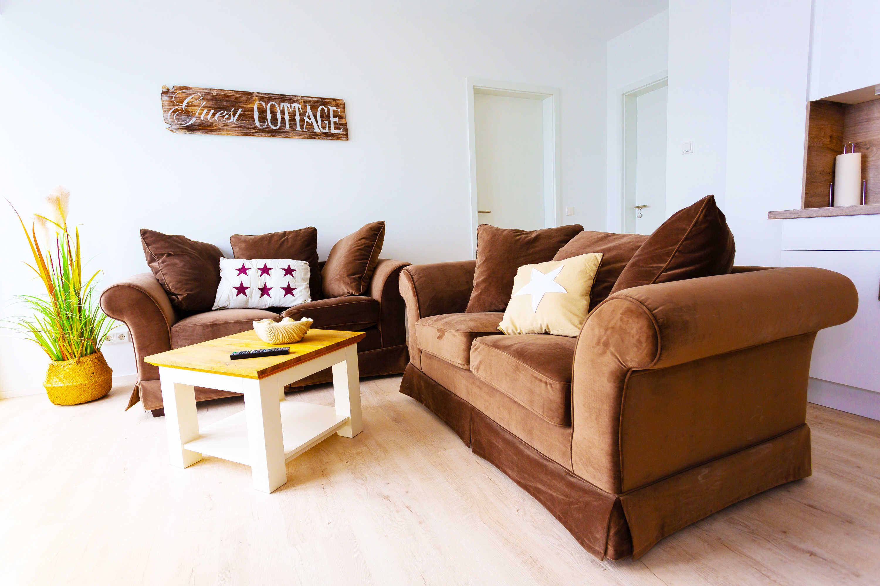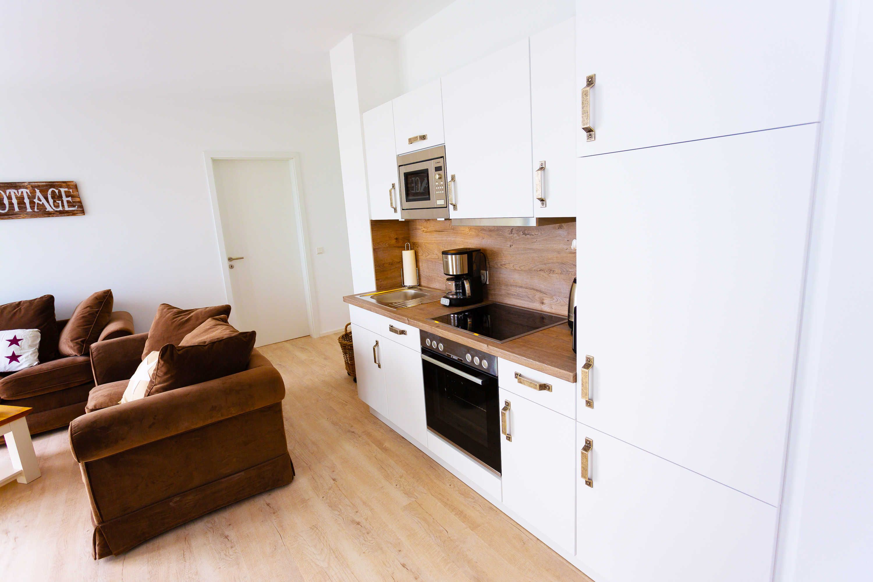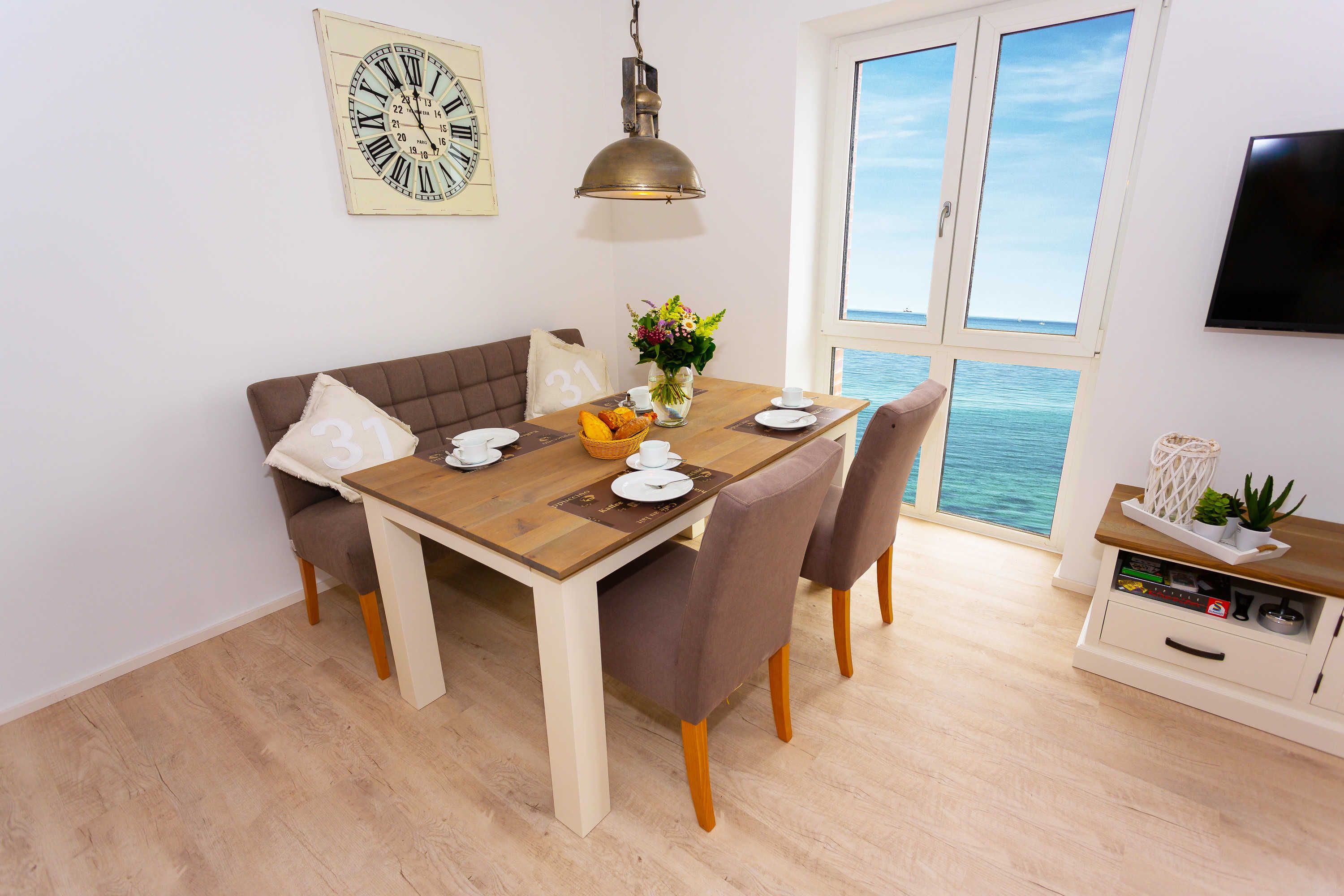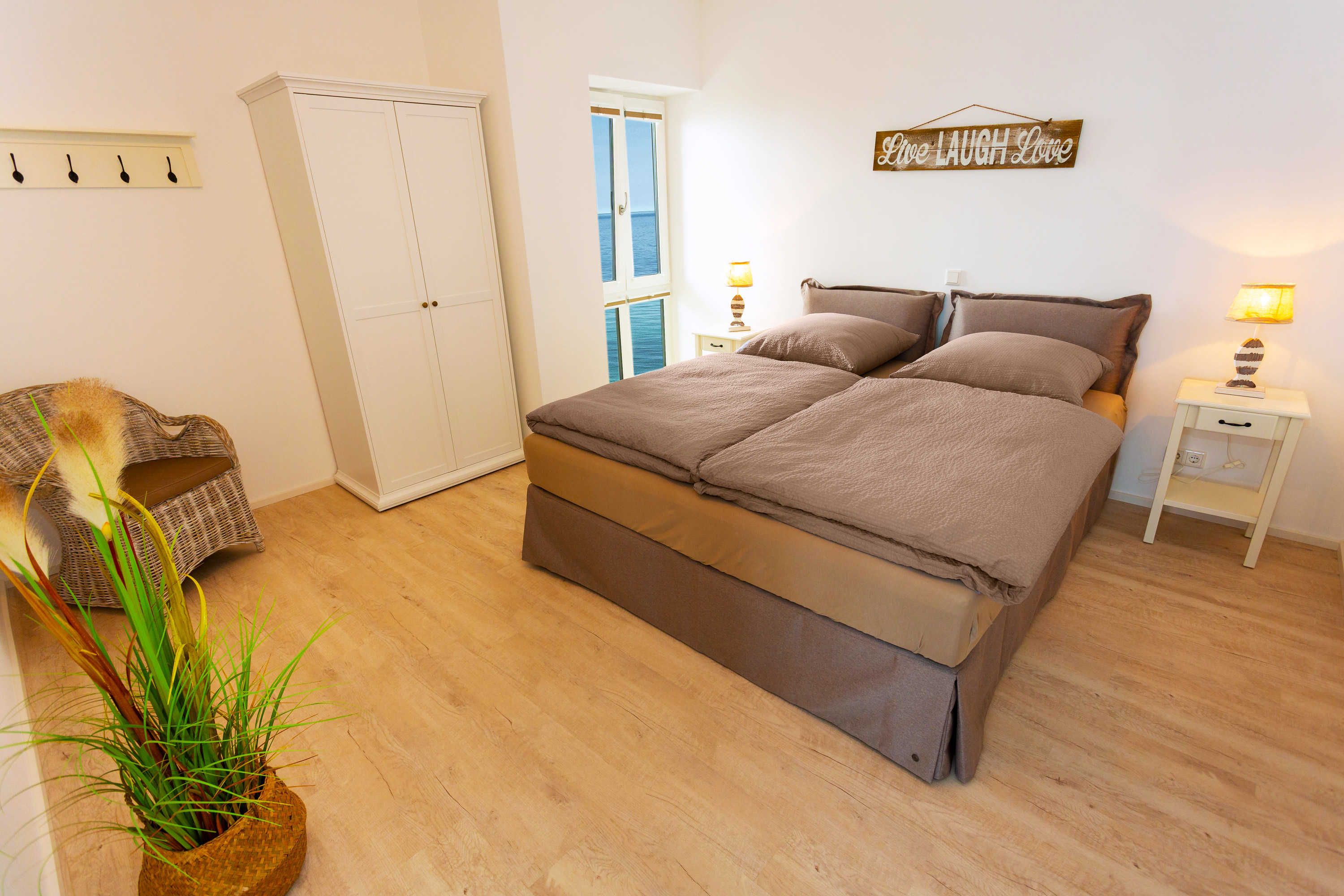 Ein geschmackvoll eingerichtetes Wohnzimmer mit einer kuscheligen Couchgarnitur bietet Ihnen einen traumhaften, direkten und wohl einzigartigen Meerblick. Es schließt sich ein Balkon an, auf dem sich der atemberaubende Blick auf die Ostsee im Freien genießen lässt. Zu der komplett ausgestatteten Küche gehören der einladende Esstisch samt gemütlicher Bestuhlung, ein Kühlschrank mit Gefrierfach, ein Backofen, eine Mikrowelle, ein Geschirrspüler und selbstverständlich weitere Küchenutensilien. Zwei gemütliche Schlafzimmer sind mit jeweils einem Boxspring-Doppelbett eingerichtet. Des Weiteren gehören ein Duschbad sowie ein weiteres Bad mit Badewanne zur Ferienwohnung.