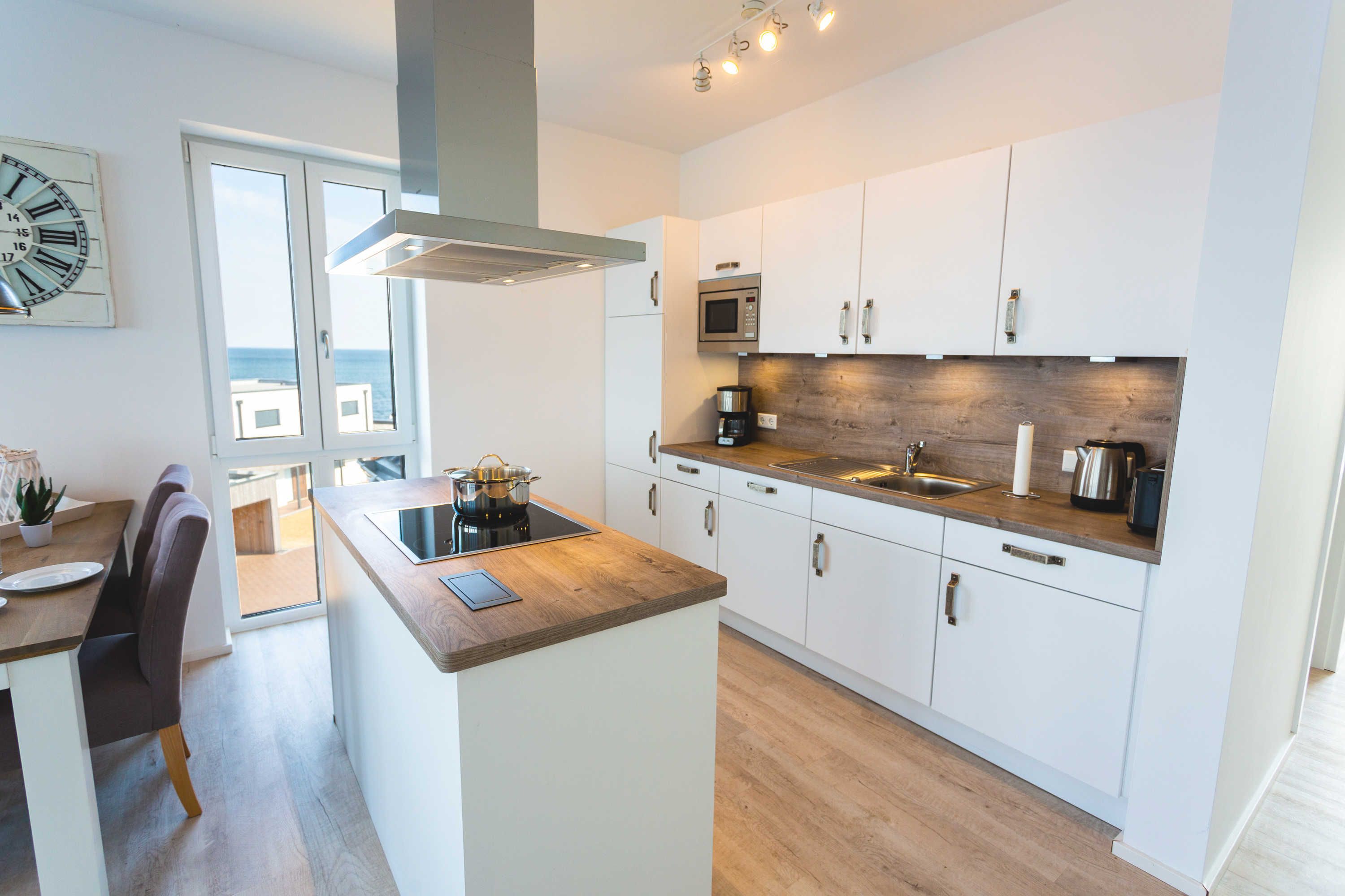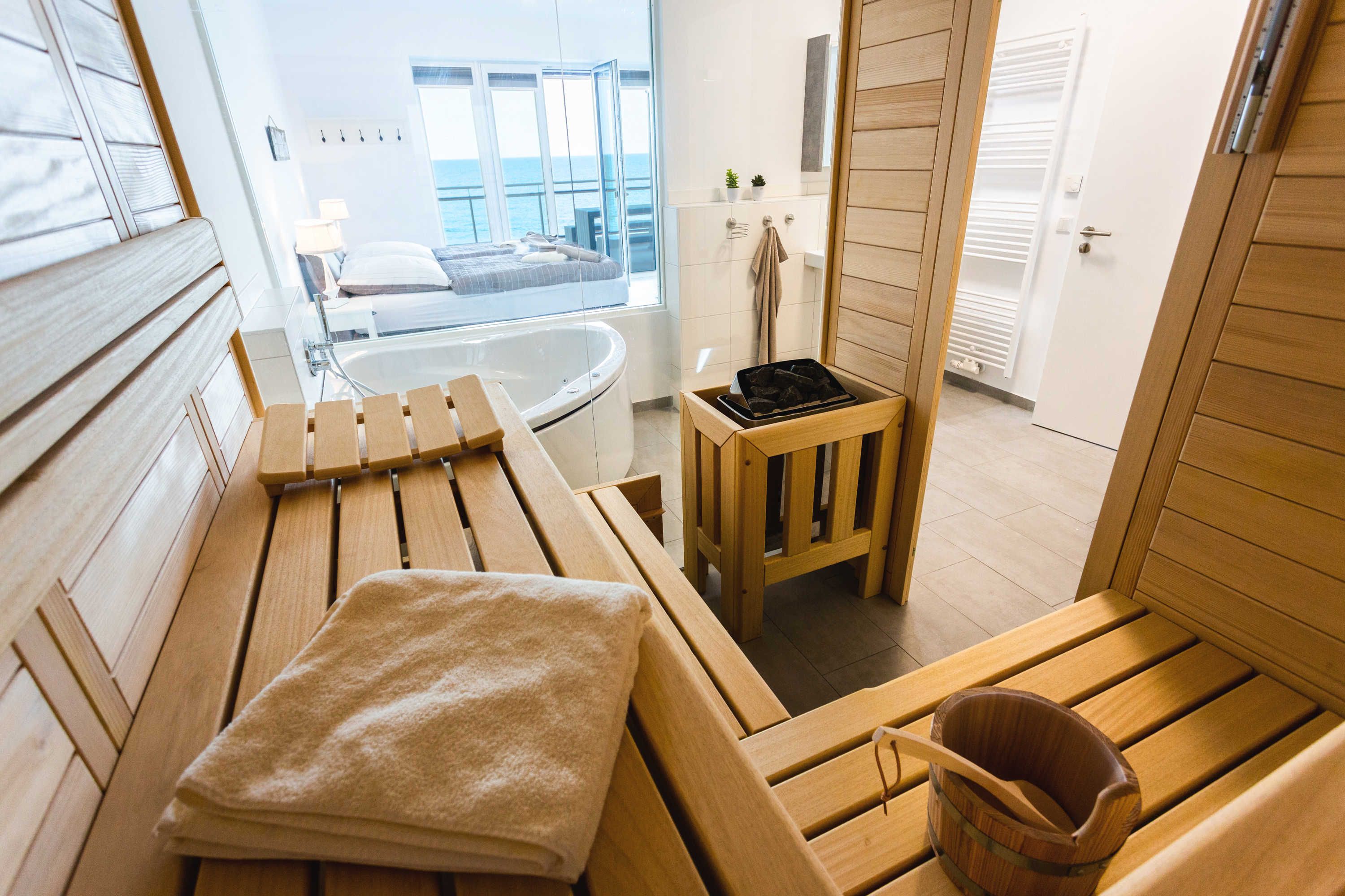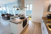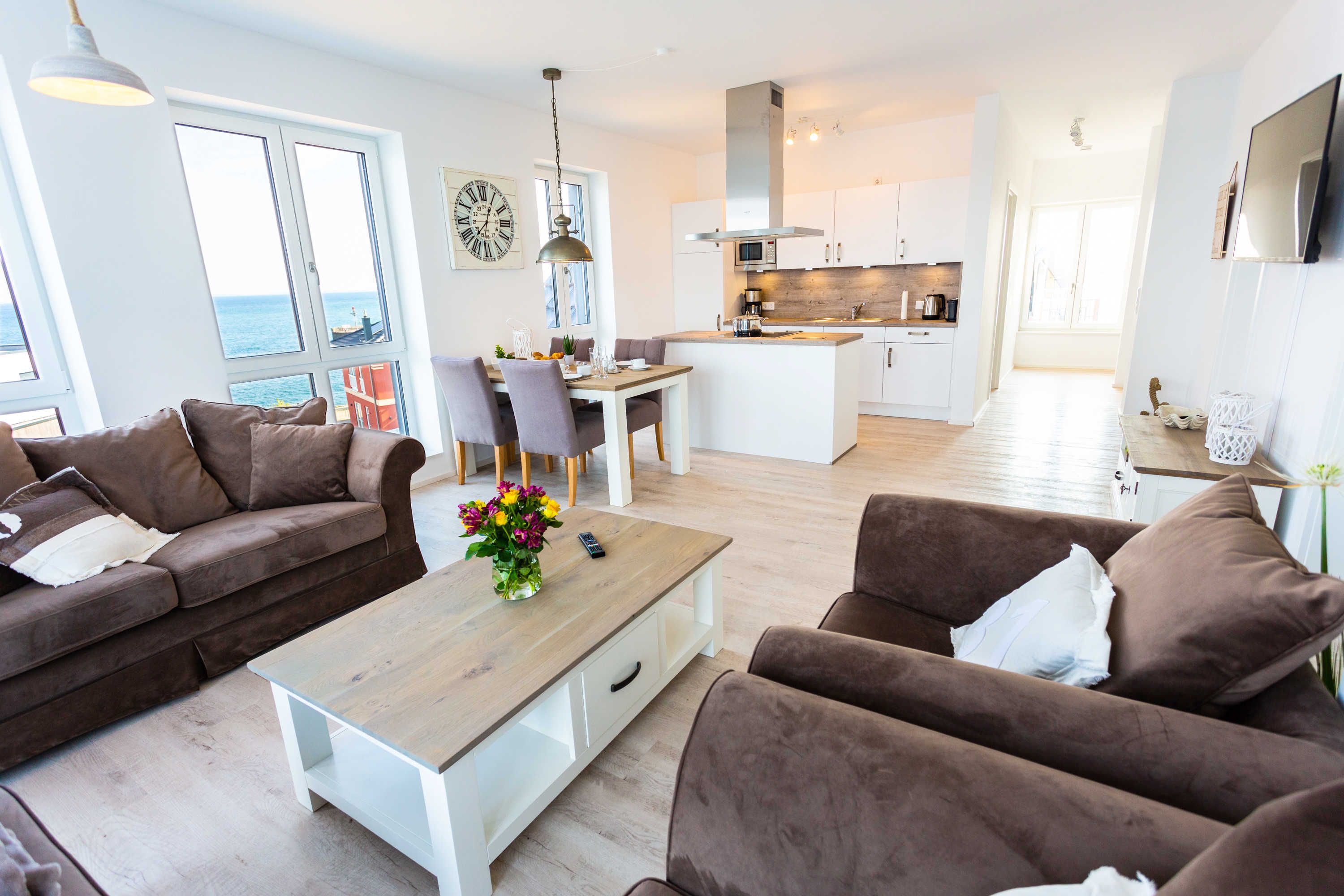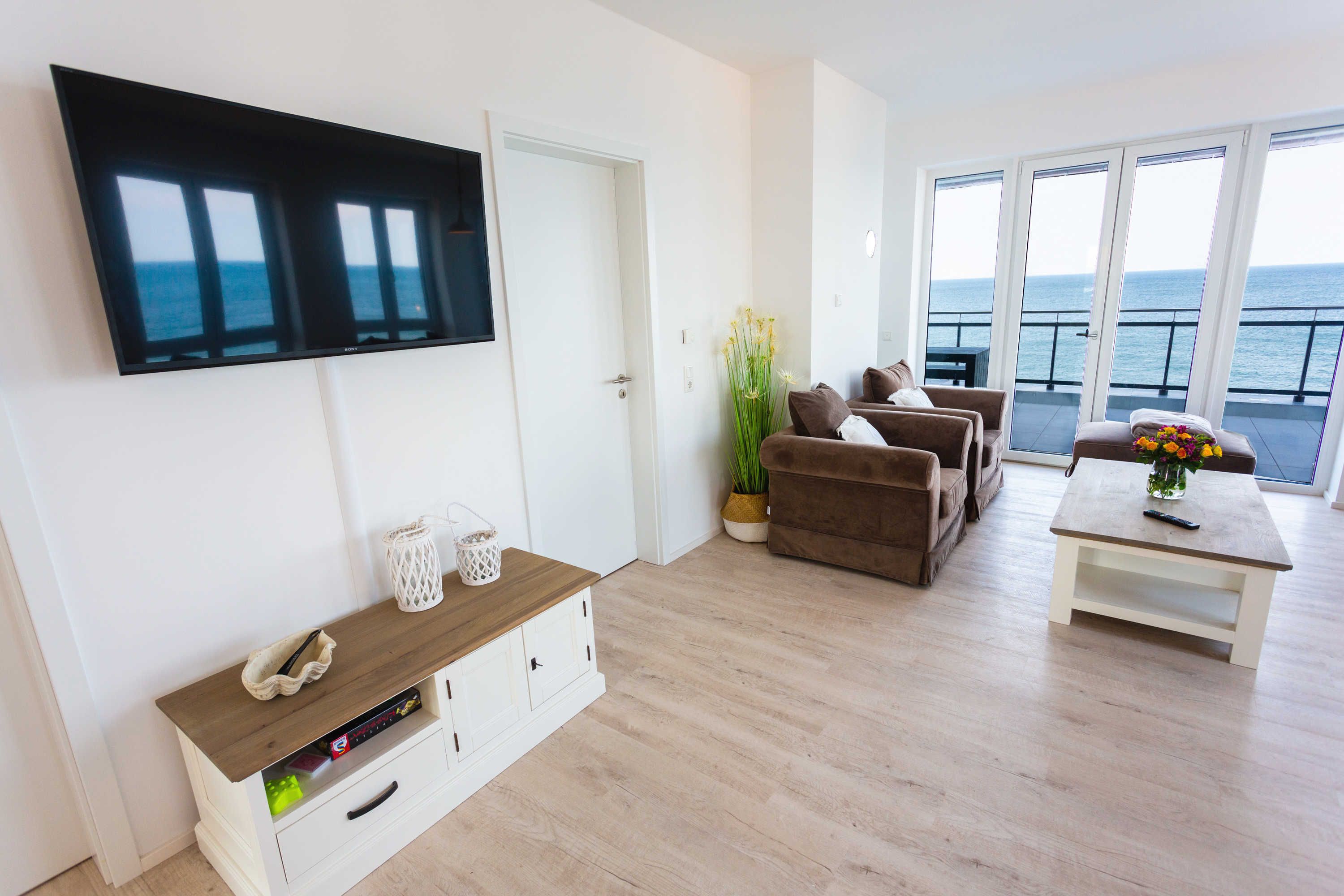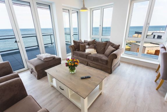 Ein geschmackvoll eingerichtetes Wohnzimmer mit einer kuscheligen Couchgarnitur bietet Ihnen einen traumhaften, direkten und wohl einzigartigen Meerblick. Es schließt sich eine sehr große Dachterrasse an, auf dem sich der atemberaubende Blick auf die Ostsee im Freien genießen lässt. Zu der komplett ausgestatteten Küche gehören der einladende Esstisch samt gemütlicher Bestuhlung, ein Kühlschrank mit Gefrierfach, ein Backofen, eine Mikrowelle, ein Geschirrspüler und selbstverständlich weitere Küchenutensilien. Zwei gemütliche Schlafzimmer - davon eins mit Meerblick - sind mit jeweils einem Boxspring-Doppelbett eingerichtet. Des Weiteren gehören ein Duschbad sowie ein weiteres Bad mit eigener Sauna, aus der Sie ebenfalls freien Blick auf die Ostsee haben, und Badewanne zur Ferienwohnung.