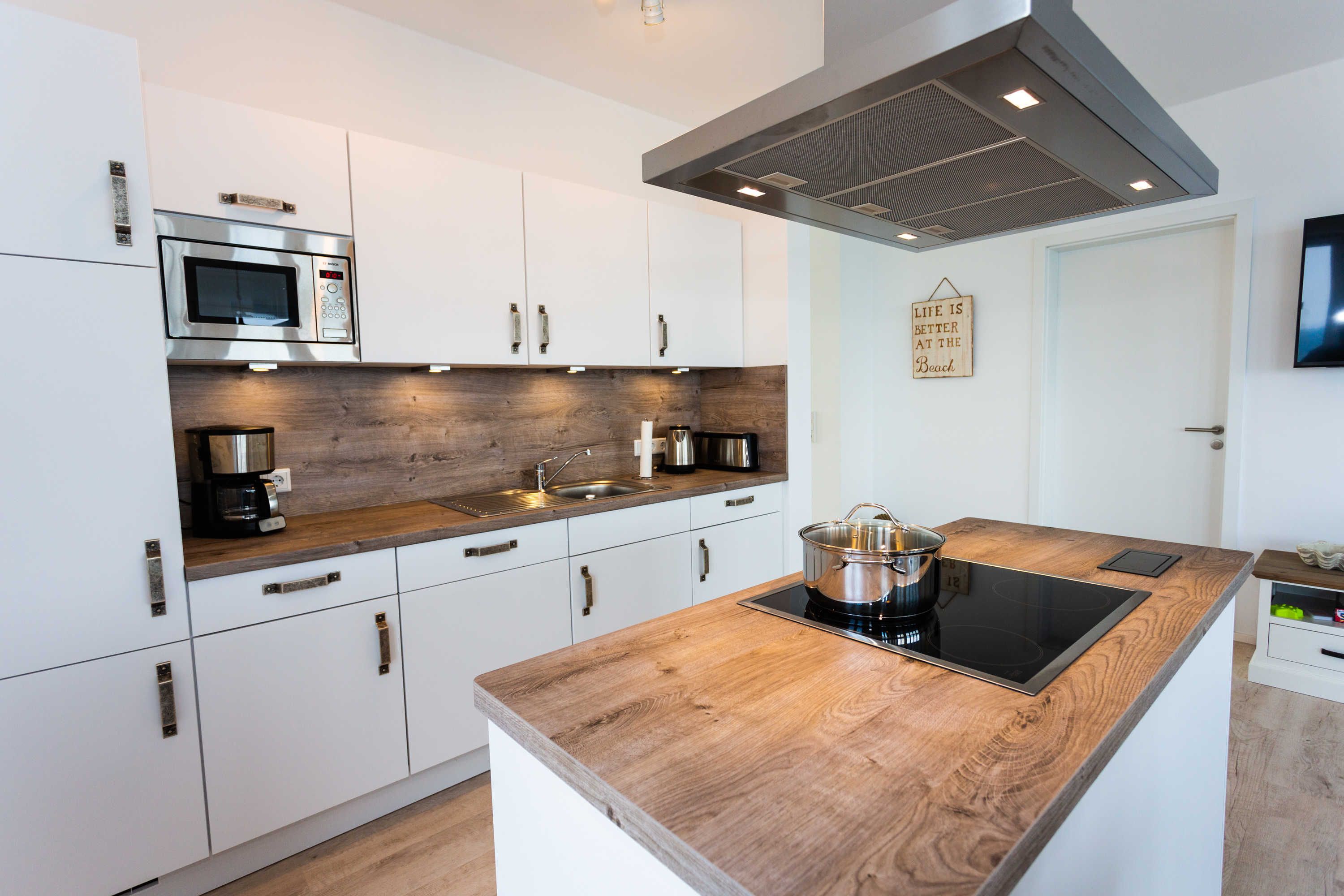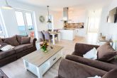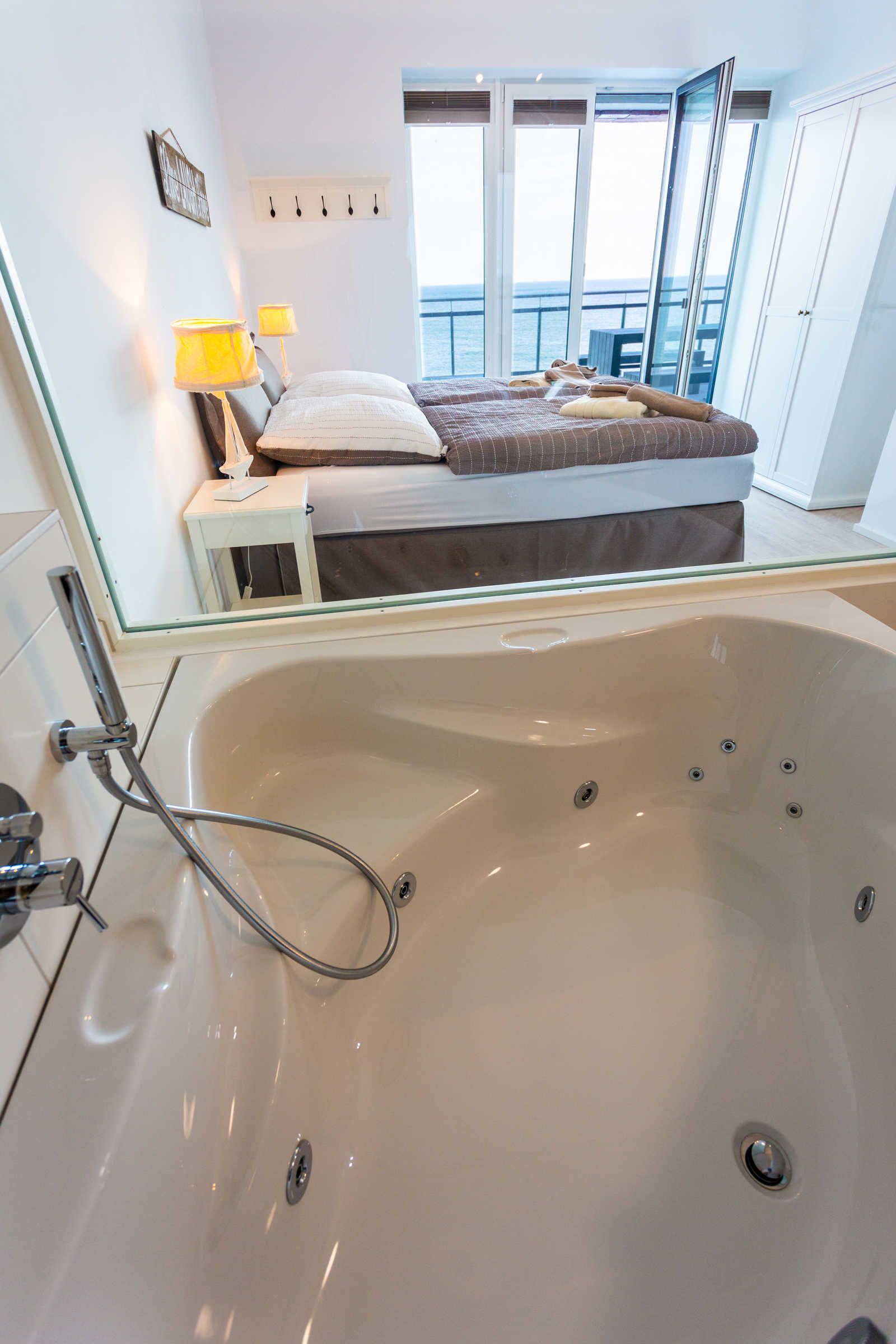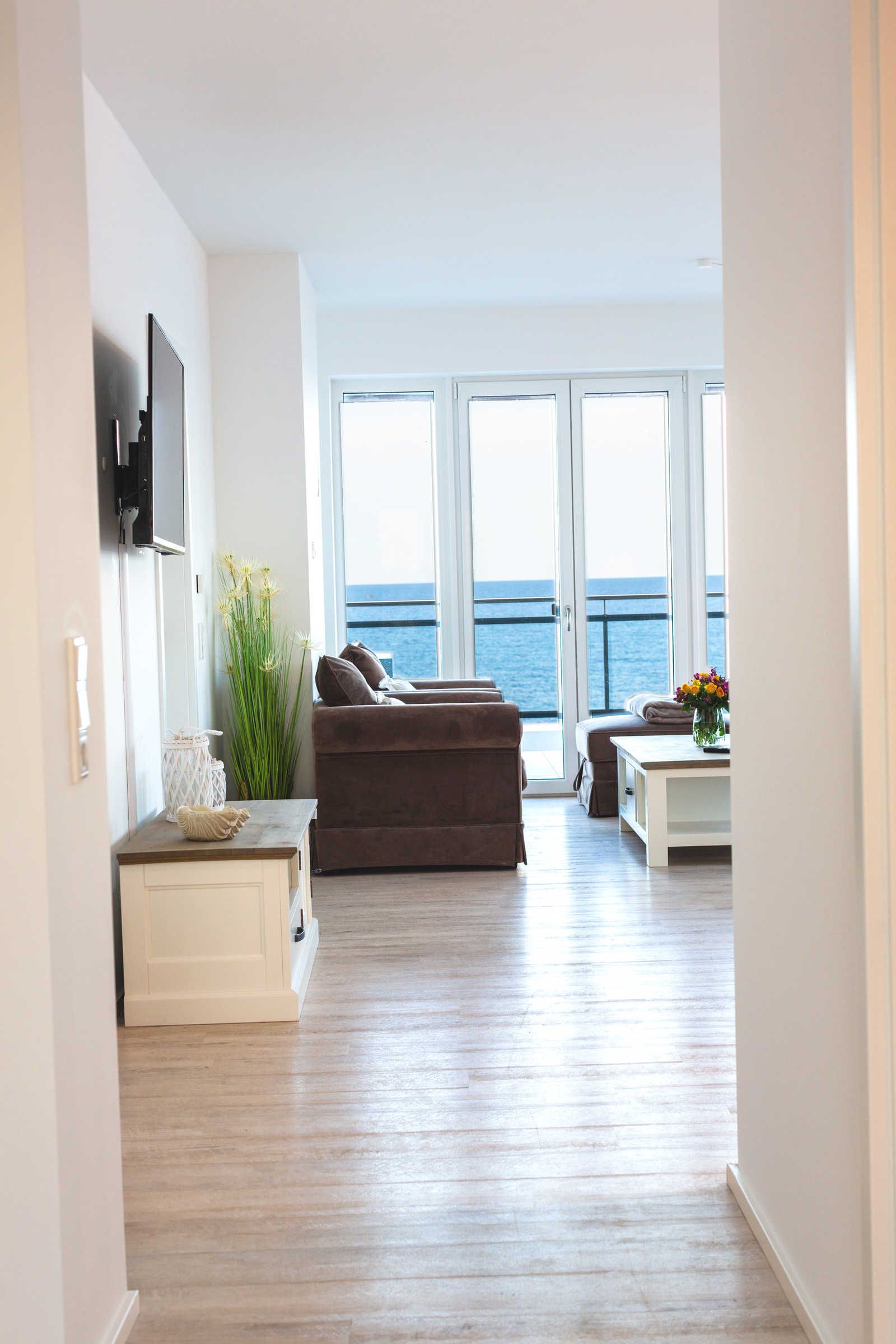 Ein geschmackvoll eingerichtetes Wohnzimmer mit einer kuscheligen Couchgarnitur bietet Ihnen einen traumhaften, direkten und wohl einzigartigen Meerblick. Es schließt sich eine sehr große Dachterrasse an, auf dem sich der atemberaubende Blick auf die Ostsee im Freien genießen lässt. Zu der komplett ausgestatteten Küche gehören der einladende Esstisch samt gemütlicher Bestuhlung, ein Kühlschrank mit Gefrierfach, ein Backofen, eine Mikrowelle, ein Geschirrspüler und selbstverständlich weitere Küchenutensilien. Zwei gemütliche Schlafzimmer - davon eins mit Meerblick - sind mit jeweils einem Boxspring-Doppelbett eingerichtet. Des Weiteren gehören ein Duschbad sowie ein weiteres Bad mit eigener Sauna, aus der Sie ebenfalls freien Blick auf die Ostsee haben, und Badewanne zur Ferienwohnung.
