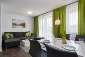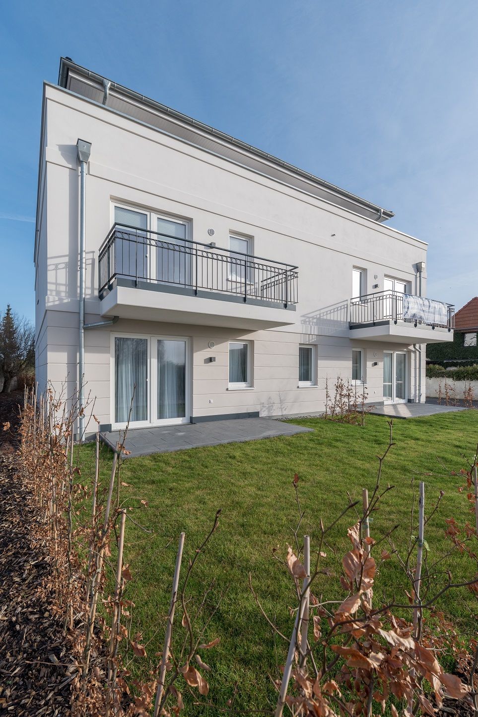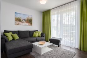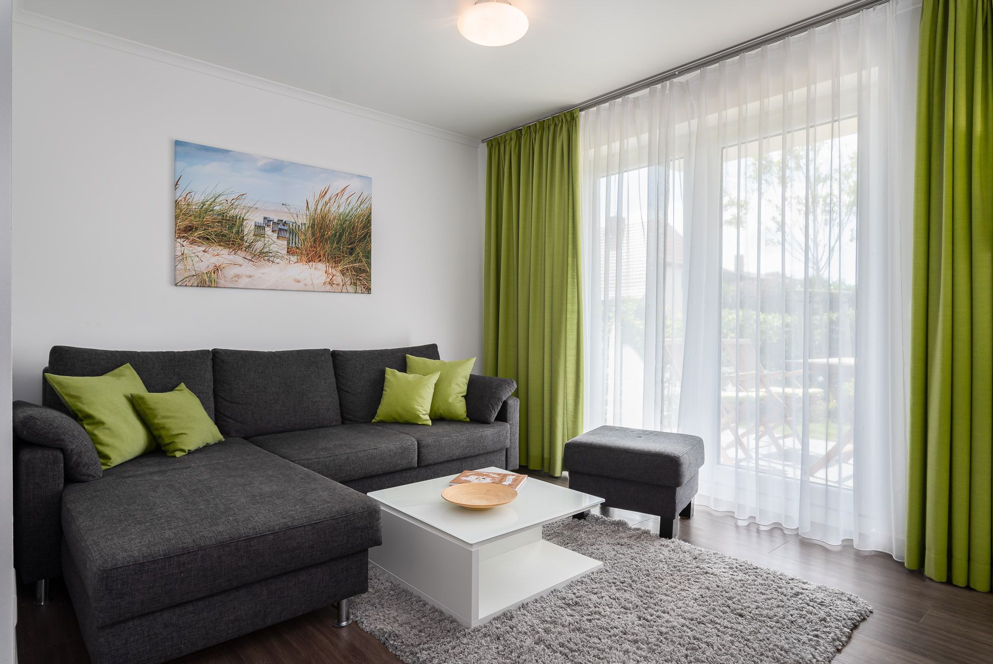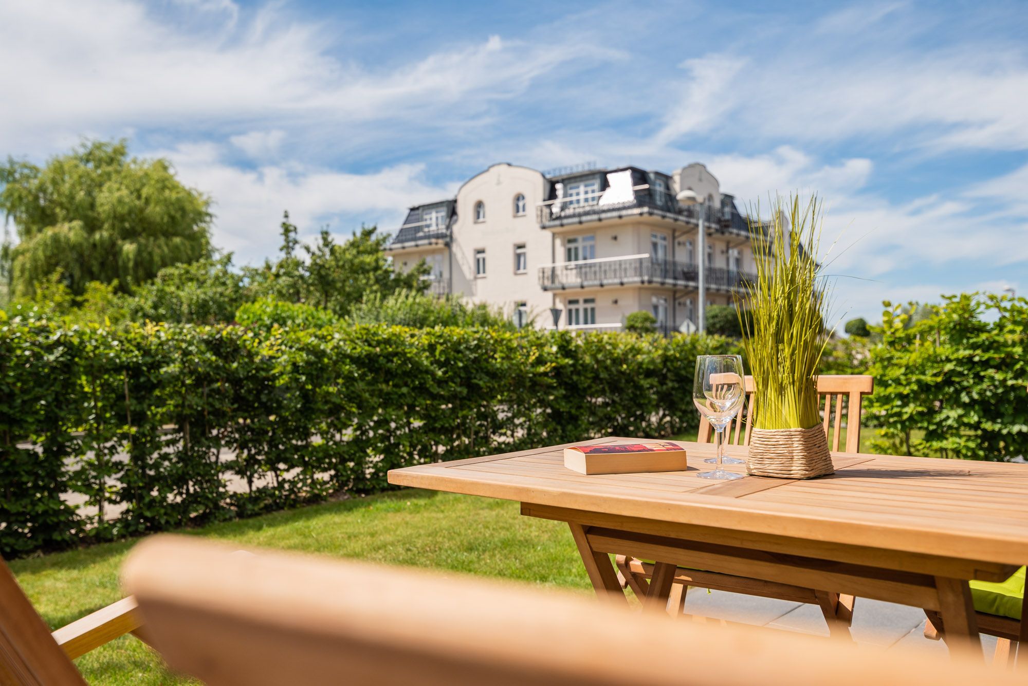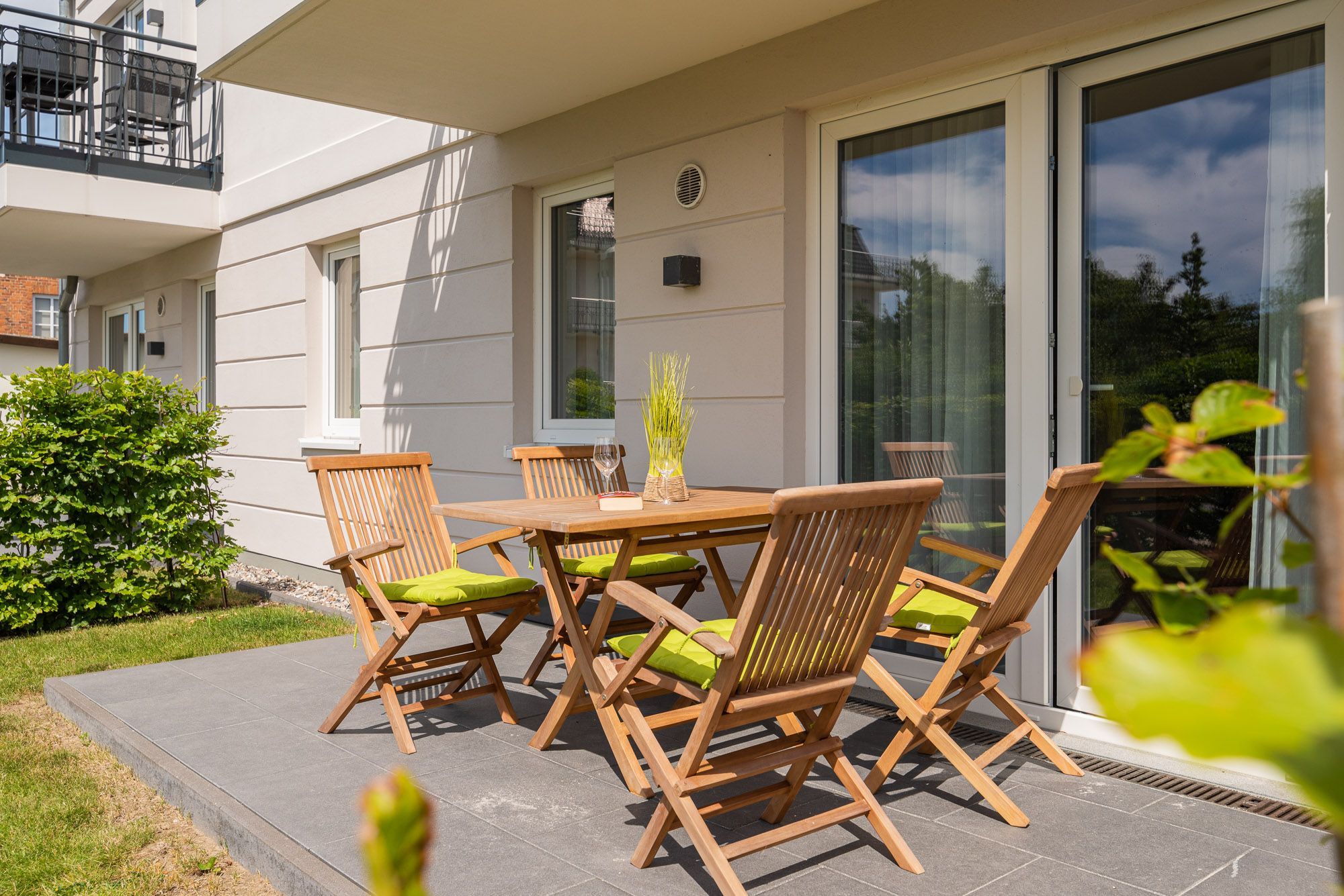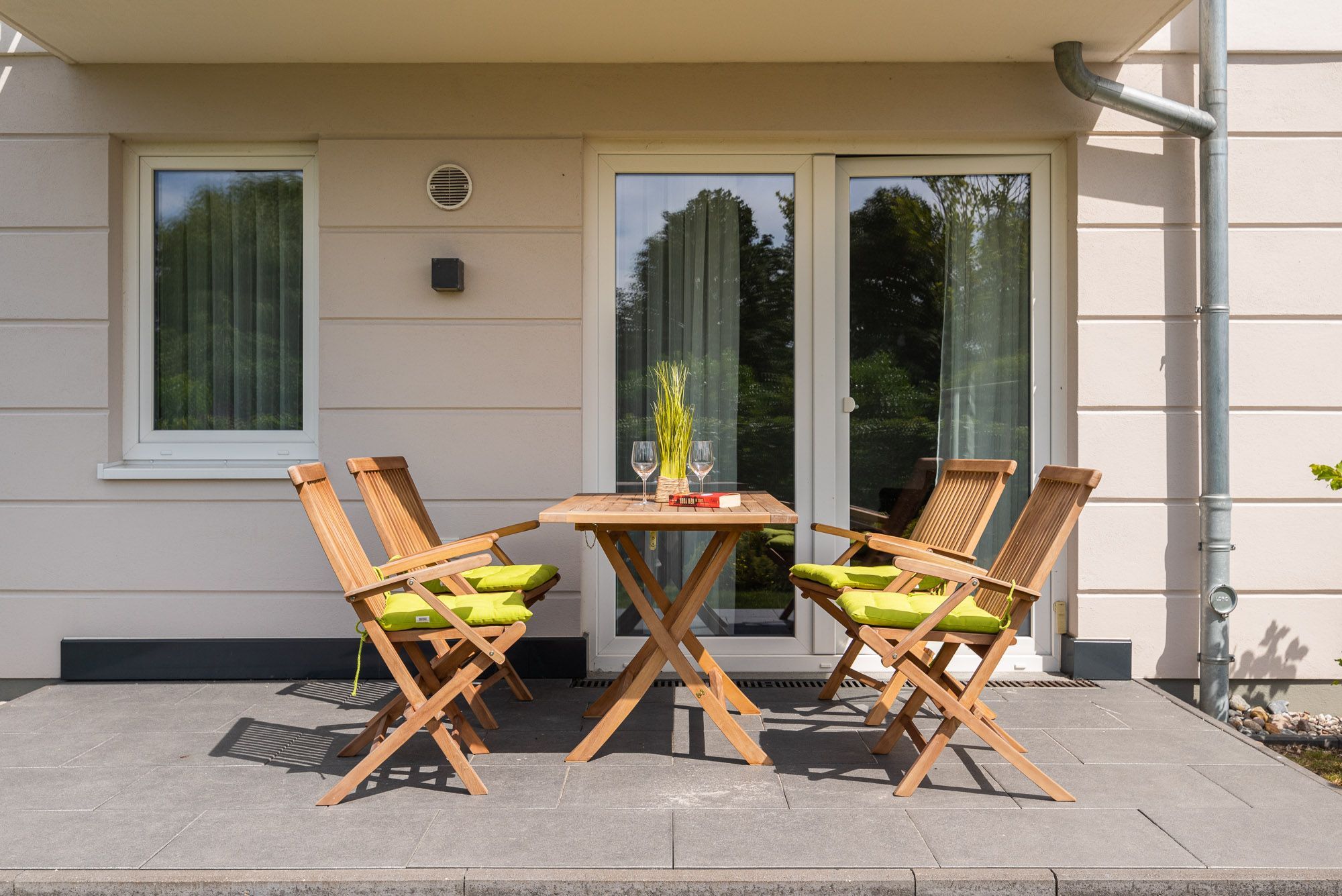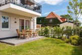 Die im Erdgeschoss gelegene Wohnung befindet sich in Strandnähe (100 m) und besitzt eine nach Südwesten ausgerichtete Terrasse mit Sonne bis spät am Abend. Auf dem Sitzbereich mit angrenzender großer Rasenfläche stehen moderne Gartenmöbel zum Essen und Relaxen für 4 Personen zur Verfügung.