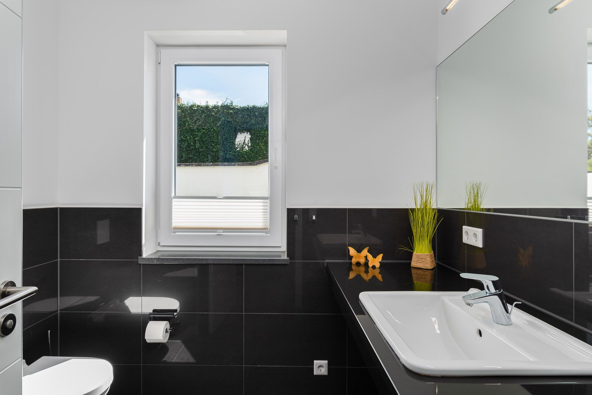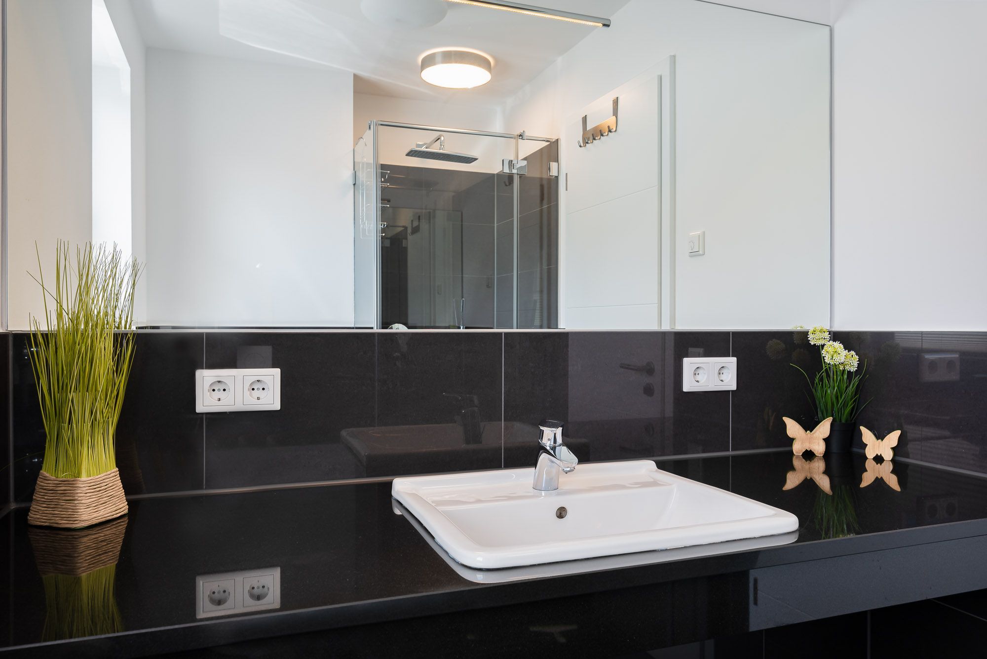 Das Bad mit Fenster ist mit einer ebenerdigen Regenwalddusche, einem beleuchten großen Wandspiegel und Waschtisch ausgestattet. Weiterhin gibt es eine Abstellkammer.