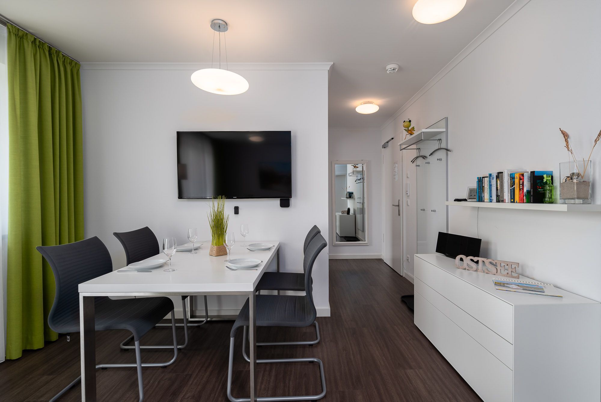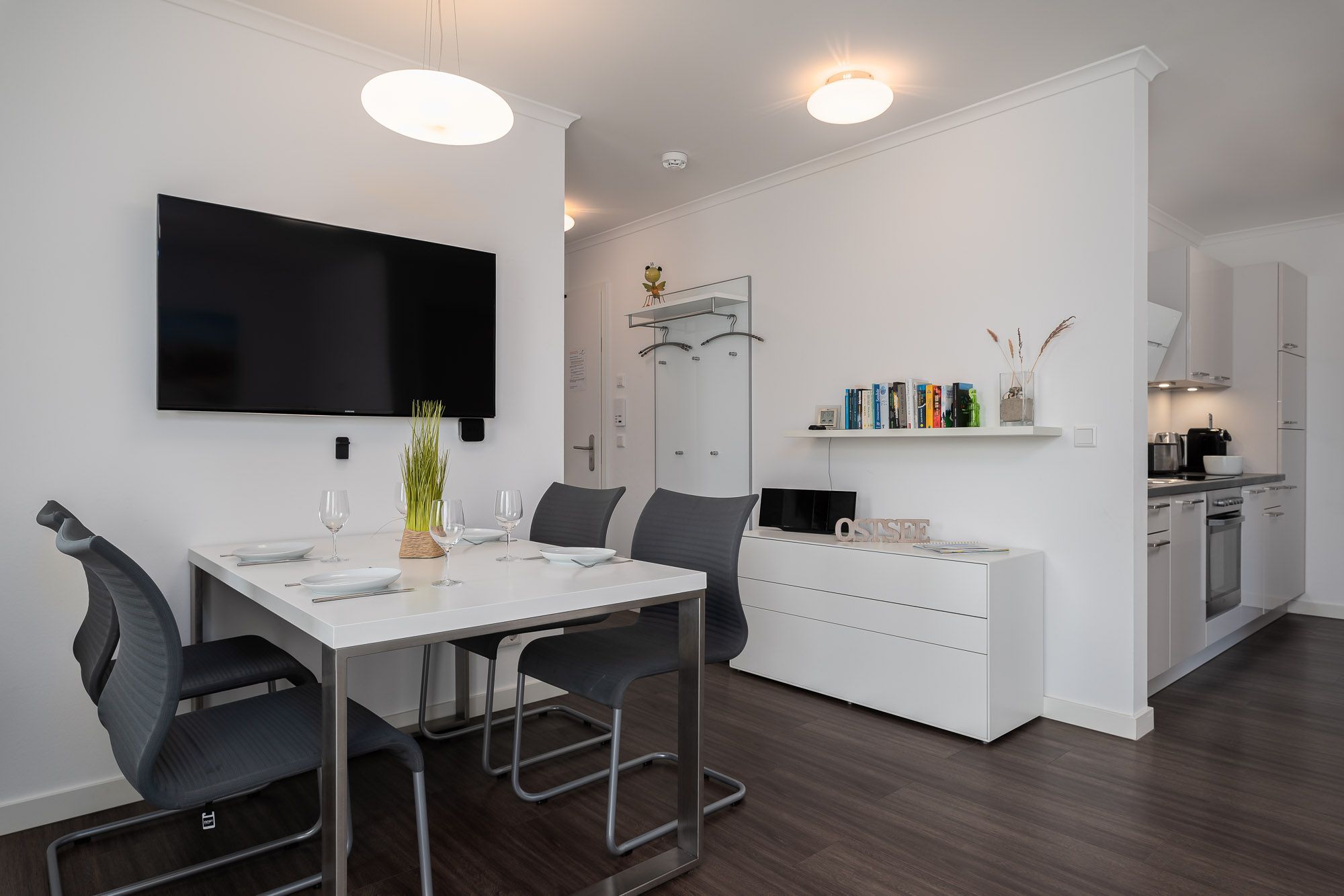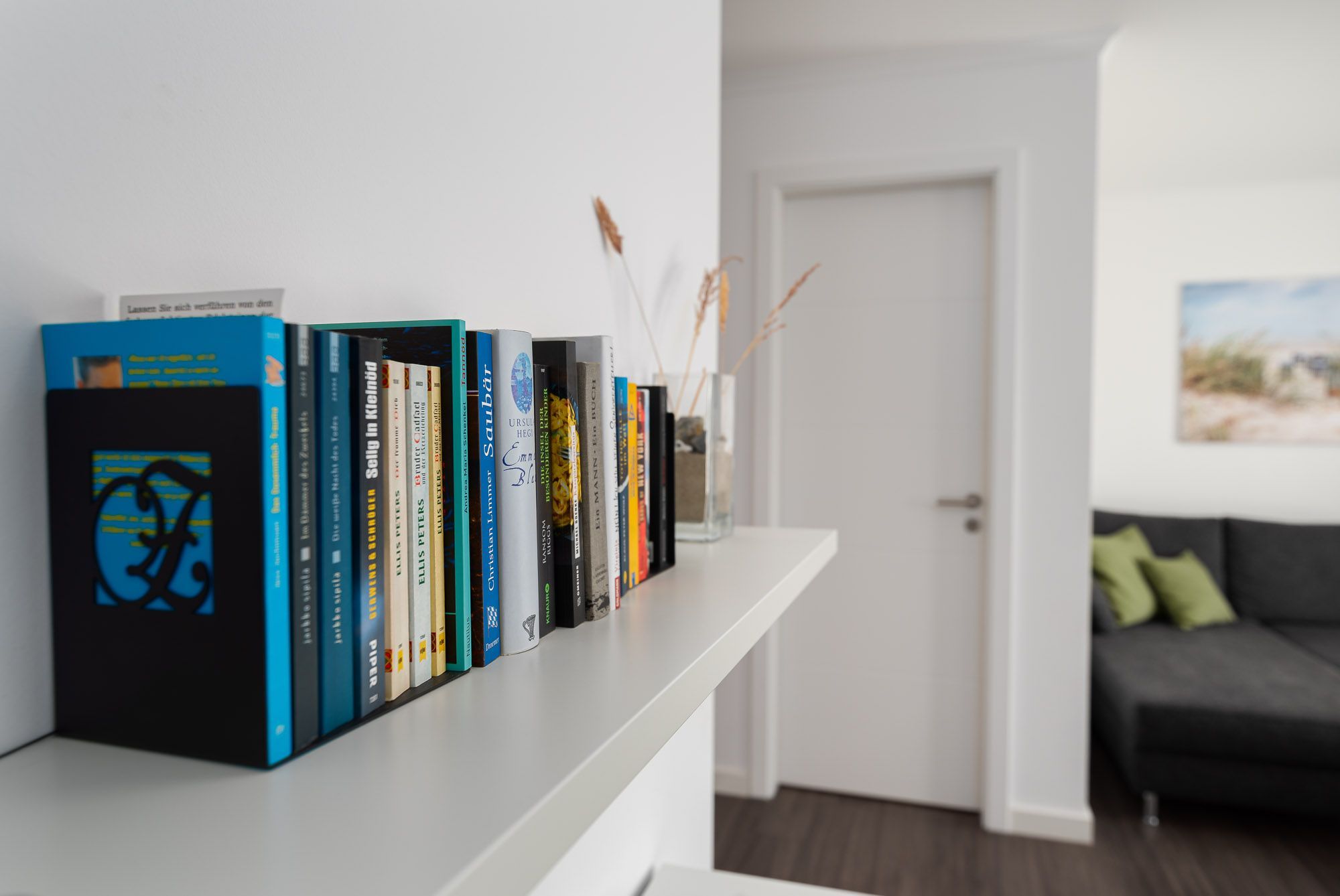 Die liebevoll eingerichtete Wohnung ist bestens ausgestattet. Sogar an Bücher und Spiele wurde gedacht. Der Küchenbereich verfügt über eine geräumige Kühl- und Gefrierkombination (160 l / 57 l). Eine Nespresso Maschine ist ebenso vorhanden wie ein Milchaufschäumer. Abgerundet wird die Küche neben einem Backofen und leisem Geschirrspüler durch ein Cerankochfeld mit passender Dunstabzugshaube. Zum Essen lädt Sie neben der Terrassenmöbelierung auch der große Esstisch im Wohnbereich (1,80 m x 1,00 m) ein. Dieser eignet sich hervorragend, um den Abend im Kreise der Familie mit Gesellschaftsspielen ausklingen zu lassen. Harmonisch abgestimmt wird der Wohnbereich durch eine hochwertige Eckcouch mit Hocker, so dass alle Urlaubsgäste unserer Ferienwohnung „Schilfgras“ einen gemütlichen Platz finden. Der 50“ Smart TV ist ferner mit Apple TV ausgestattet und bietet die Möglichkeit, Multimedia-Angebote aus dem Internet mittels Ihres Accounts oder iPhone /iPad zu nutzen. Via Screen Share können Multimedia PC Inhalte auf den TV projiziert werden. Zudem steht Ihnen eine Soundanlage mit CD-Player zur Verfügung, welche Sie auch per Bluetooth mit Ihrem Endgerät verbinden können.