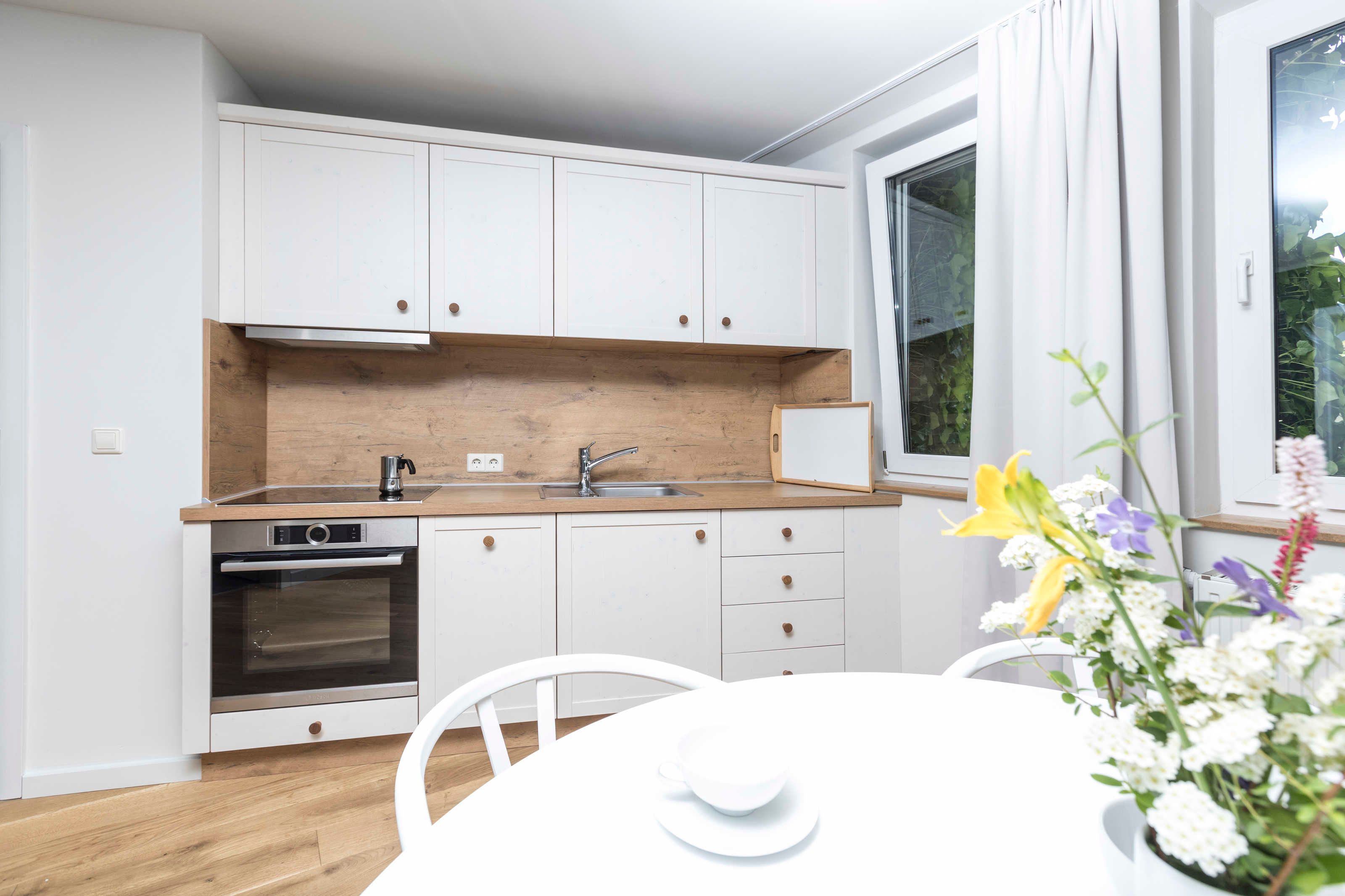 Ausstattung der Küche: 4-Zonen-Kochfeld, Backofen, Geschirrspüler, Filterkaffeemaschine, Wasserkocher, Toaster, Geschirr, Besteck, Pfannen und Töpfe.
