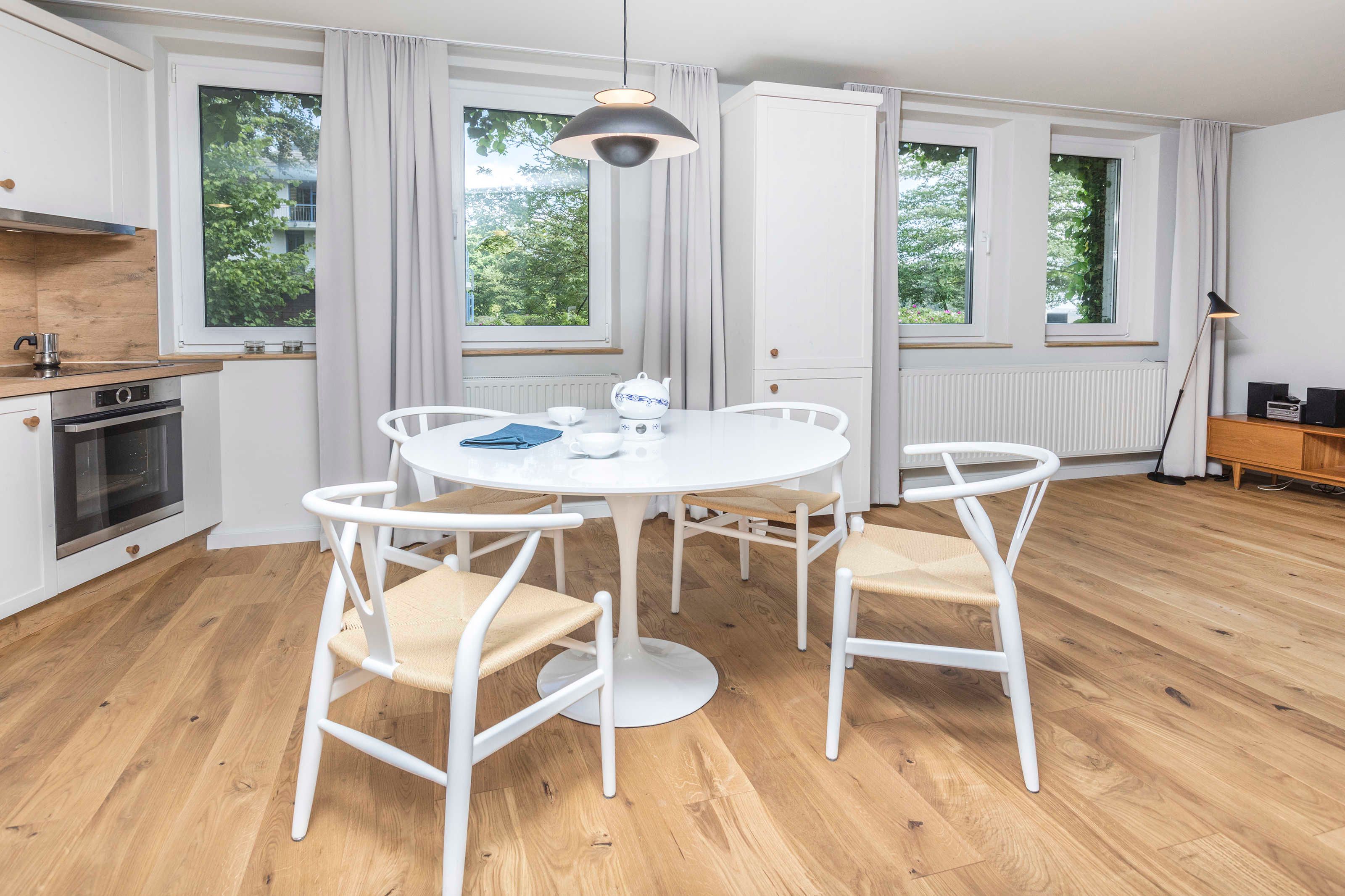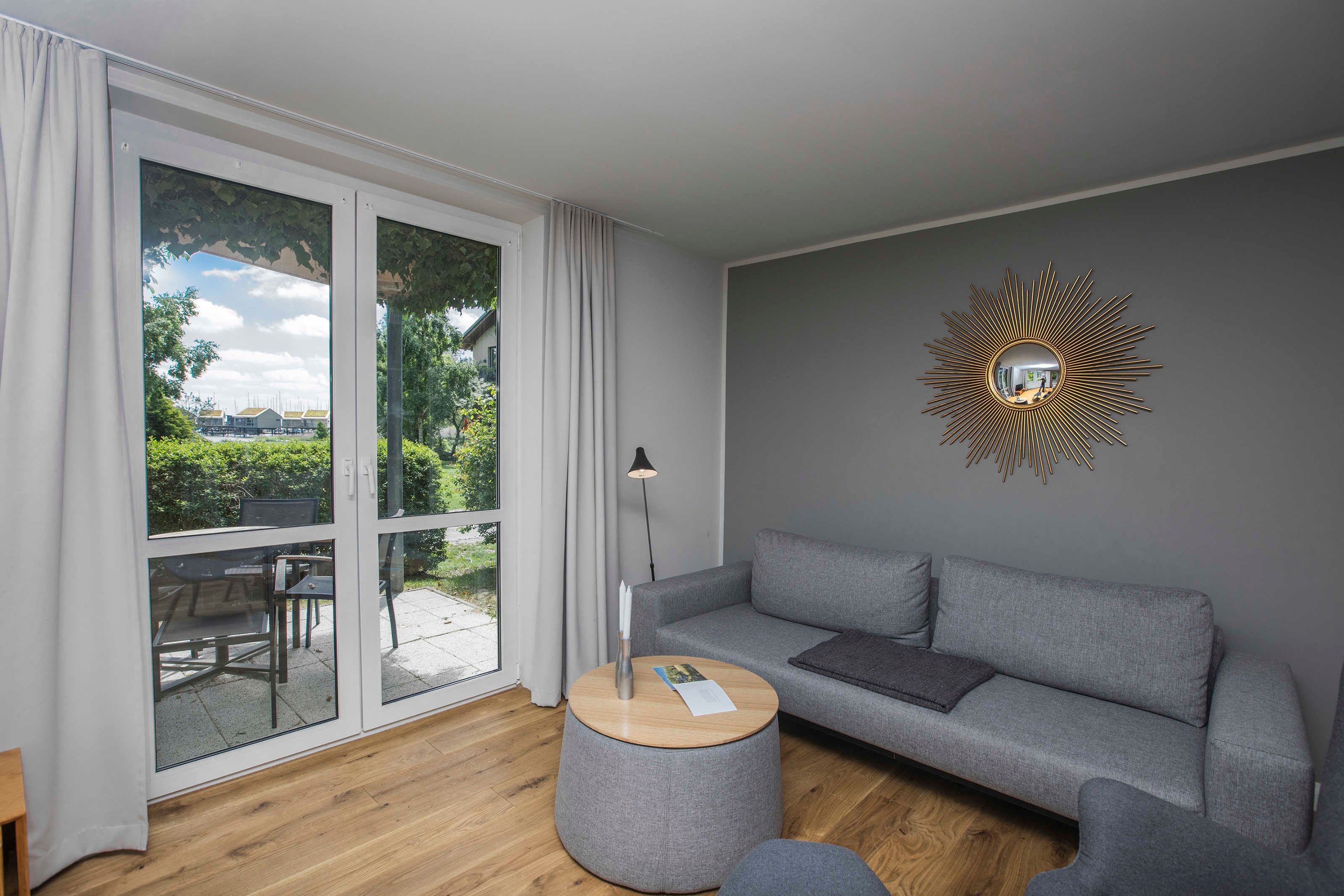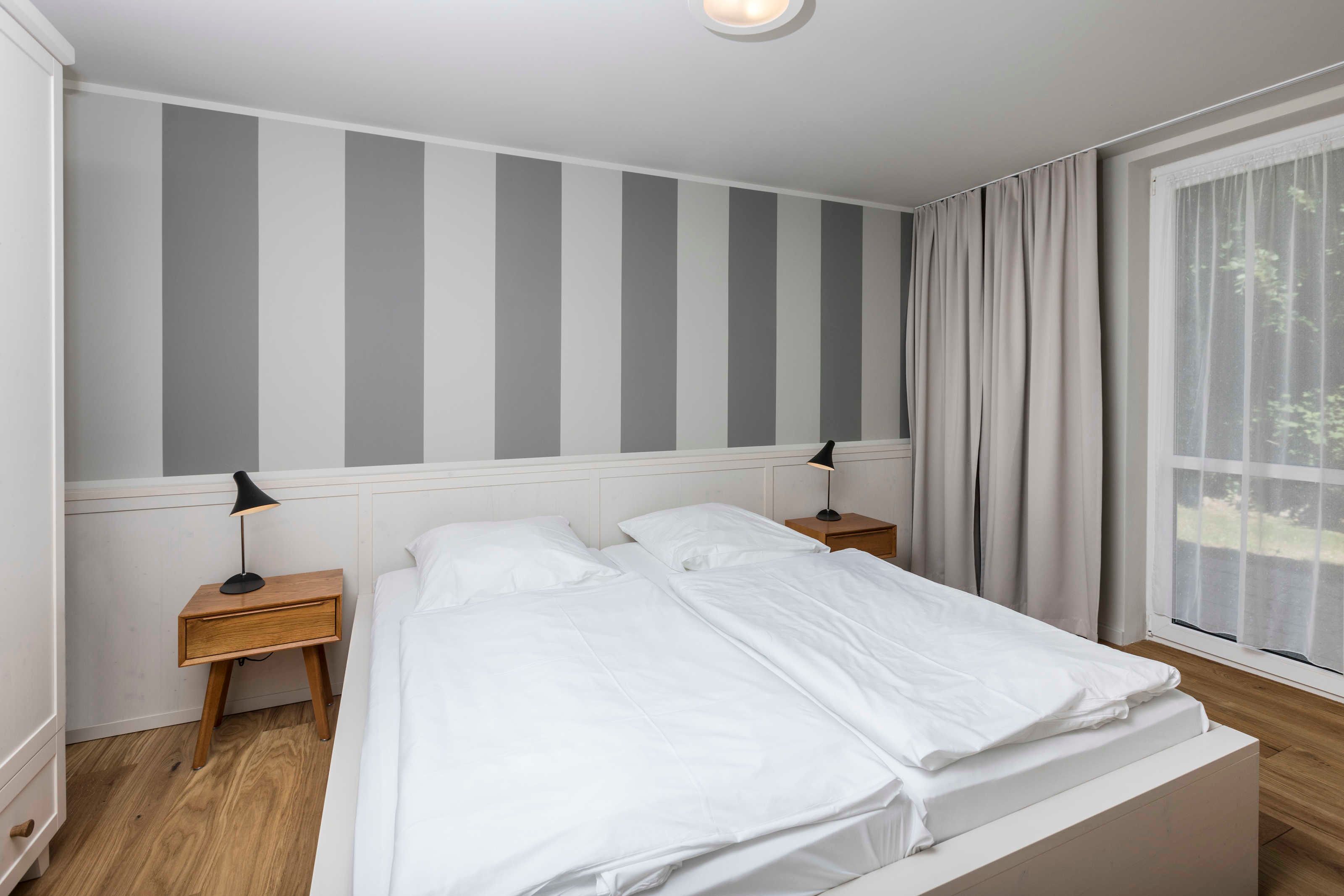Ein Schlafraum mit Doppelbett und ein Wohnraum mit Aufbettung für zwei Personen (Schlafcouch), Küchenzeile, SAT-TV, Musikanlage, Bad mit WC und Dusche, Balkon oder Terrasse.