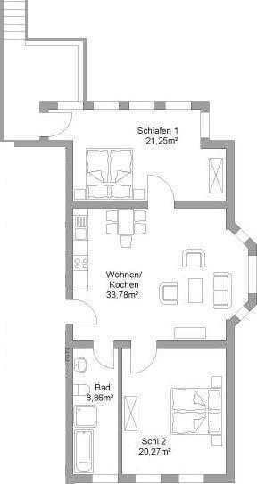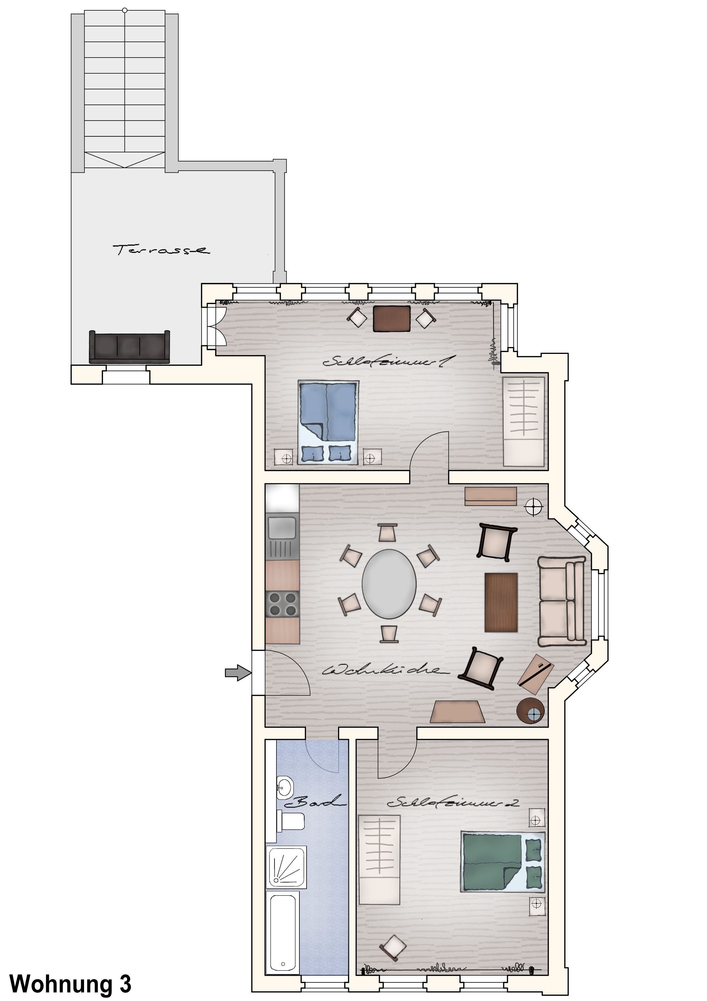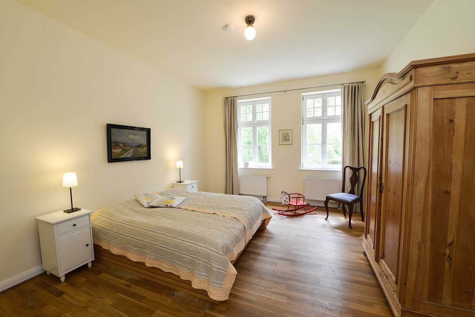 Die Ferienwohnung 3 des Gutshauses befindet sich im ersten Obergeschoss. Die Wohnung für bis zu vier Personen und in einer Größe von 92 m² ist hochwertig eingerichtet und besteht aus drei Zimmern: Ein großes Wohnzimmer mit offener Küche (hochwertige Siemens-Geräte) und schönem Blick auf den Garten, das Wasser und den Badesteg, zwei großzügige Schlafzimmer mit jeweils einem Doppelbett und ein Badezimmer mit Badewanne und Dusche. Die Böden der Ferienwohnung bestehen aus Eichen-Parkett. Aus dem nördlich gelegenen Schlafzimmer führt eine Tür auf die große Terrasse, die einen sehr schönen Blick auf den Garten und das Wasser bietet und über eigene Gartenmöbel aus Teak-Holz verfügt.