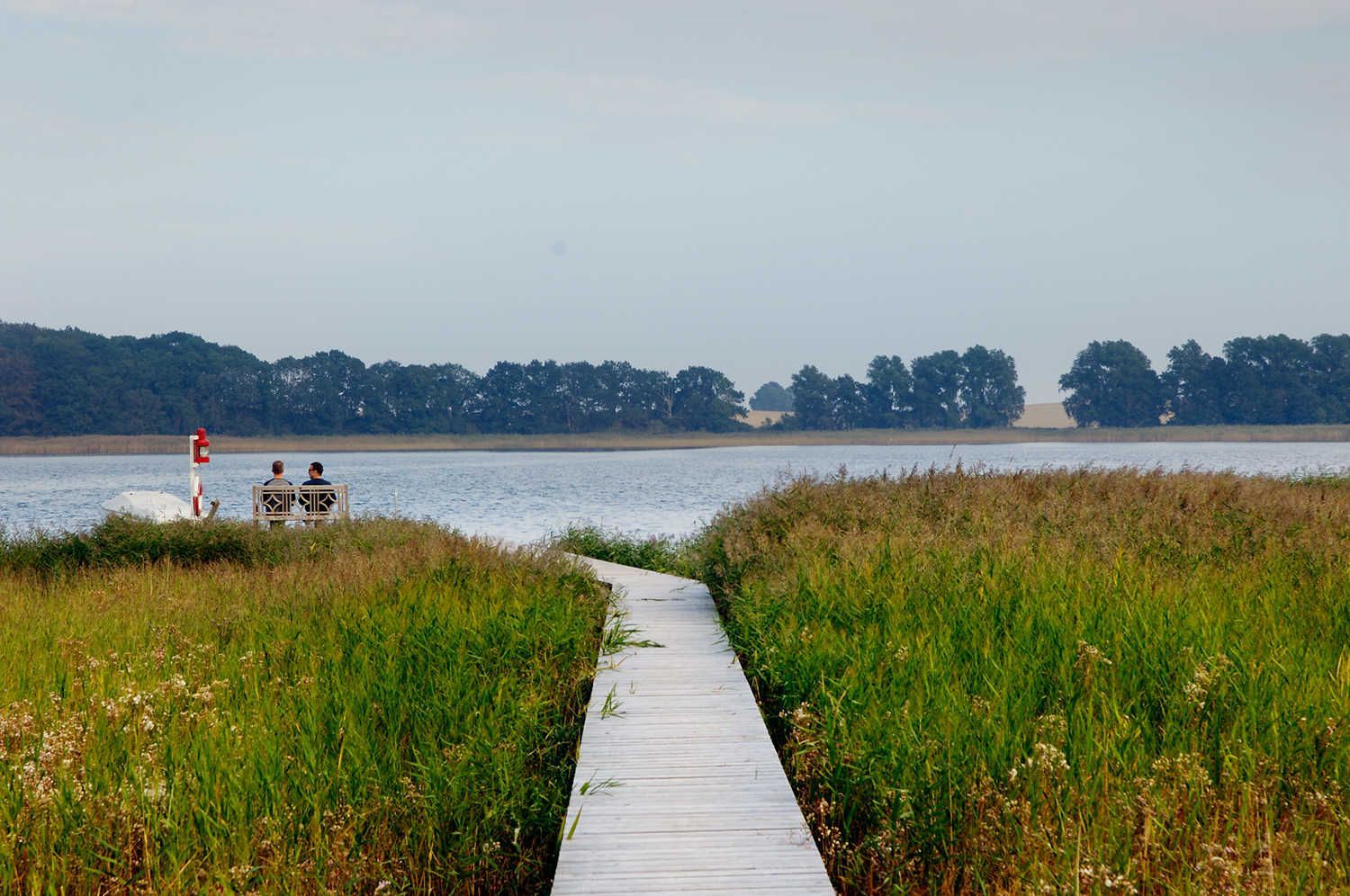 Der große Garten bietet den Ruhesuchenden und den Aktiven gleichermaßen einen perfekten Raum für vielseitige Aktivitäten: Verschiedene abgeschlossene Bereiche mit Liegestühlen und Tischen, eine große Aussichtsterrasse am Schilfgürtel, der Badesteg, der Grillbereich sowie eine Kinderspielecke mit Sandkiste, zwei Schaukeln und Fußballtoren stehen unseren Gästen zur freien Verfügung.