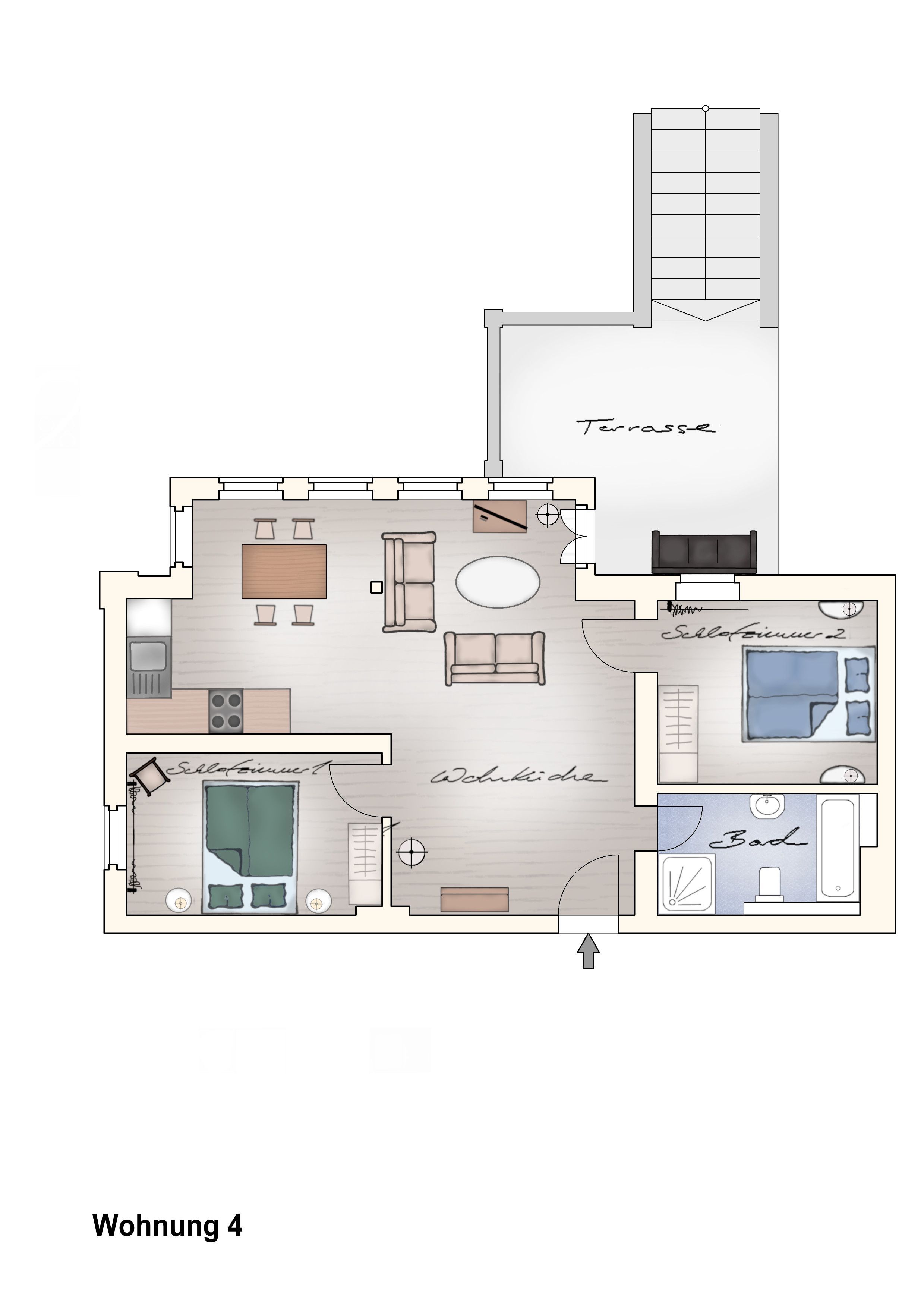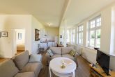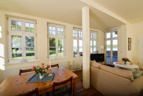 Die Ferienwohnung Nr. 4 befindet sich im ersten Obergeschoss des Gutshauses. Die Wohnung für bis zu vier Personen und in einer Größe von 72 m² ist mit Liebe zum Detail eingerichtet und besteht aus drei Zimmern: Ein großes Wohnzimmer mit offener Küche (hochwertige Siemens-Geräte) und schönem Blick auf den Garten und das Wasser, zwei Schlafzimmer mit jeweils einem Doppelbett und ein Badezimmer mit separater Badewanne und Dusche. Aus dem Wohnzimmer führt eine Tür auf die große Terrasse, die einen sehr schönen Blick auf den Garten und das Wasser bietet und über eigene Gartenmöbel aus Teak-Holz verfügt. Die Böden der Ferienwohnung bestehen aus Eichen-Parkett.